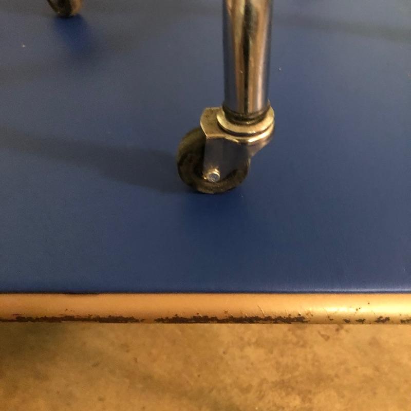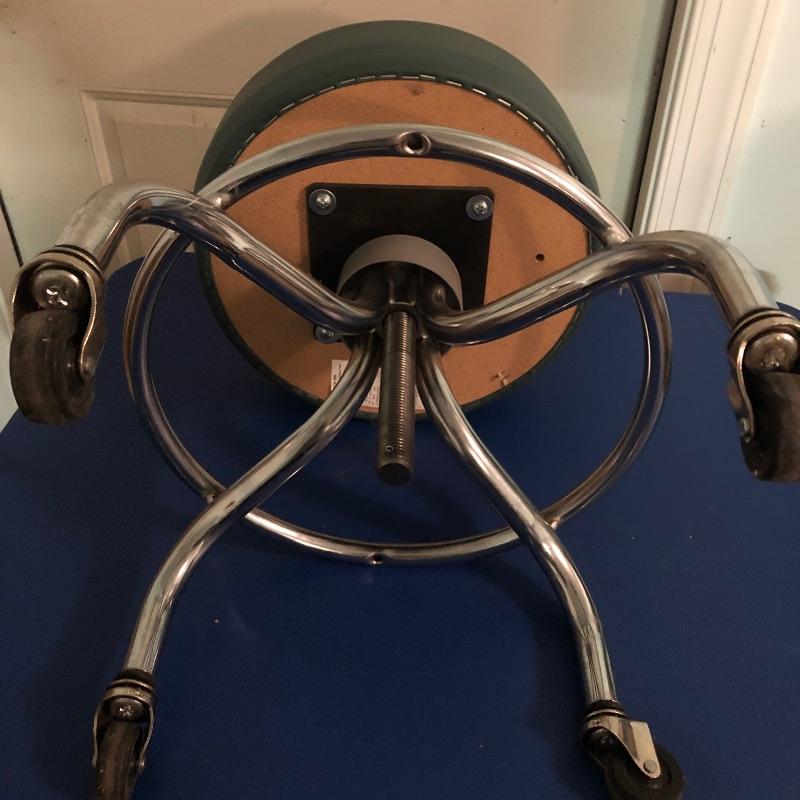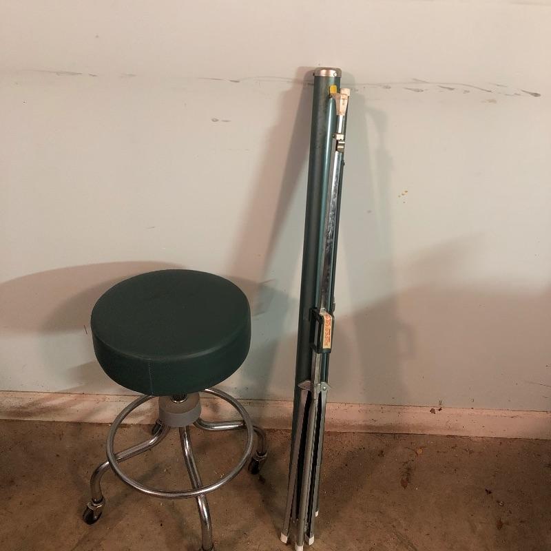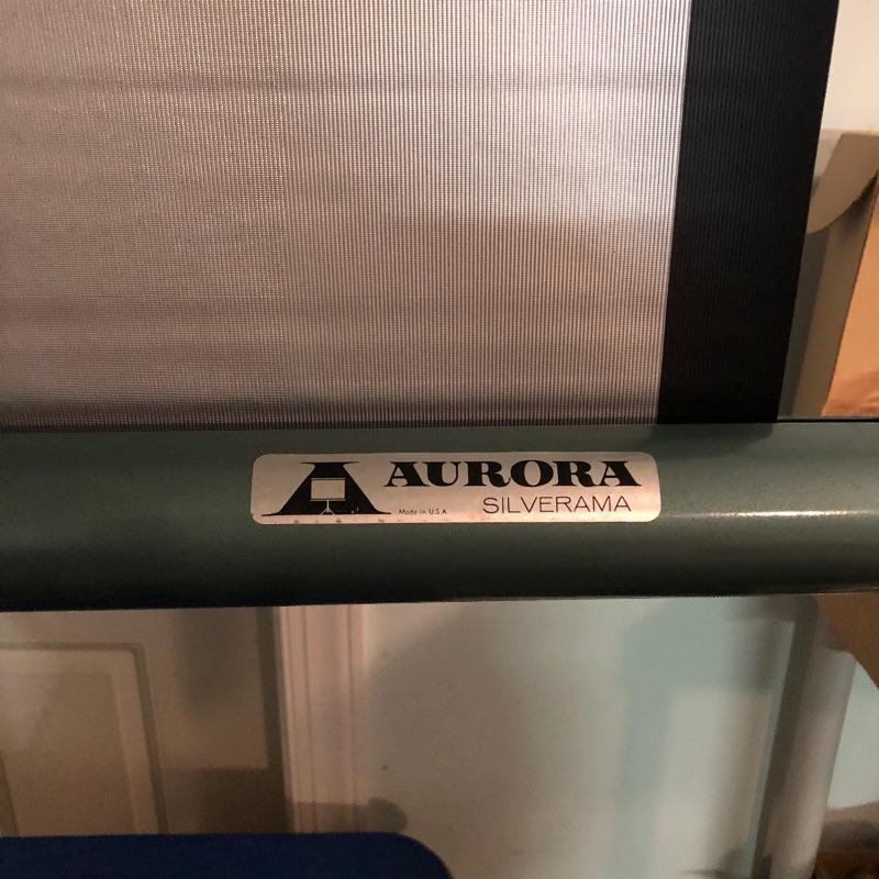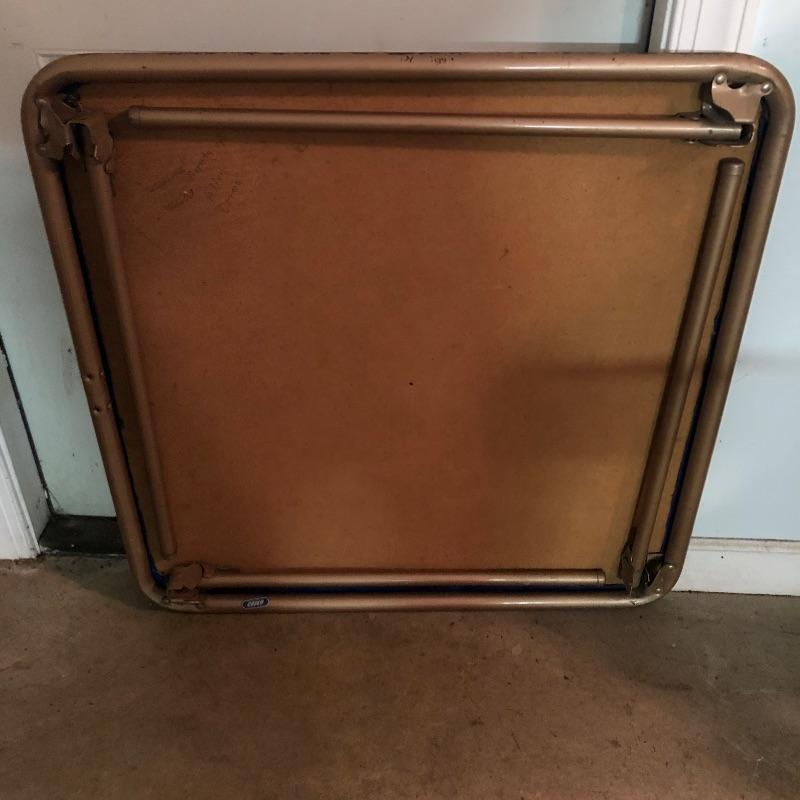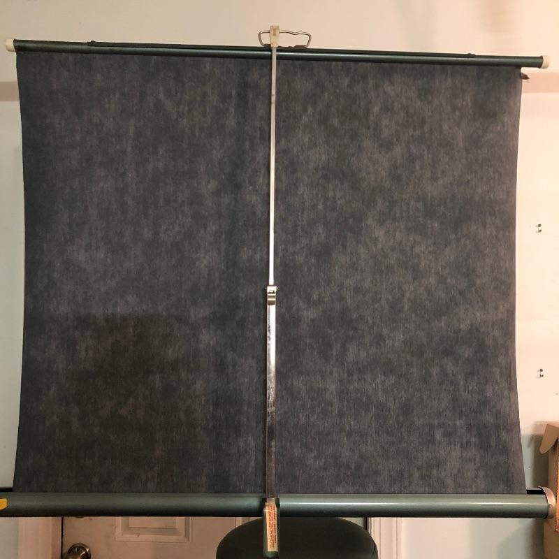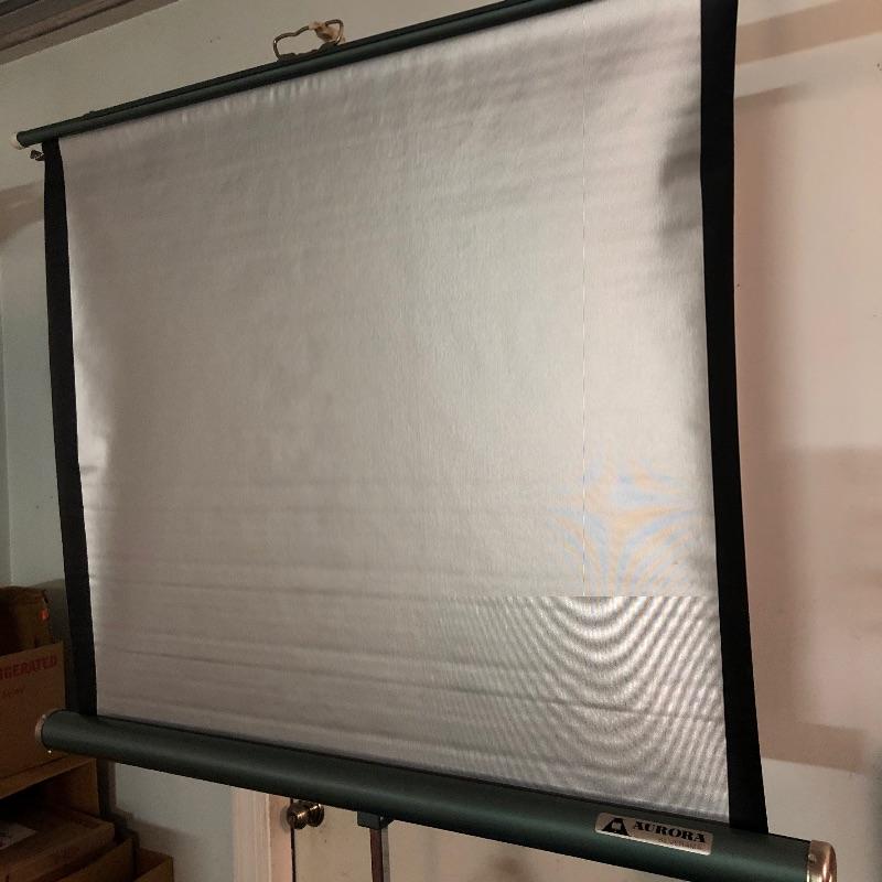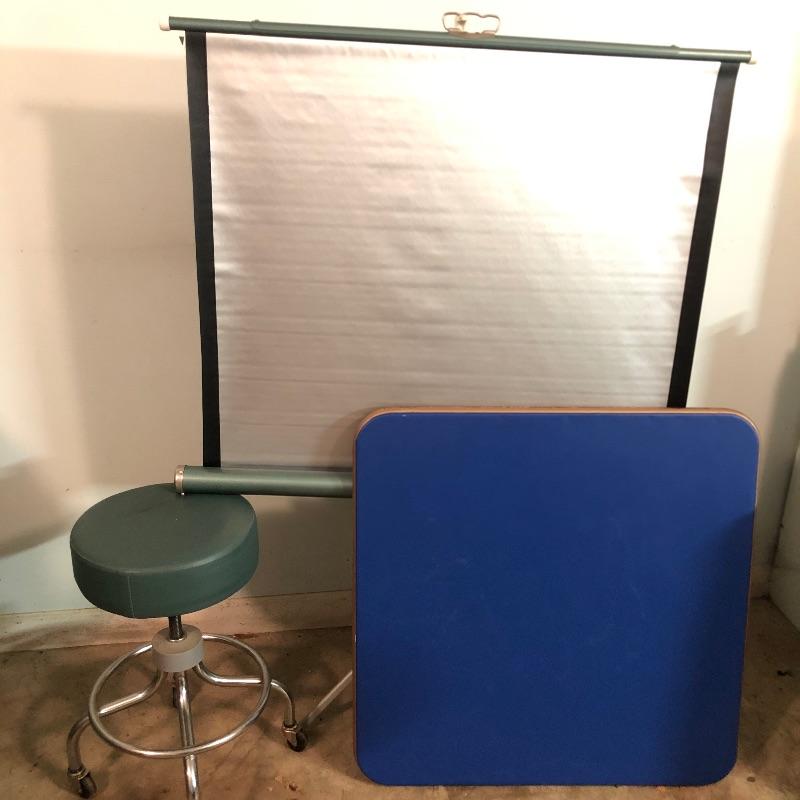 Sweet Aurora Silverama metal projector screen with Tripod folds into an easy to carry easy to store package. The padded stool with casters and wheels is super comfy and adjust in height for varied people and projects. Everyone needs a card table so having a bright blue top just makes it fun! This square table measures 33" x 33". Local pickup only.