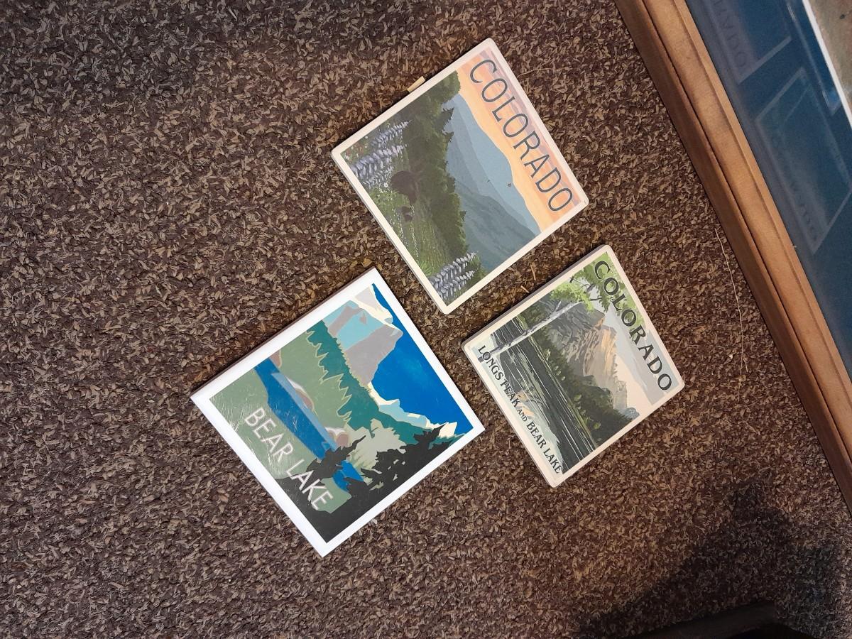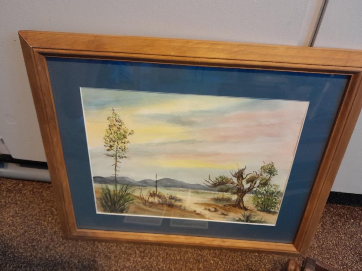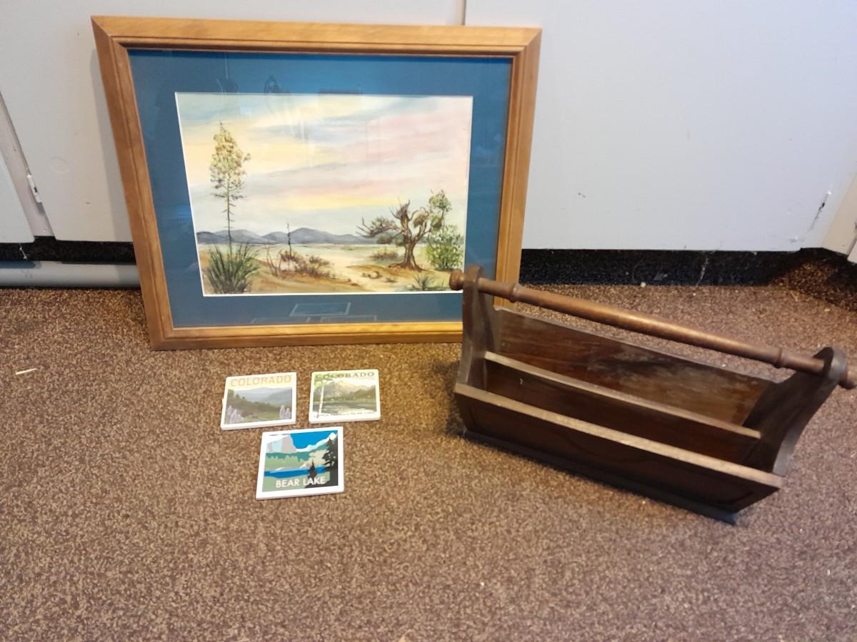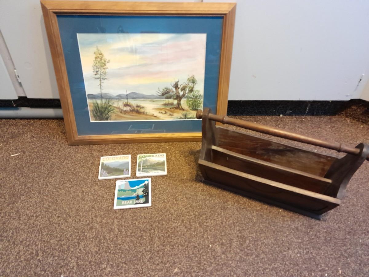FRAMED WATERCOLOR PICTURE, THREE TILE COASTERS AND WOOD MAGAZINE BOX 22.5" X 18.5"