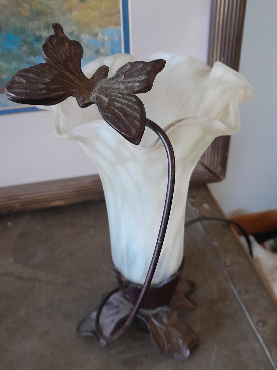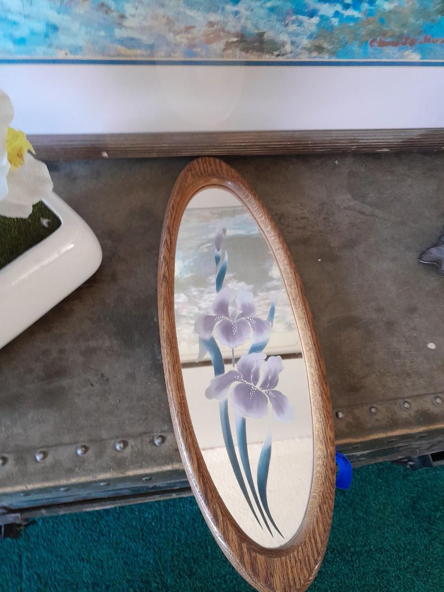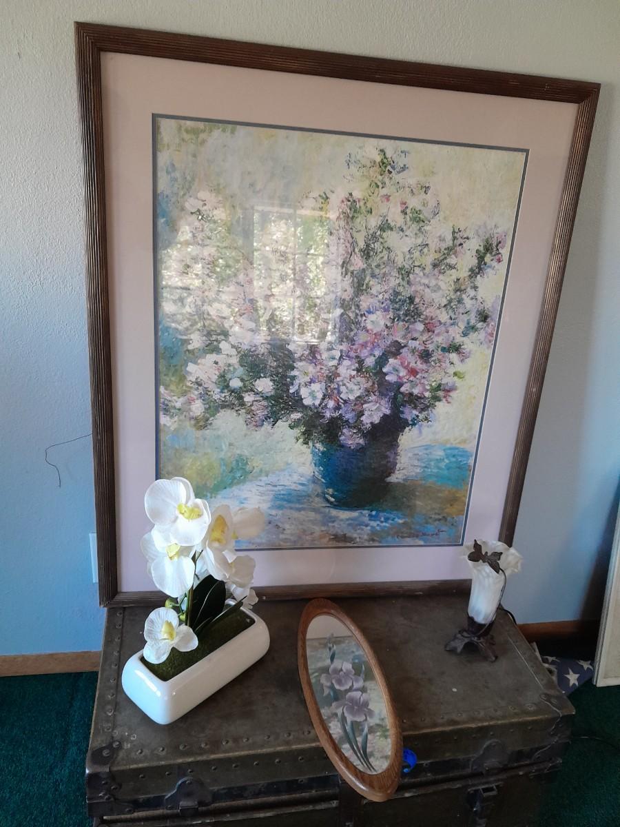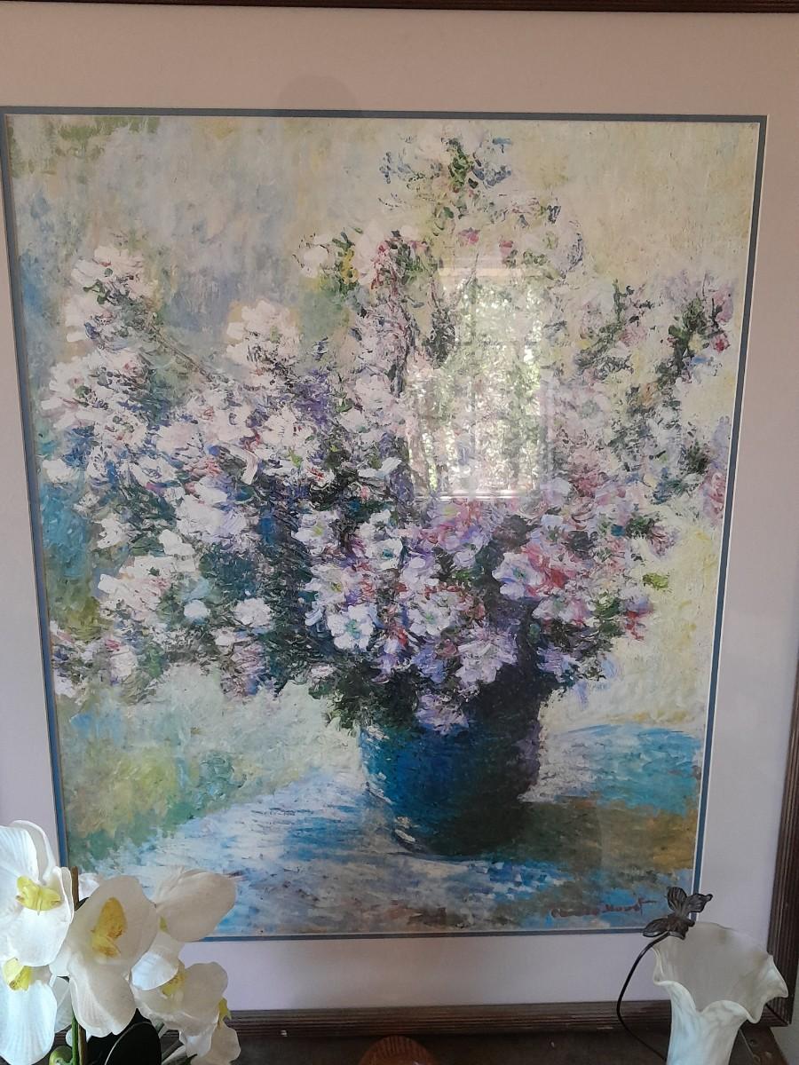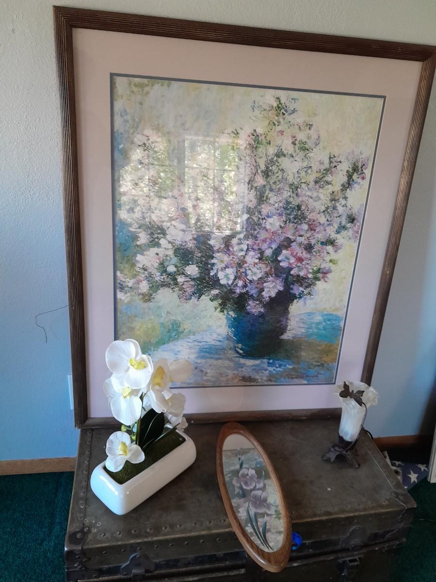 LARGE FRAMED ARTWORK 31" X 39" CLAUDE MONET, FAUX FLOWERS, IRIS PAINTED ON A SMALL MIRROR, AND A METAL AND GLASS DECORATIVE LAMP WITH BUTTERFLY