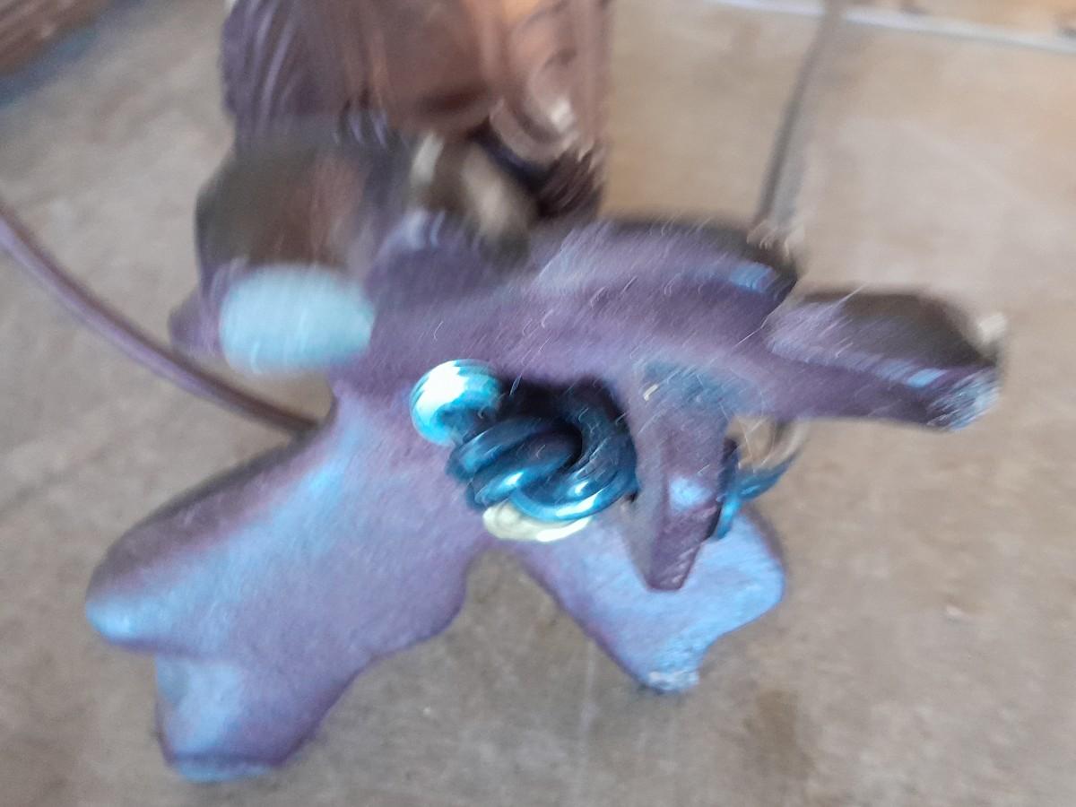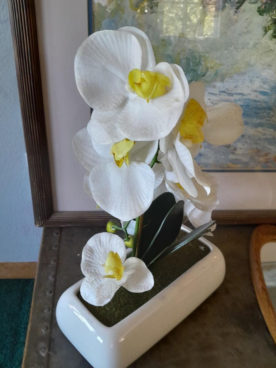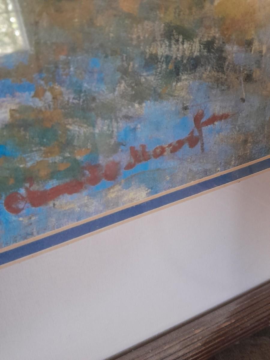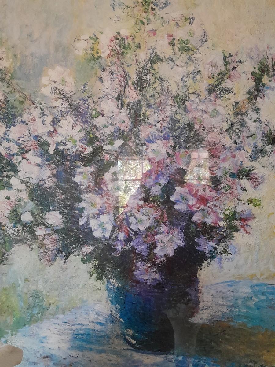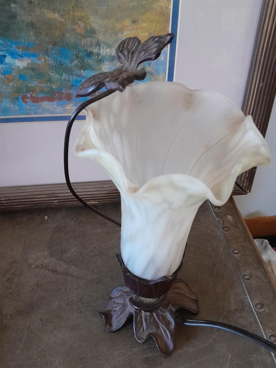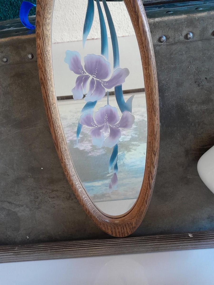 LARGE FRAMED ARTWORK 31" X 39" CLAUDE MONET, FAUX FLOWERS, IRIS PAINTED ON A SMALL MIRROR, AND A METAL AND GLASS DECORATIVE LAMP WITH BUTTERFLY