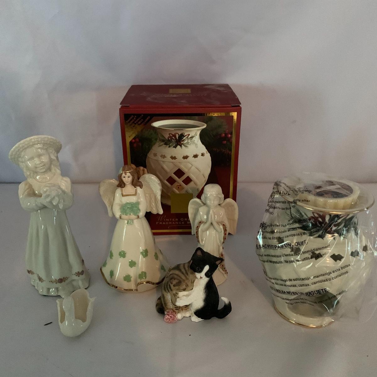 These are THE CUTEST group of figurines. This lot includes two angles, an adorable girl with flowers, a little swan, and a pair of cuddling cats. Also included is a new in box Winter Greetings Fragrance Warmer made by Lenox. The cats, and little girl are also manufactured by Lenox. Shipping Available.
