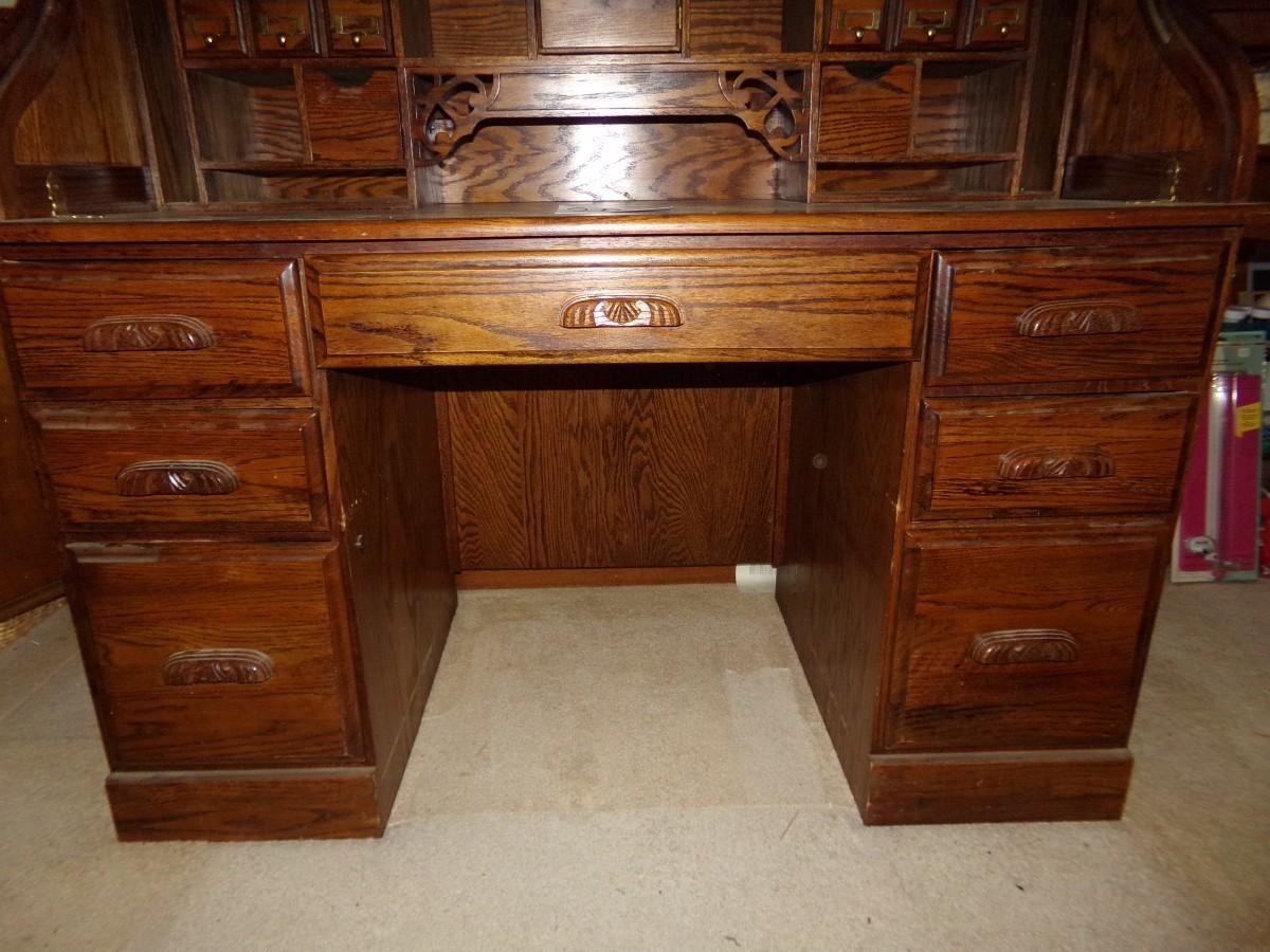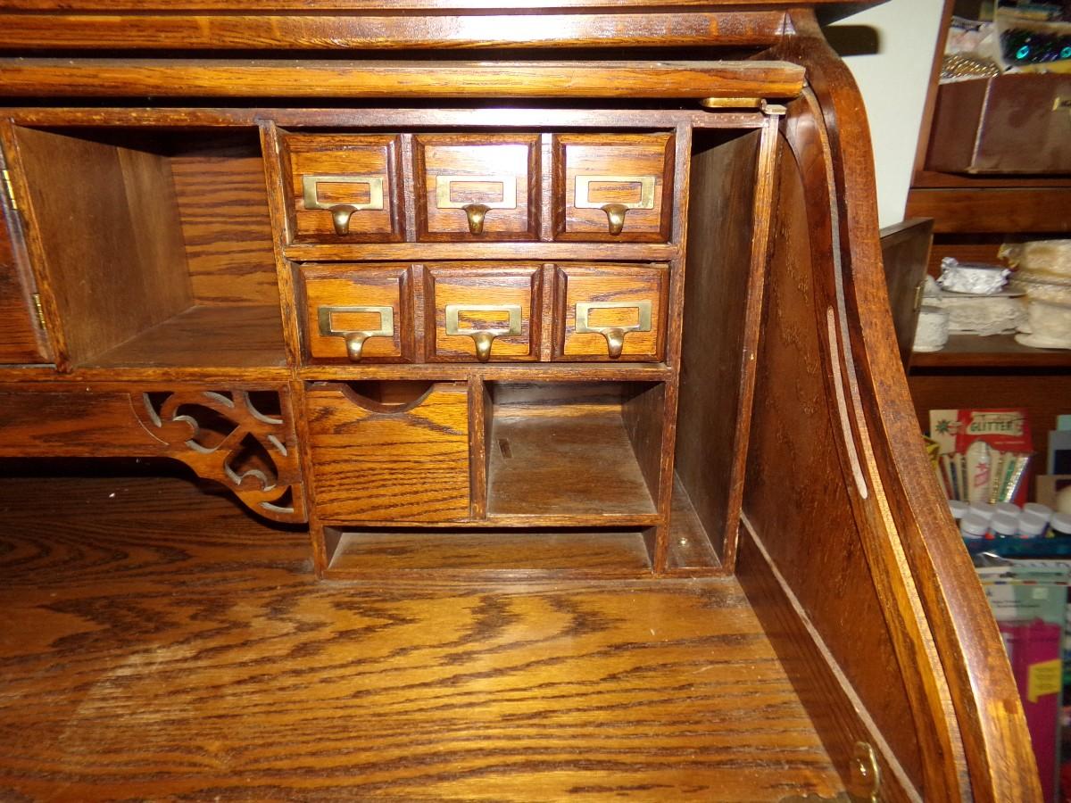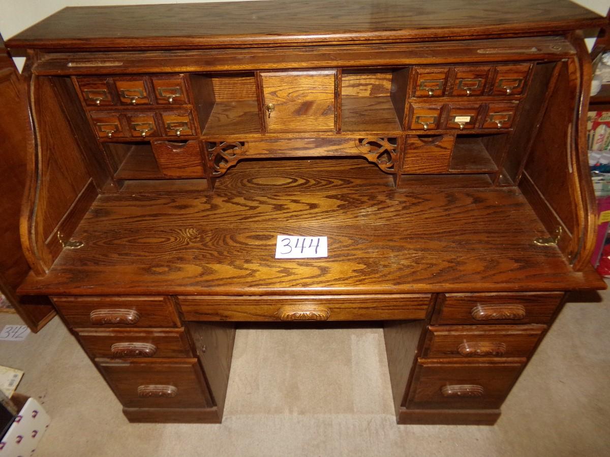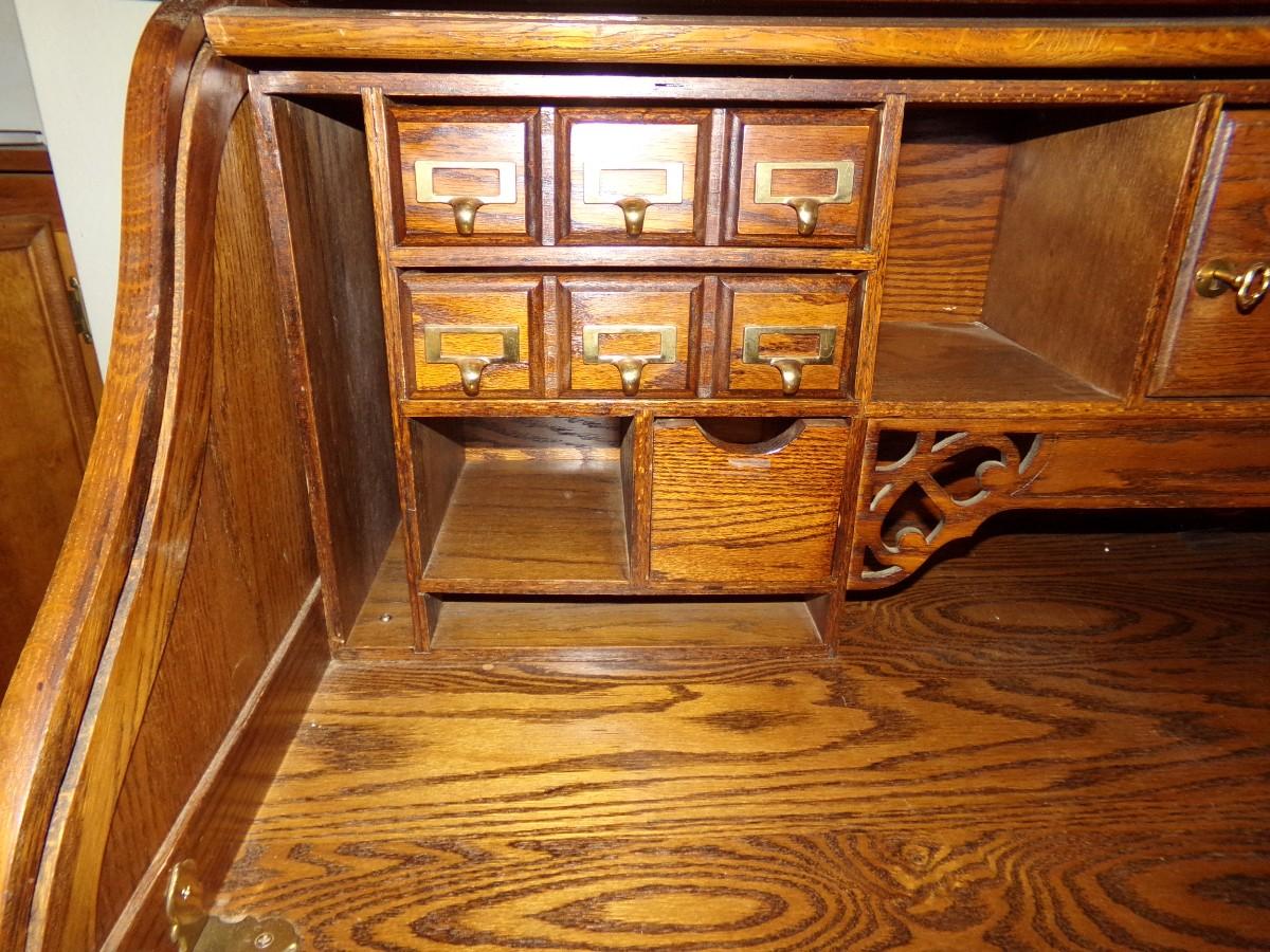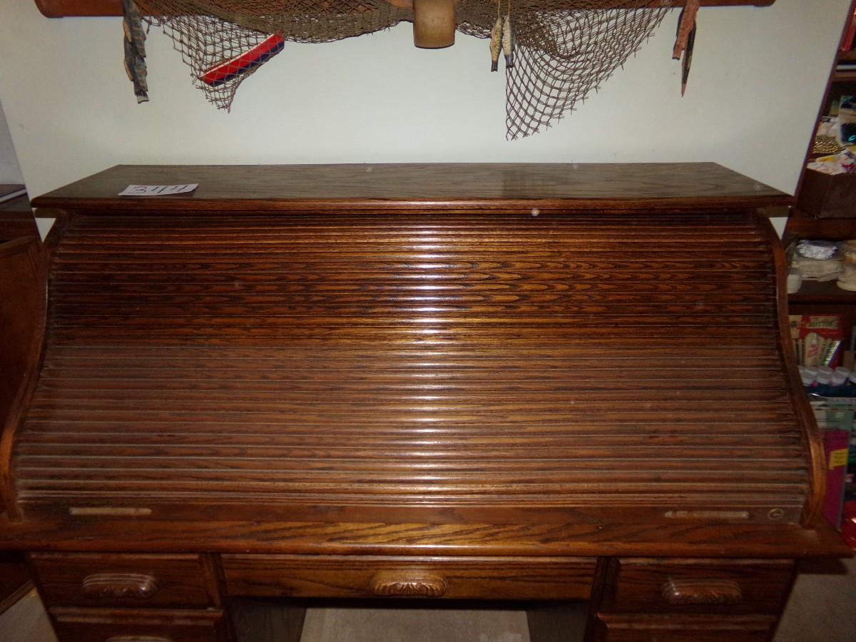 ROLL-TOP DESK WITH ALL THE SLOTS YOU COULD NEED. HAS THE ORIGINAL KEY. MEASURES 47.5 X 54 X 28. OVERALL IN VERY GOOD SHAPE.
