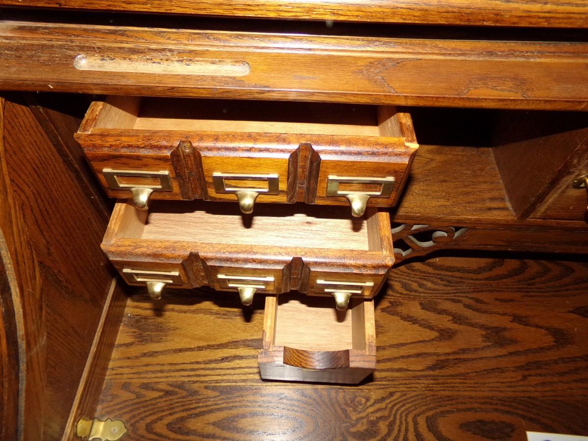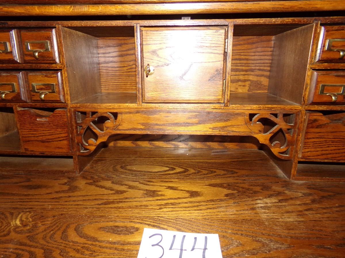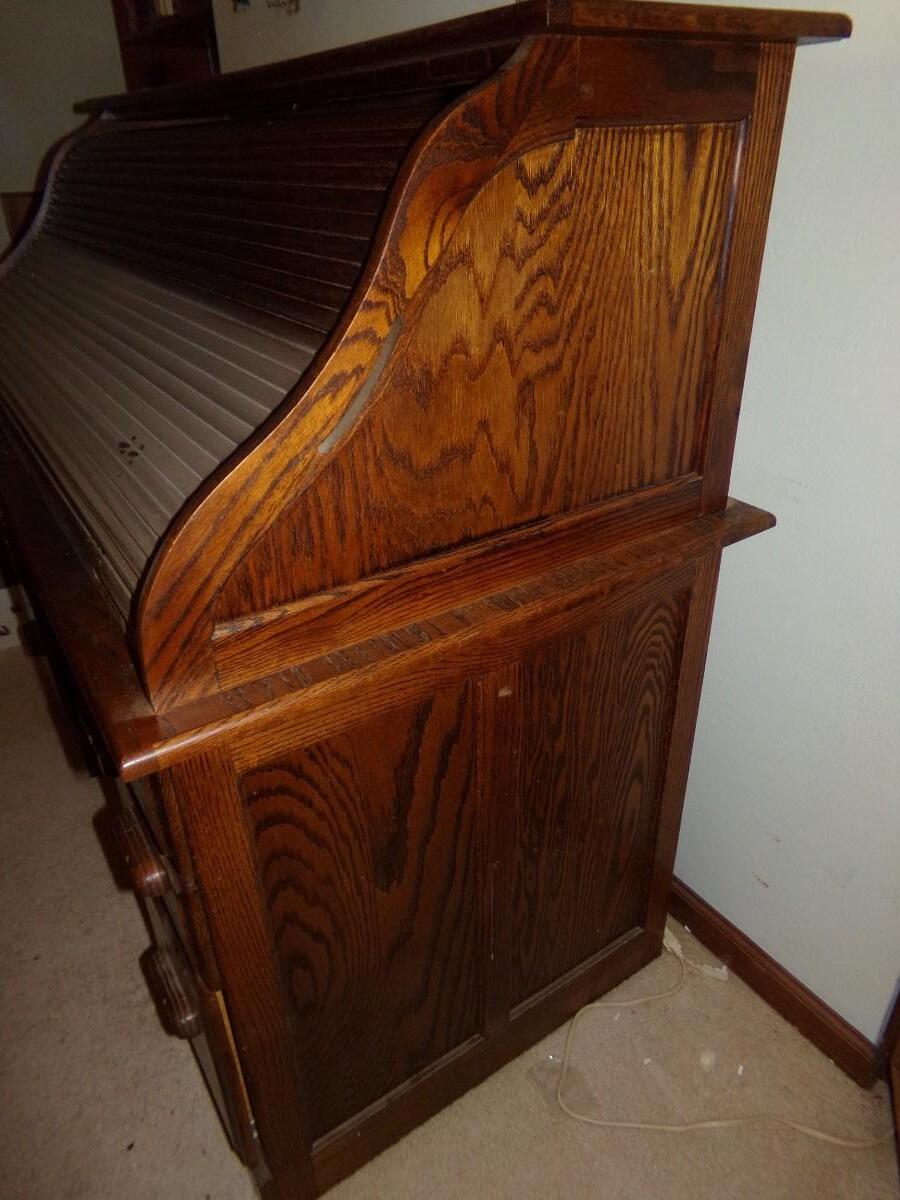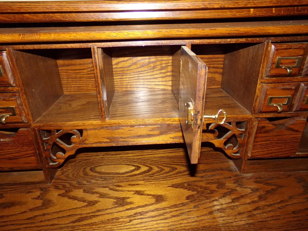 ROLL-TOP DESK WITH ALL THE SLOTS YOU COULD NEED. HAS THE ORIGINAL KEY. MEASURES 47.5 X 54 X 28. OVERALL IN VERY GOOD SHAPE.