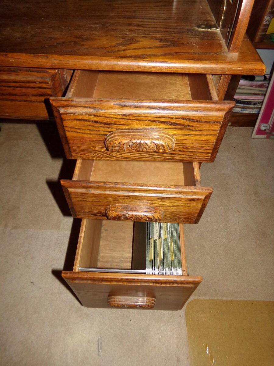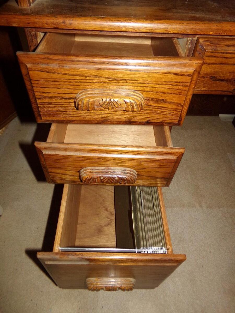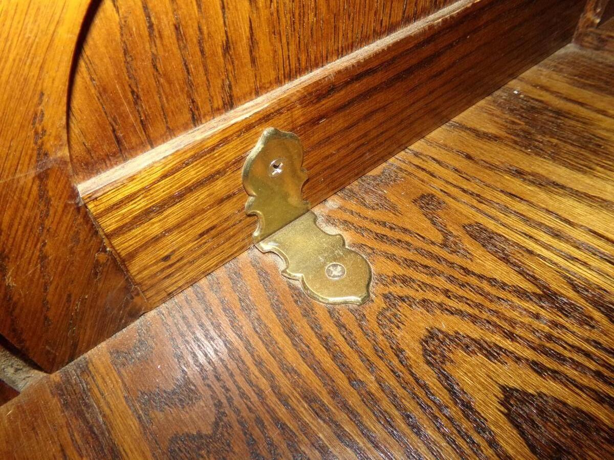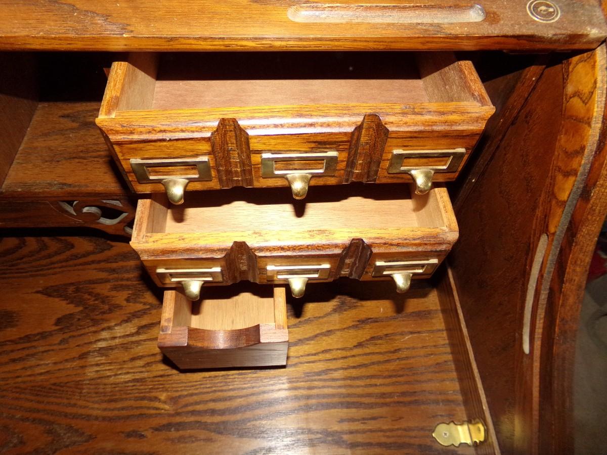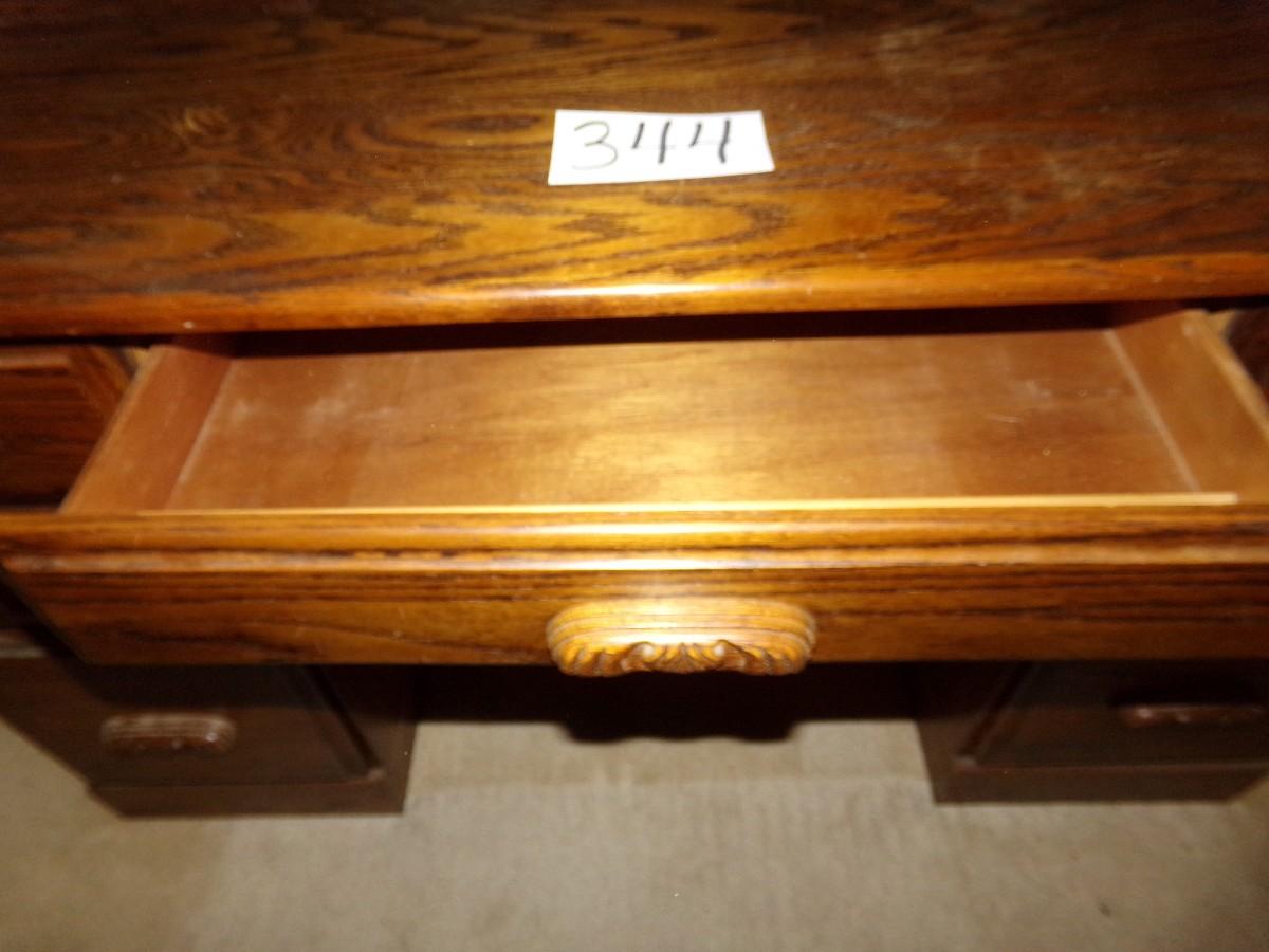 ROLL-TOP DESK WITH ALL THE SLOTS YOU COULD NEED. HAS THE ORIGINAL KEY. MEASURES 47.5 X 54 X 28. OVERALL IN VERY GOOD SHAPE.