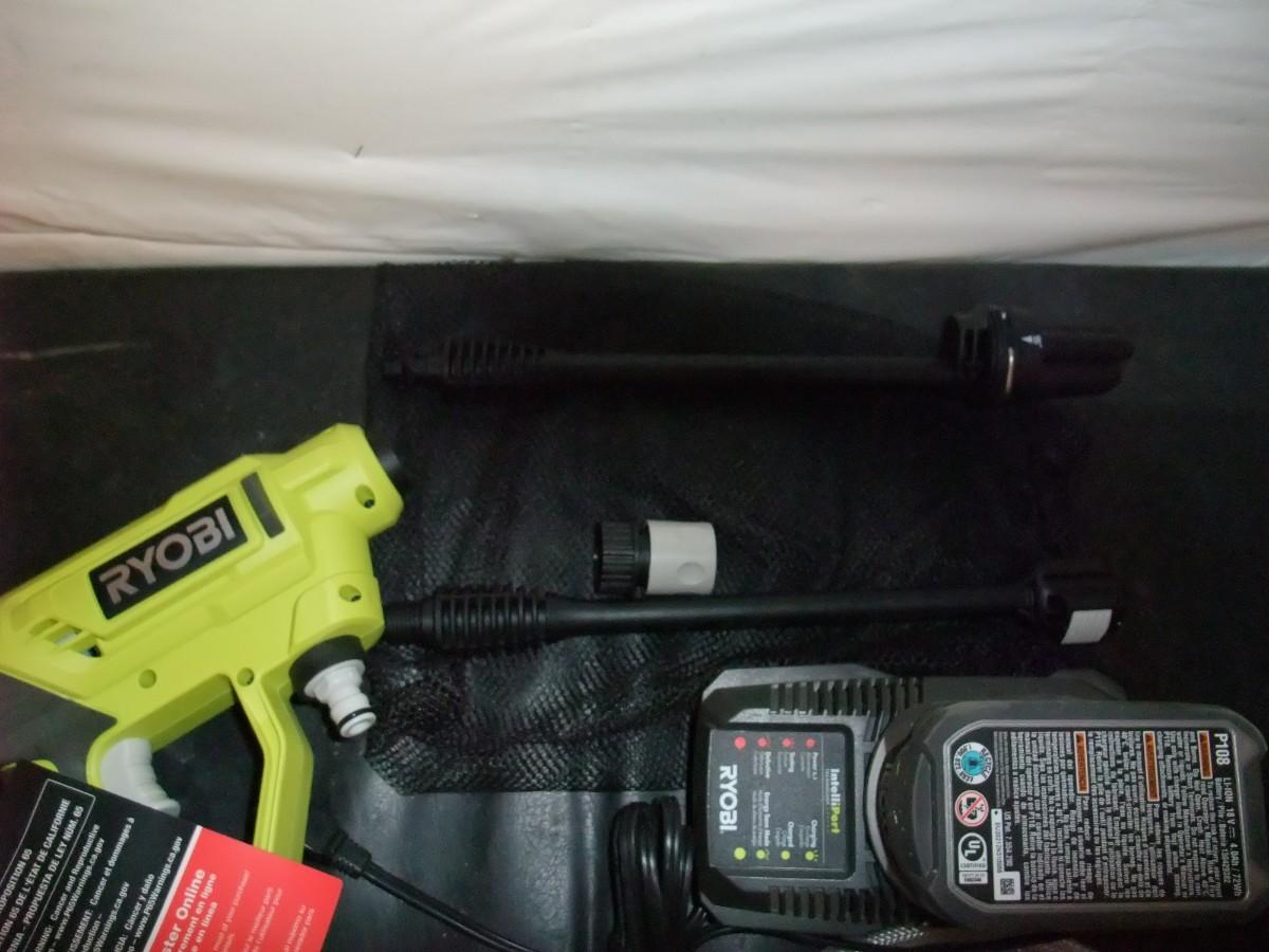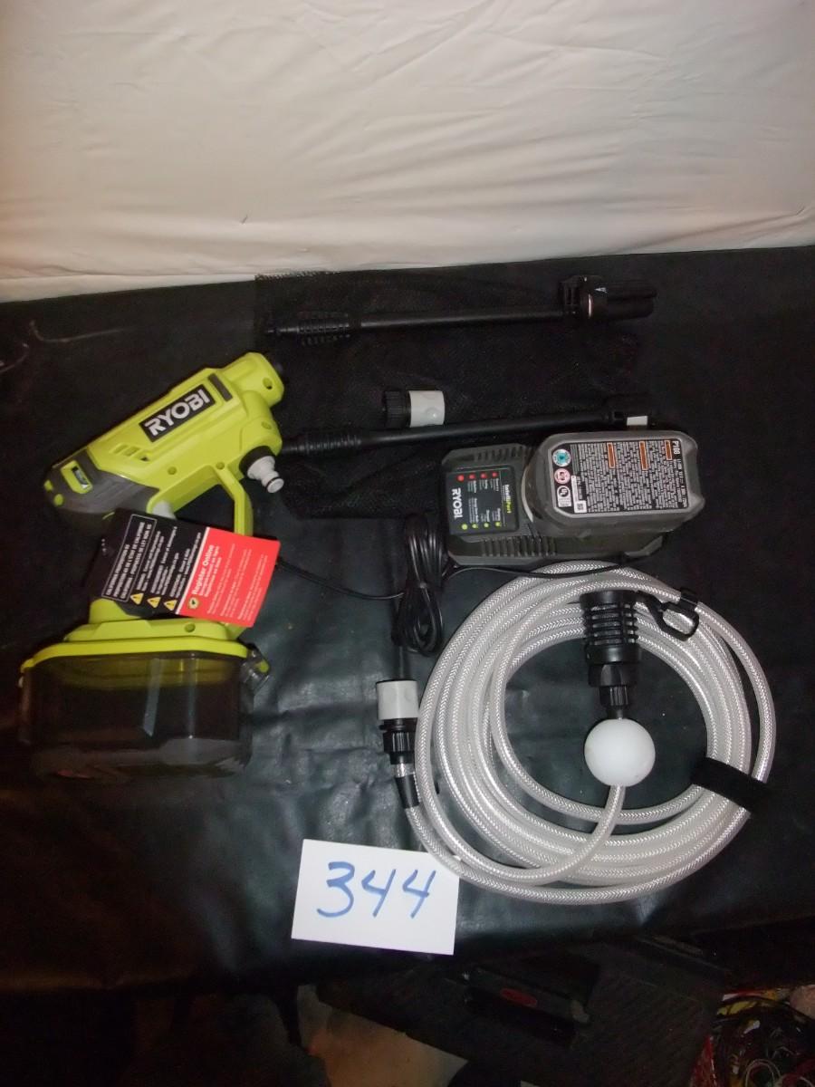 LOT 344 RYOBI CORDLESS POWER WASHER W/ ALL ACCESORIES, BATTERY, AND BATTERY CHARGER