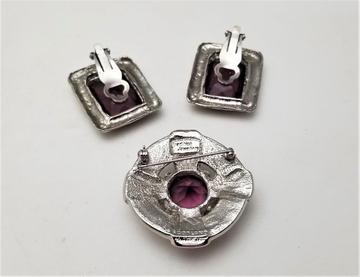 Brooch is marked "Traditions Jewellery", made in Scotland. Traditional Scottish Design, silver tone setting. Matching earrings are clips. Brooch measures 2" across, earrings are 1.5" long. Good, vintage condition. 1960's.