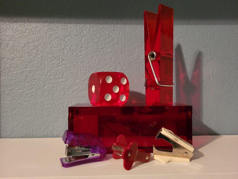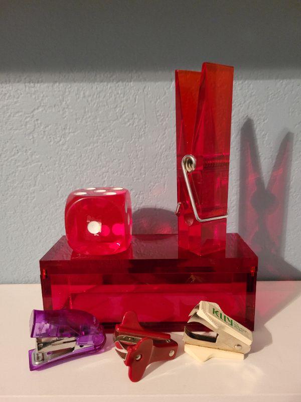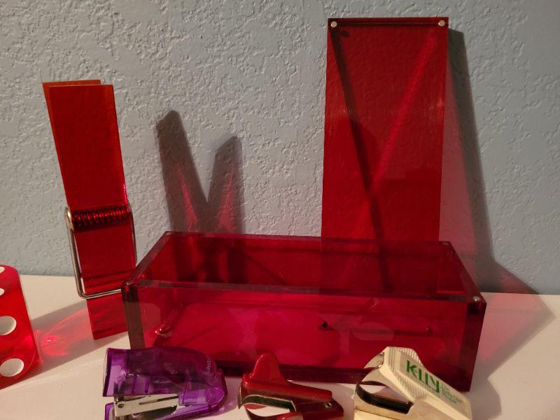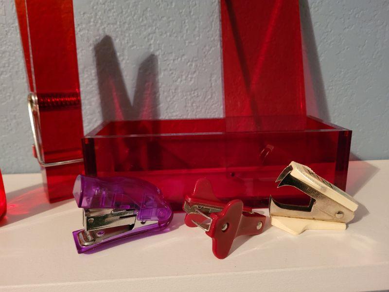 Lot #345: Assortment of Office / Work Desk Items feat. MAGNETIC TOP CLEAR RED BOX