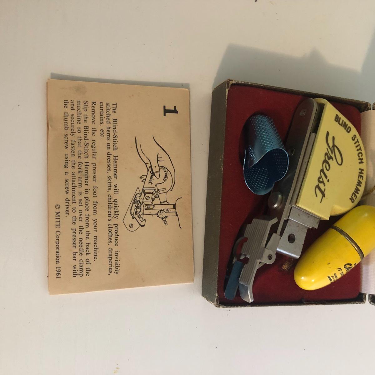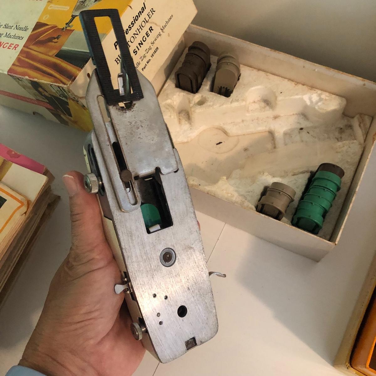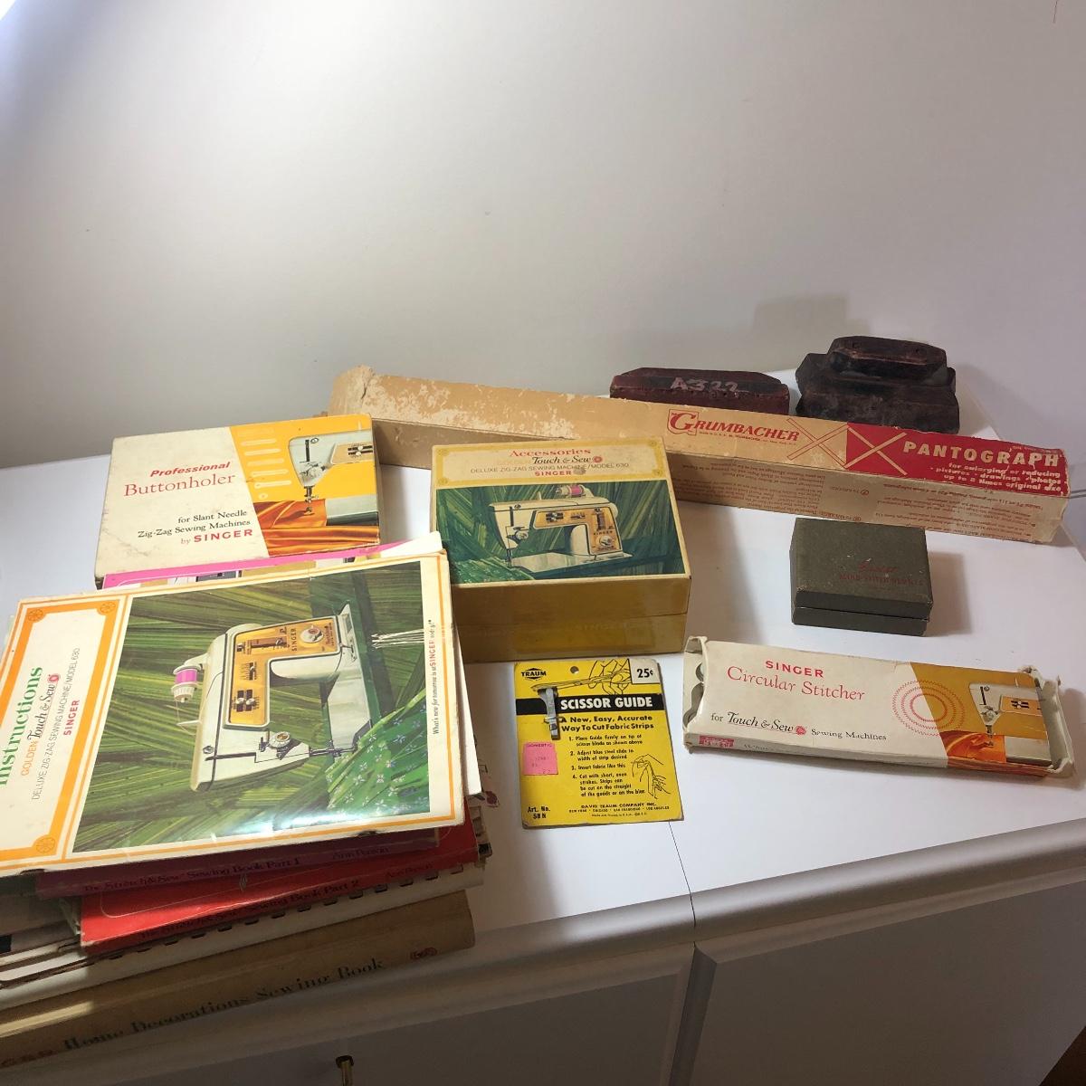 Add to your sewing collection with this lot. It includes a Grimbacher pantograph, two wooden tools, a Singer circular stitcher, professional buttonholer, accessories touch and sew, a Greist blind-stitch hemmer and ten vintage sewing books. Shipping Available.