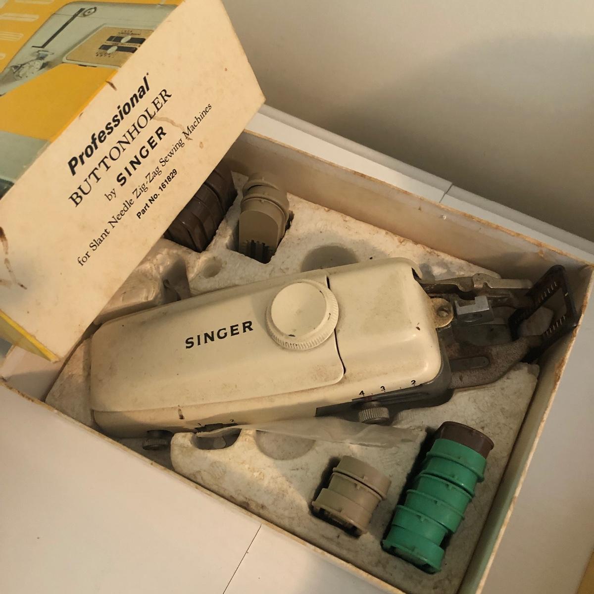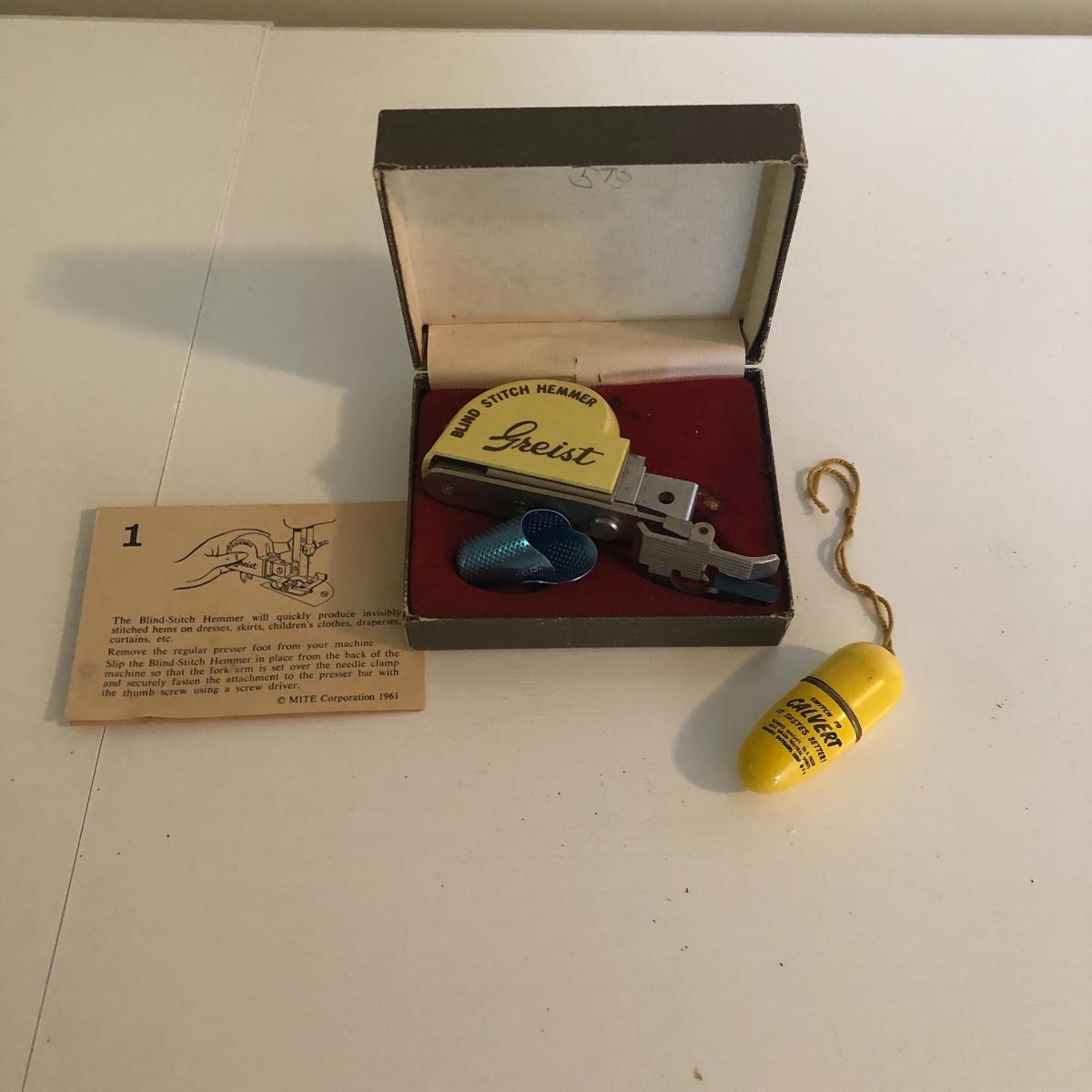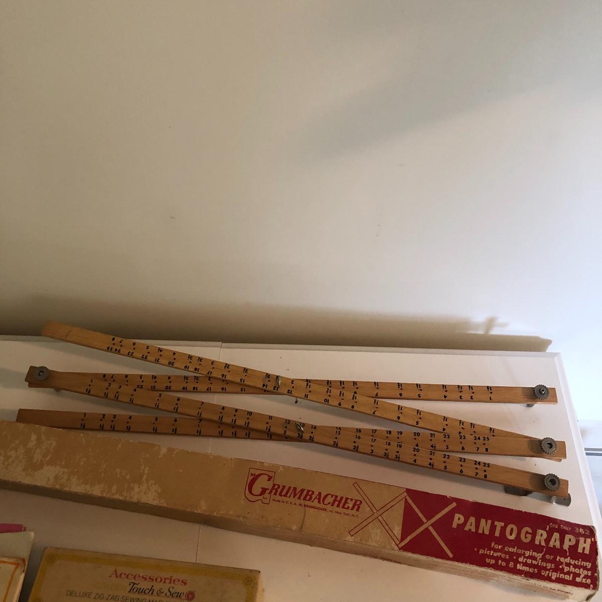 Add to your sewing collection with this lot. It includes a Grimbacher pantograph, two wooden tools, a Singer circular stitcher, professional buttonholer, accessories touch and sew, a Greist blind-stitch hemmer and ten vintage sewing books. Shipping Available.