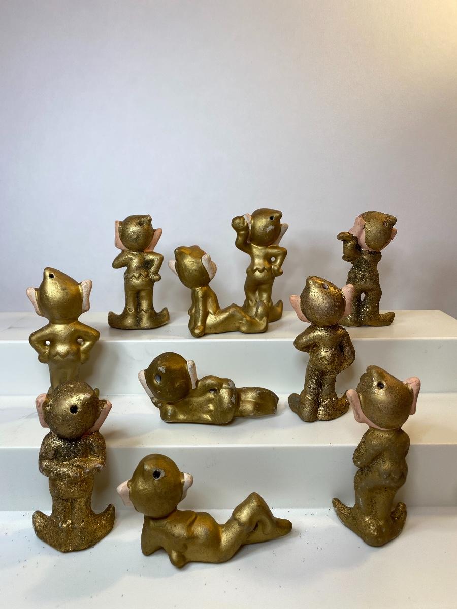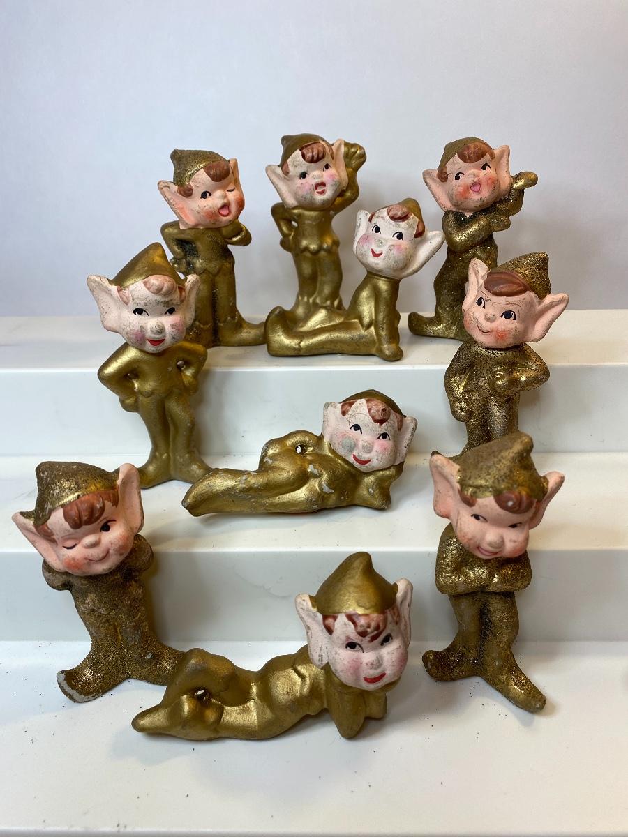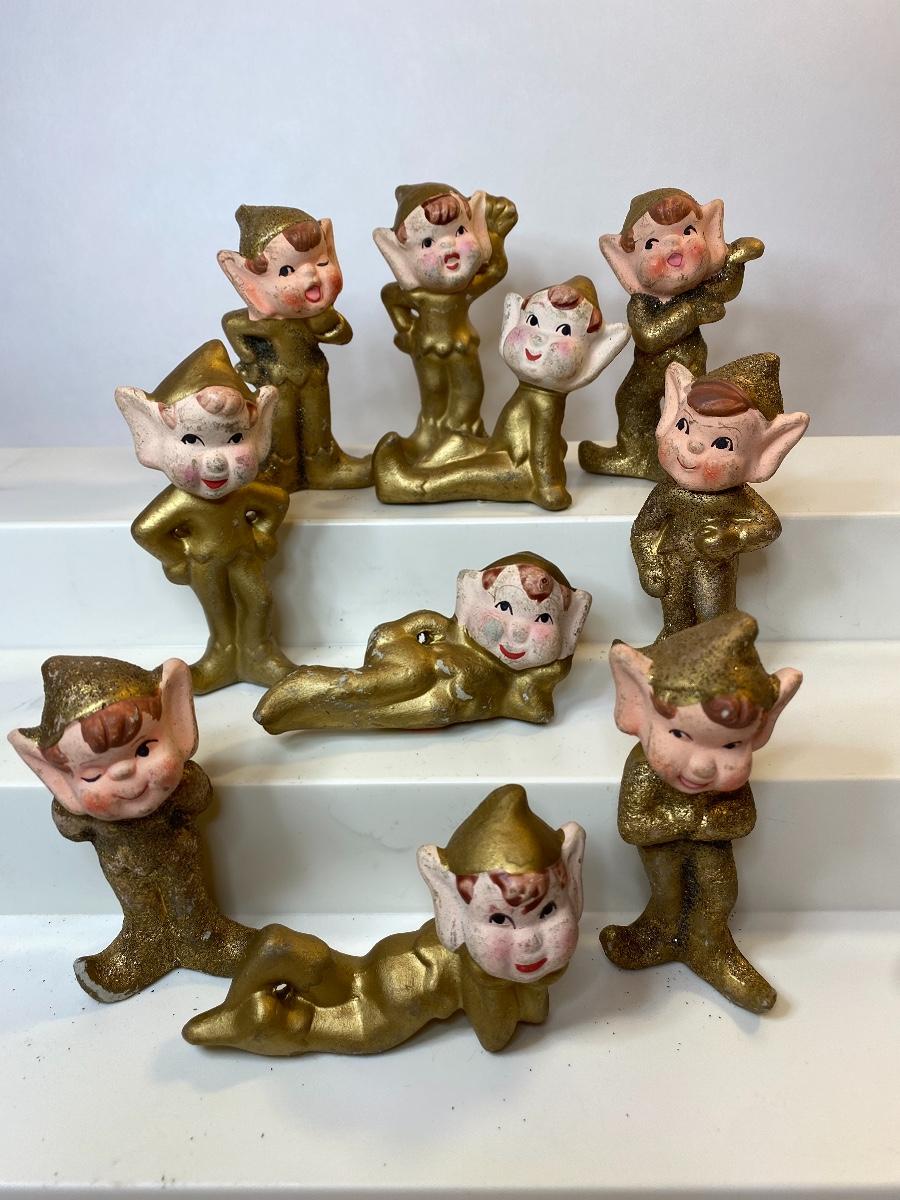 Ten gold ceramic Christmas elves. The pictures show condition, measurements if taken, and what is included in the lot. Due to the large amount that we photograph and the time frame, we are not always able to take measurements. All items unless noted, are pre-owned and have been used, and are untested. Thank you.