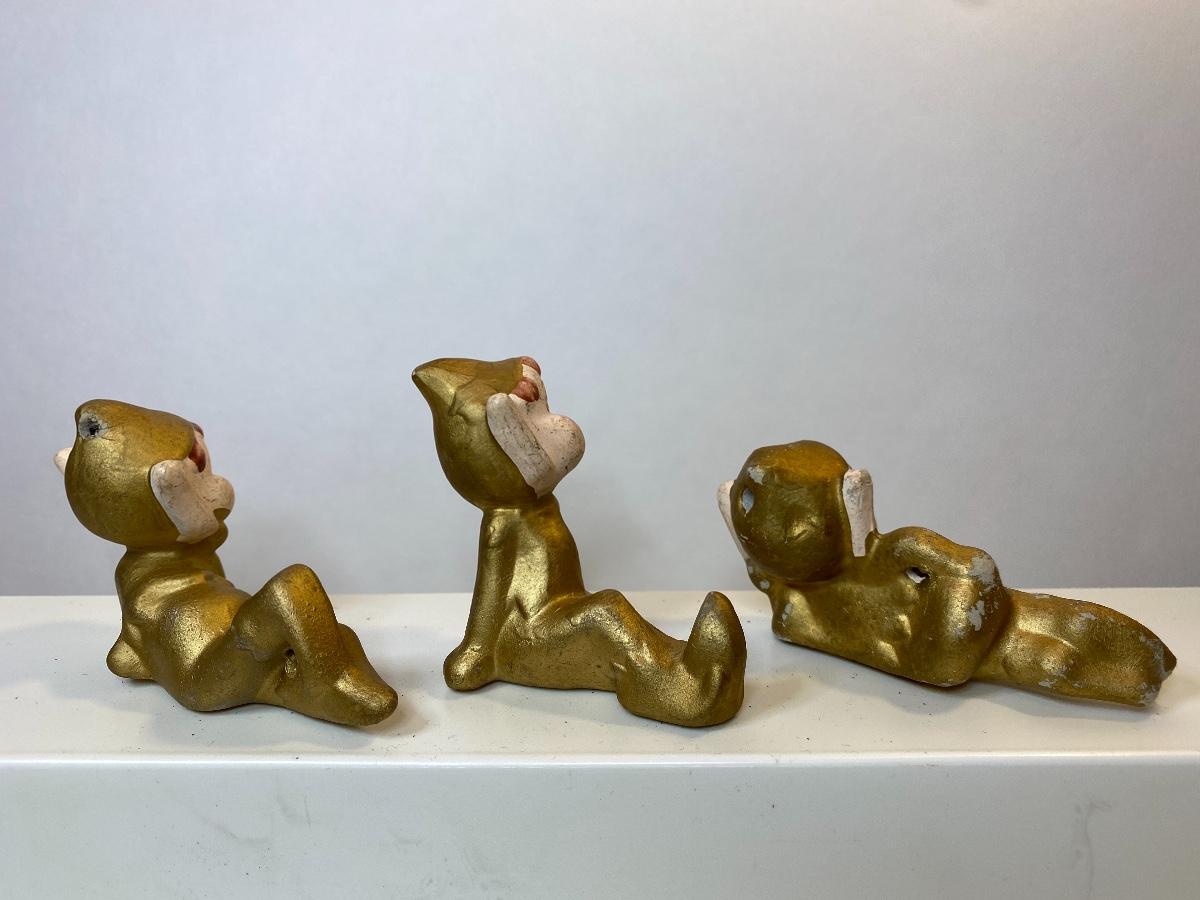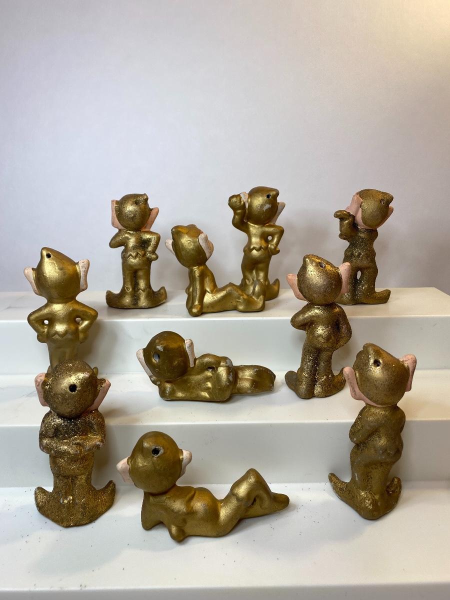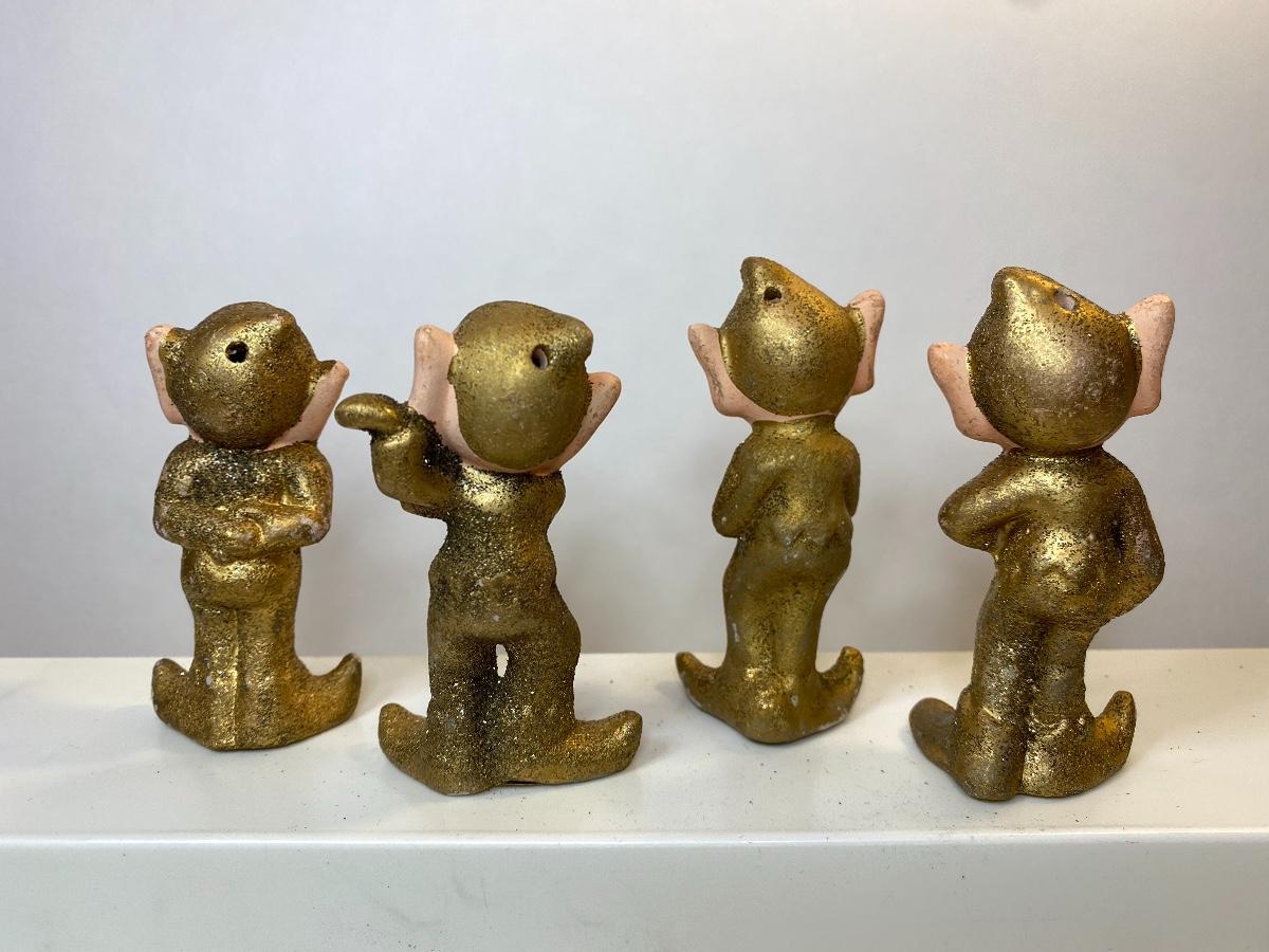 Ten gold ceramic Christmas elves. The pictures show condition, measurements if taken, and what is included in the lot. Due to the large amount that we photograph and the time frame, we are not always able to take measurements. All items unless noted, are pre-owned and have been used, and are untested. Thank you.