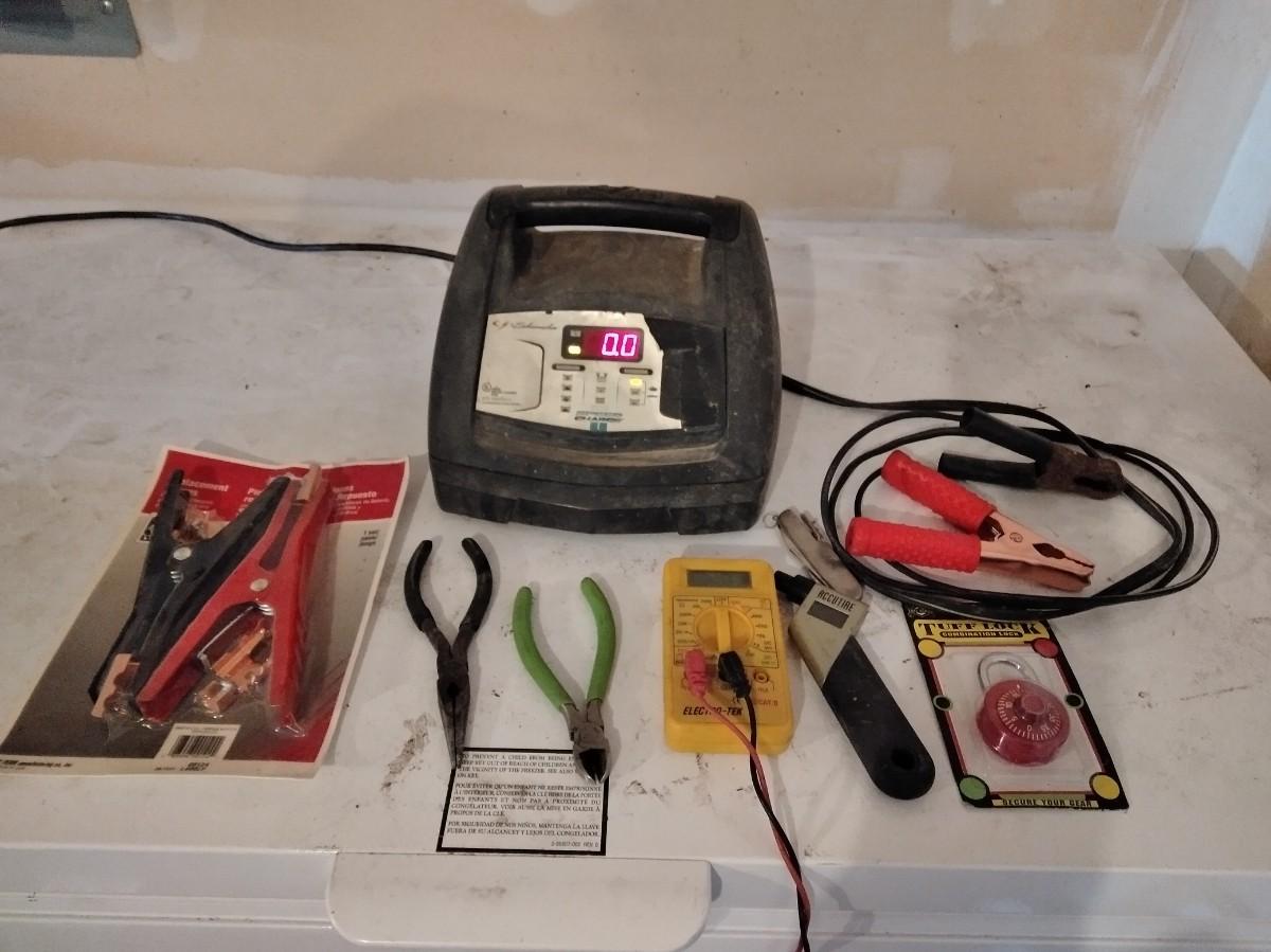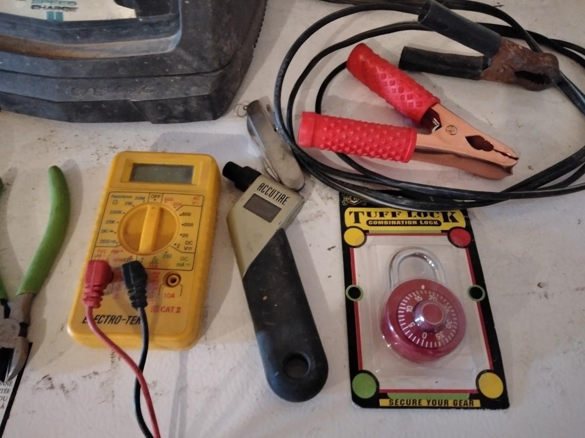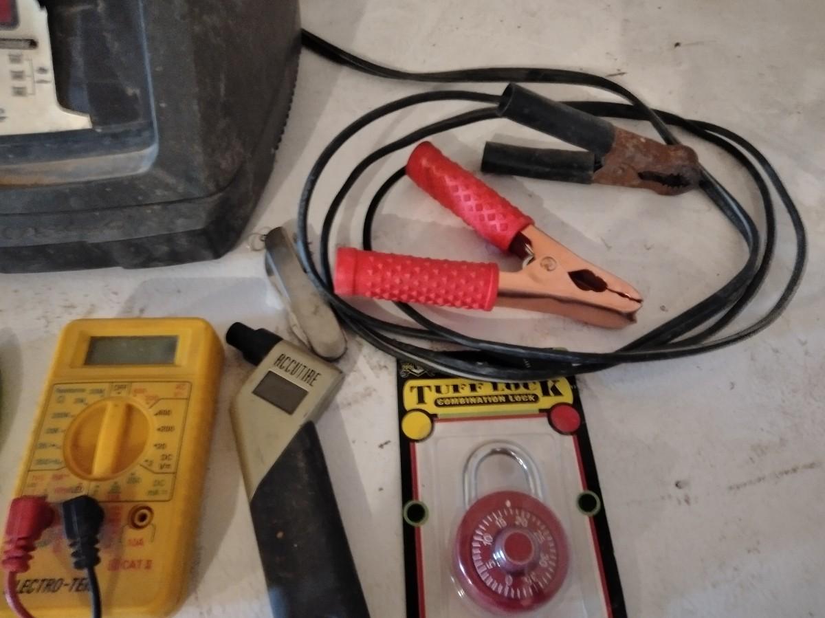 BATTERY CHARGER WITH NEW EXTRA CLAMPS, WIRE CUTTERS, MULTI-METER, COMBINATION LOCK AND MORE.