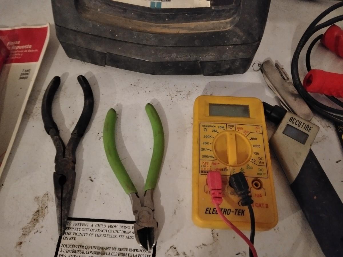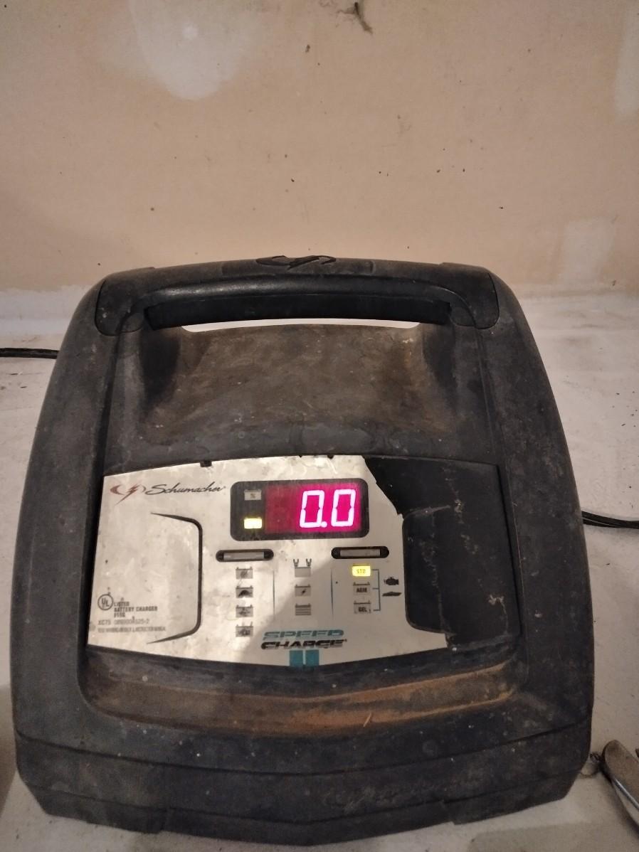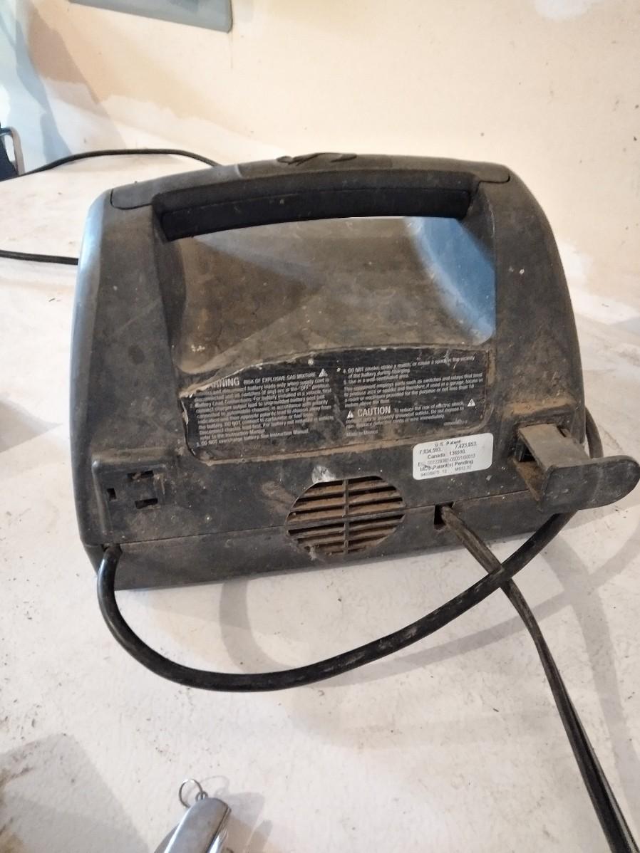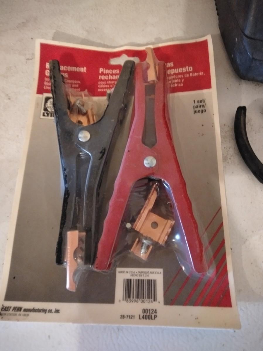 BATTERY CHARGER WITH NEW EXTRA CLAMPS, WIRE CUTTERS, MULTI-METER, COMBINATION LOCK AND MORE.