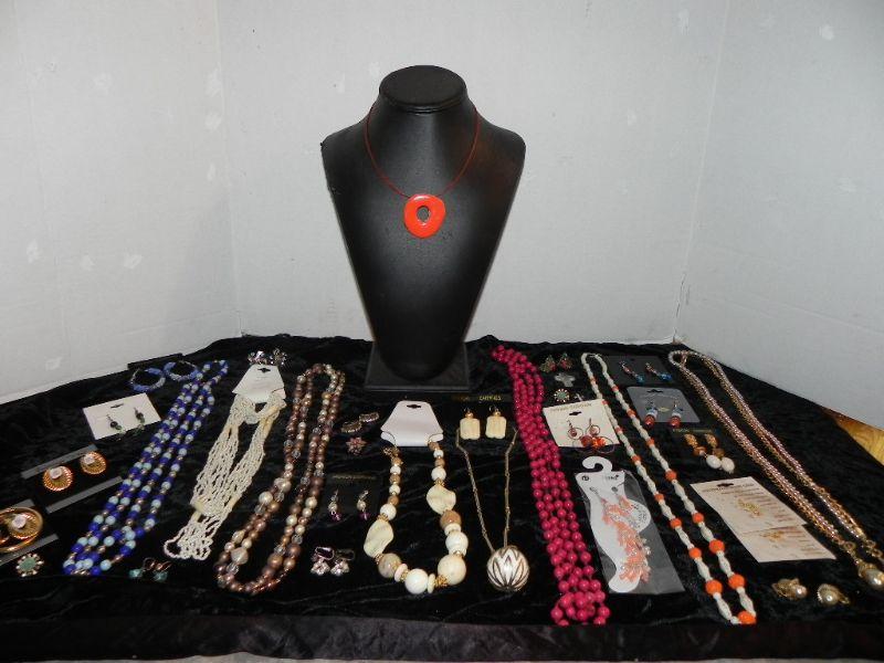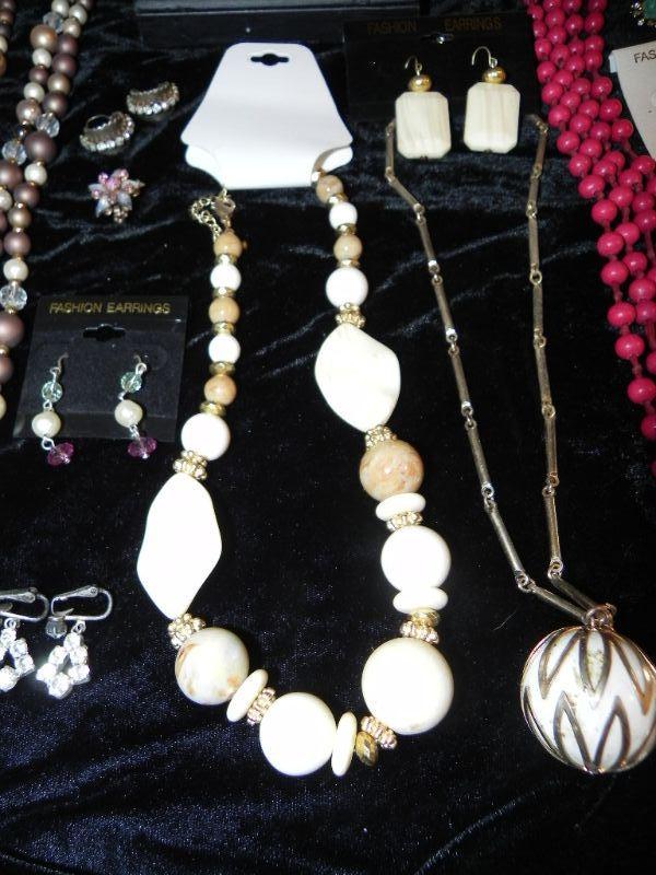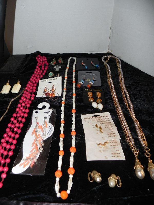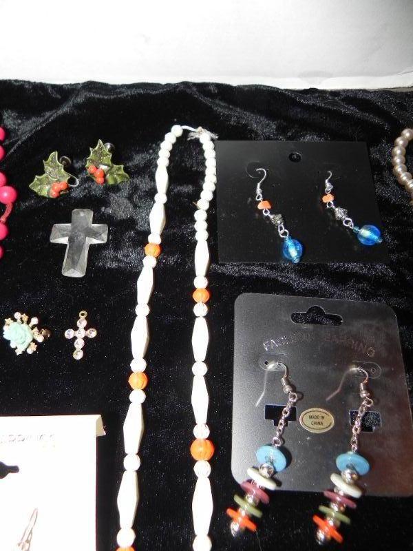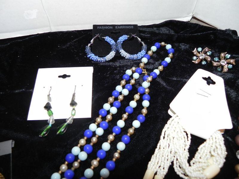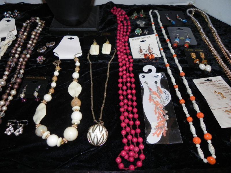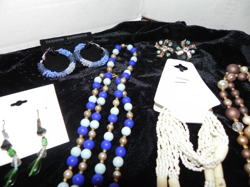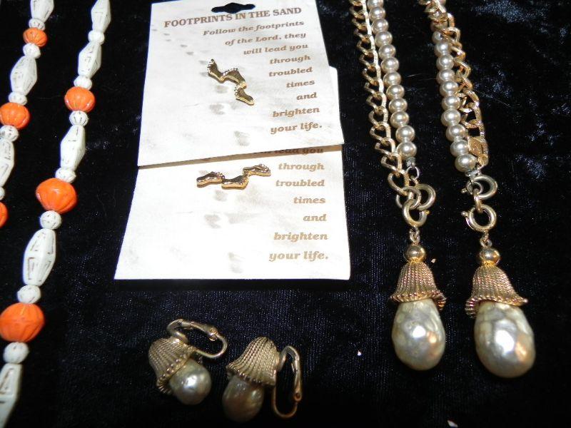 BEADED NECKLACES, FASHION EARINGS, BEADED ANKLE BRACELET, AND PINS.
