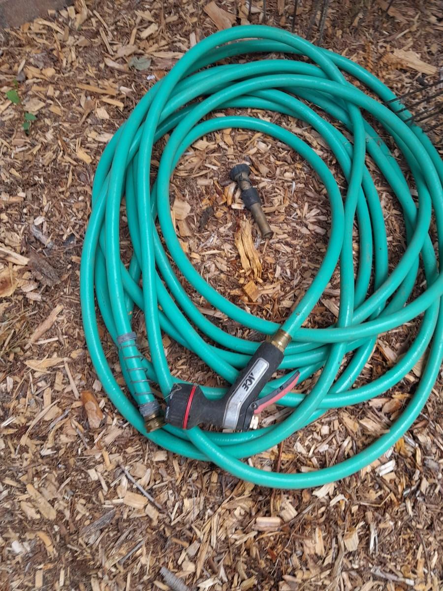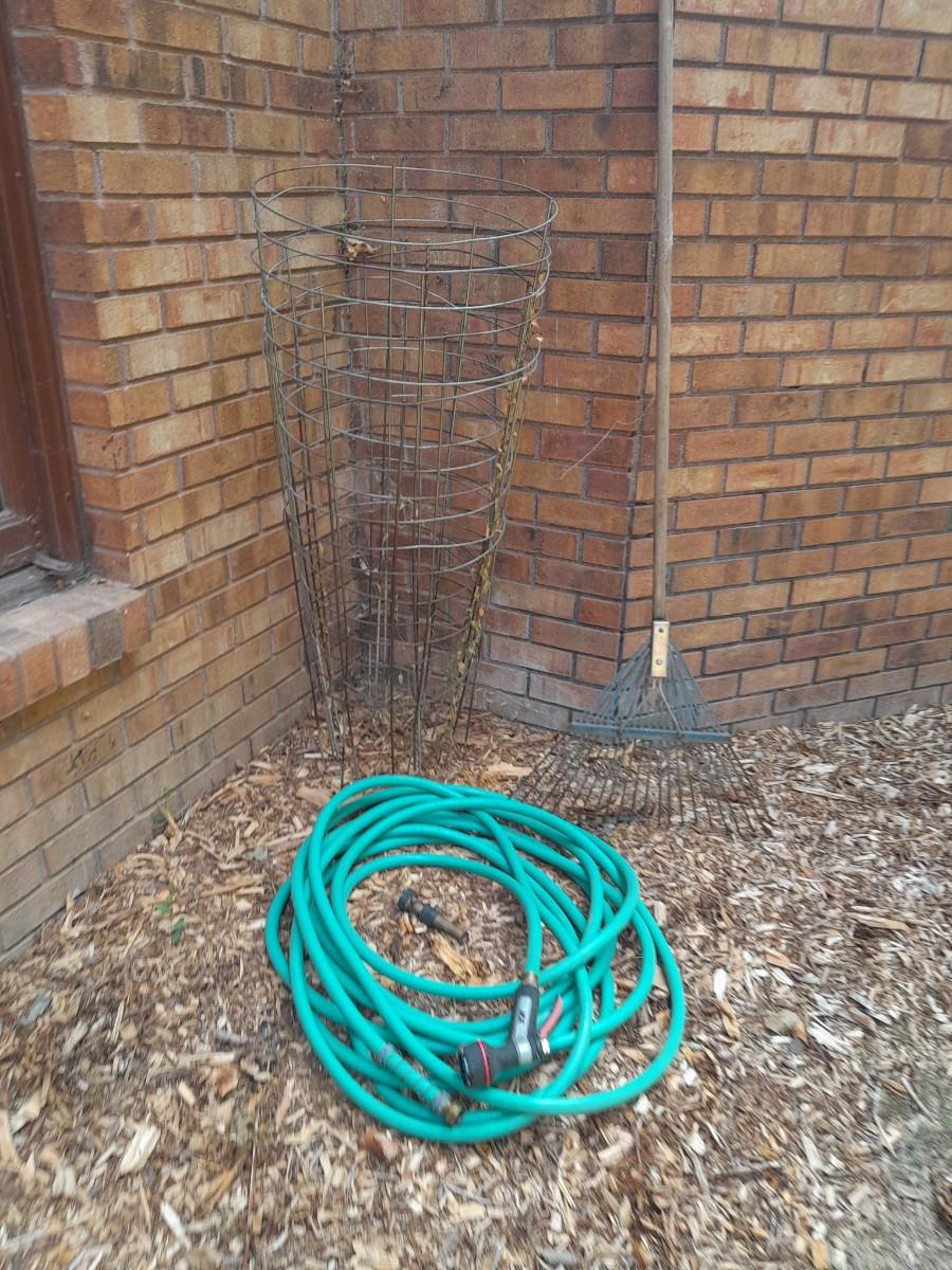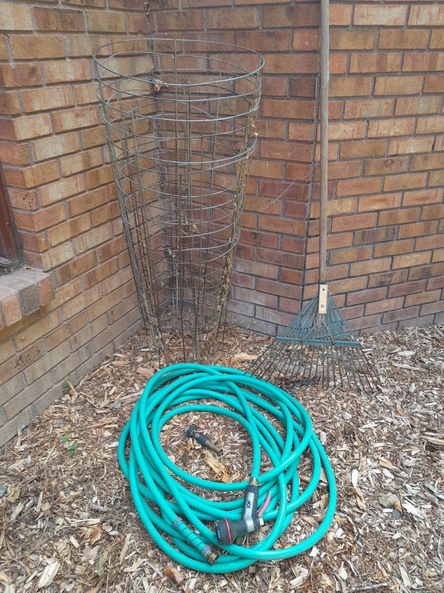 GARDEN HOSE WITH SPRAYERS, METAL HEAVY DUTY TOMATO CAGES AND A YARD RAKE