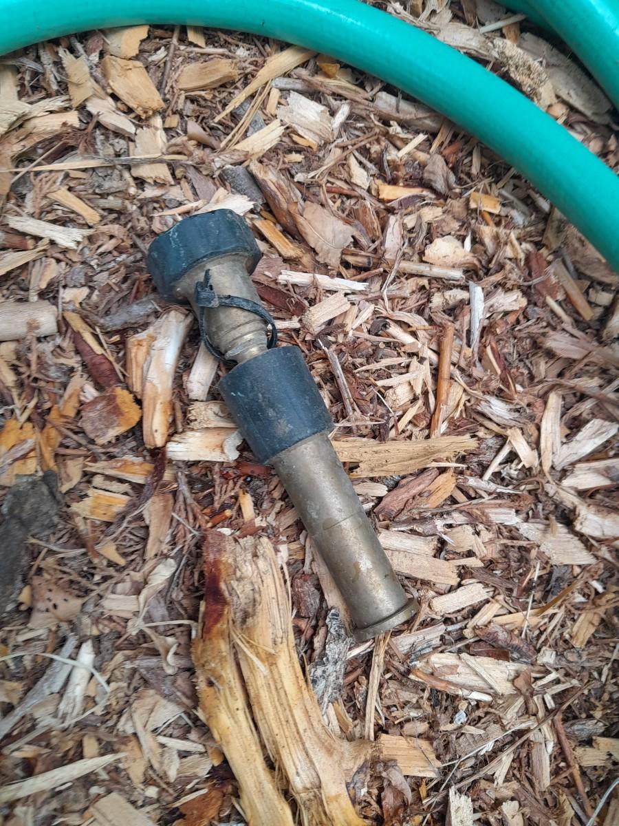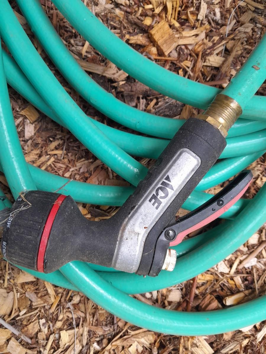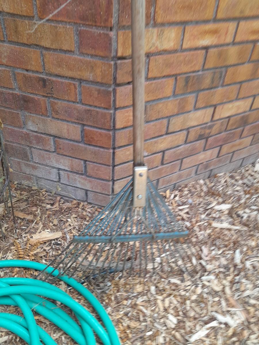 GARDEN HOSE WITH SPRAYERS, METAL HEAVY DUTY TOMATO CAGES AND A YARD RAKE