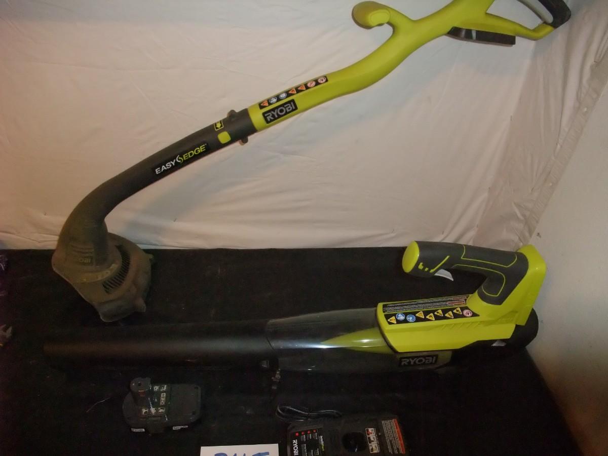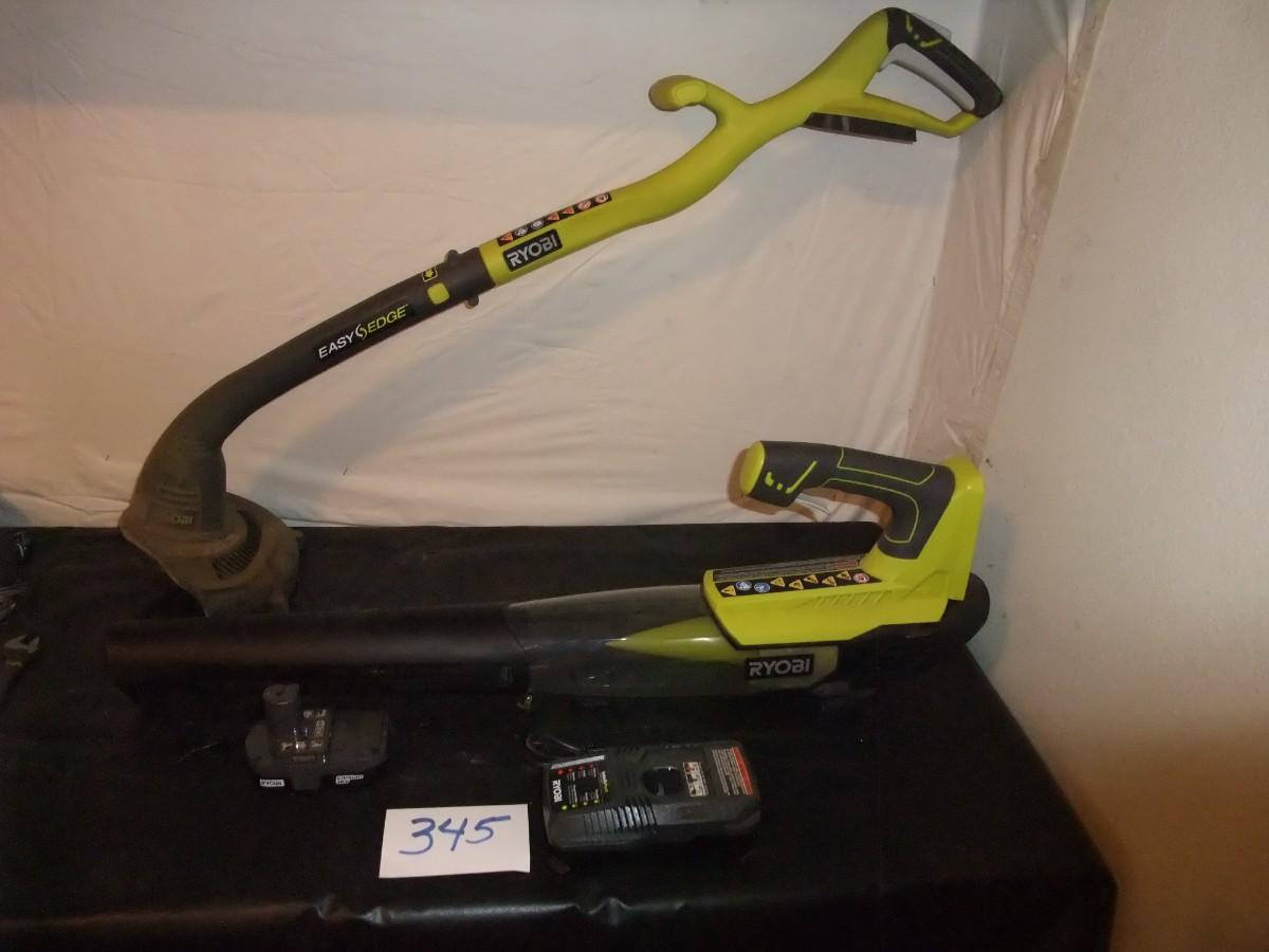 LOT 345 RYOBI CORDLESS LEAF BLOWER, RYOBI CORDLESS WEED EATER, BATTERY, AND BATTERY CHARGER