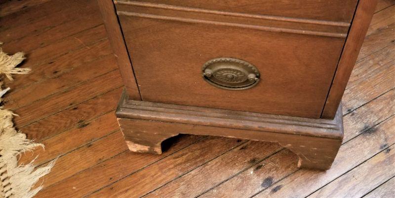 This vintage knee-hole desk has no maker's mark. All original - antique condition. Note damage at front right bottom. Good student desk or for desktop computer. Measures 22.5" deep, 42.5" across, 30" tall.