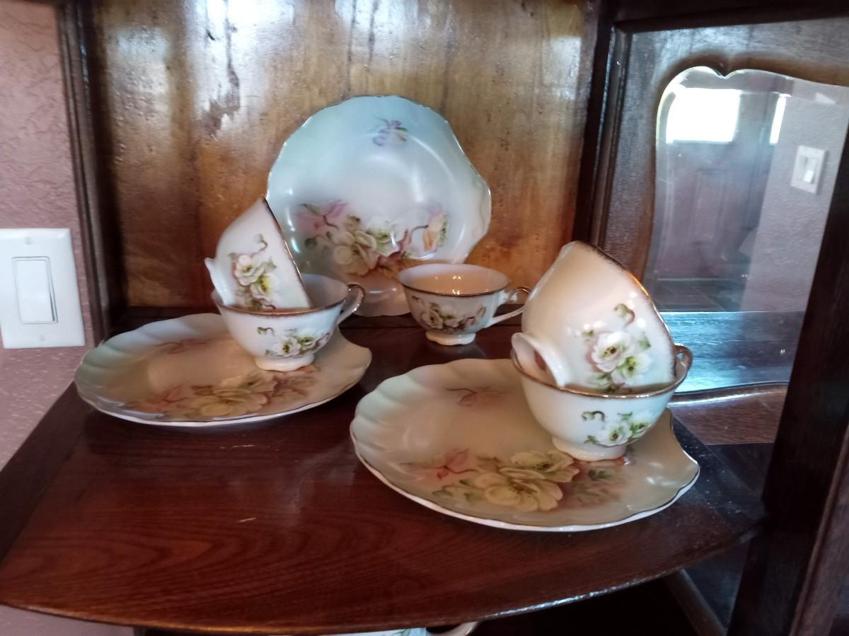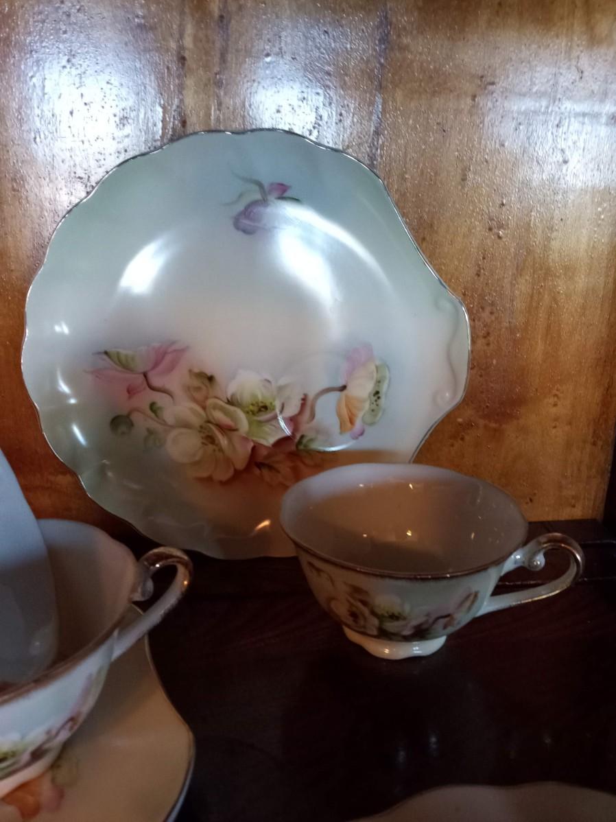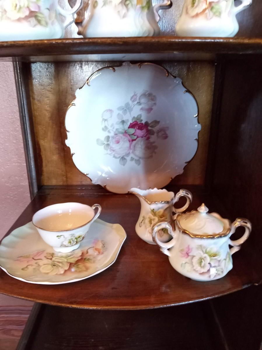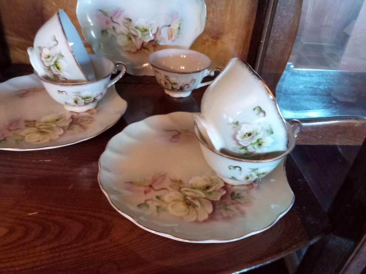 4 LUNCHEON PLATES, 6 TEA CUPS, 2 SETS OF CREAM AND SUGAR, TEAPOT AND A LARGER PLATE THAT DOES NOT MATCH THIS SET.