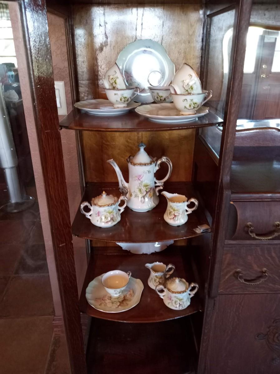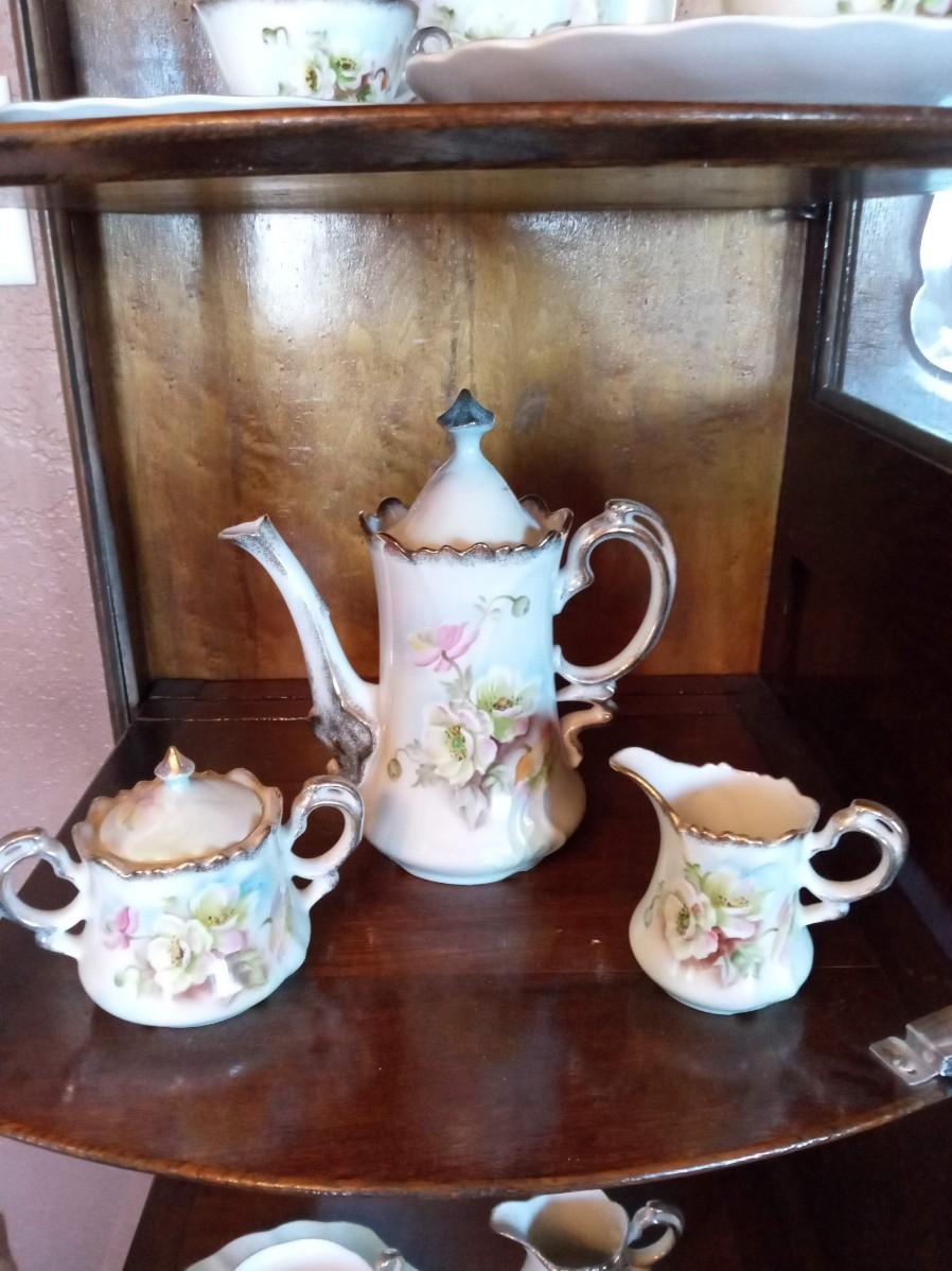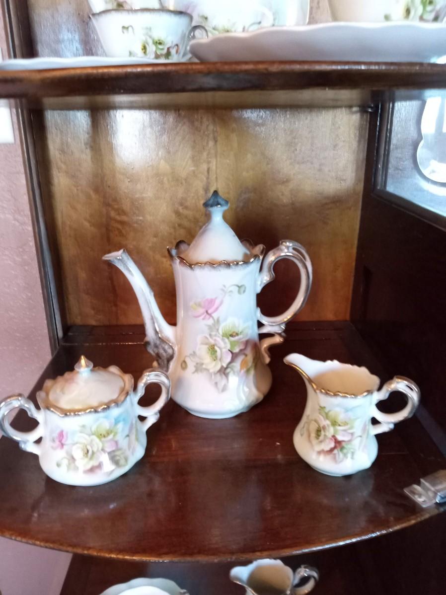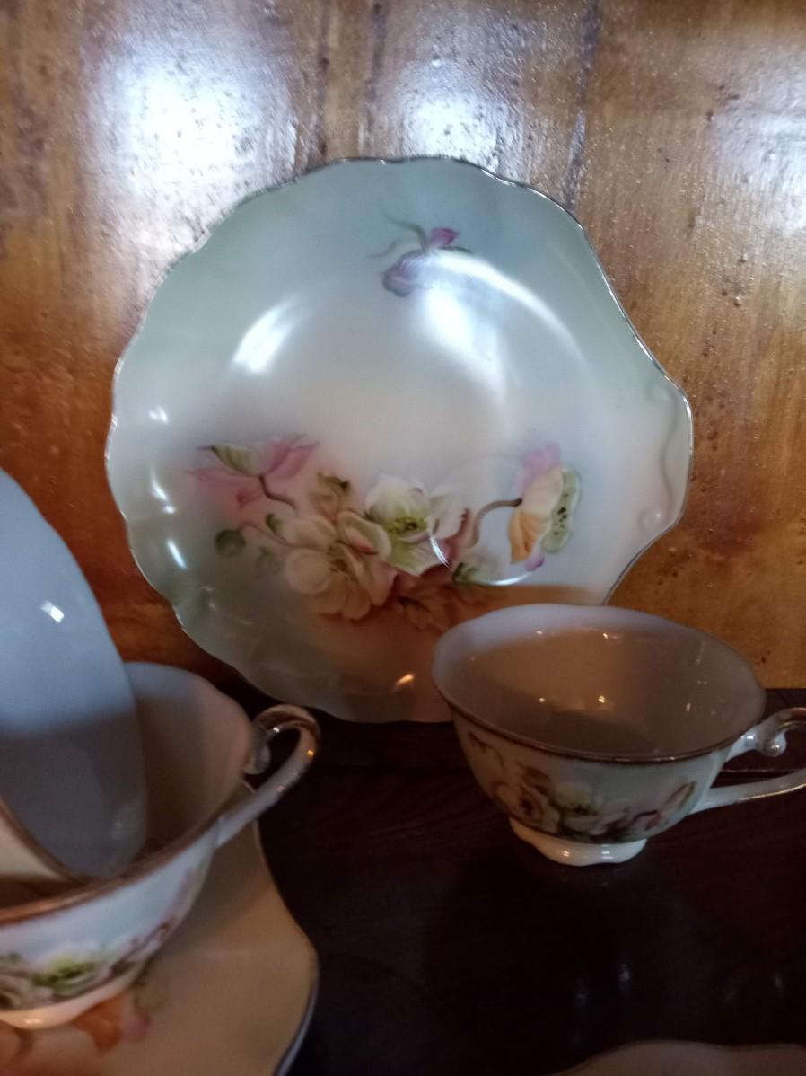 4 LUNCHEON PLATES, 6 TEA CUPS, 2 SETS OF CREAM AND SUGAR, TEAPOT AND A LARGER PLATE THAT DOES NOT MATCH THIS SET.