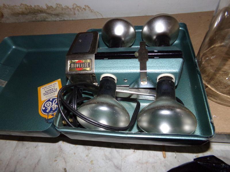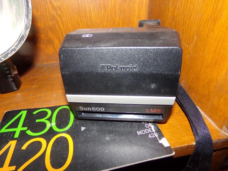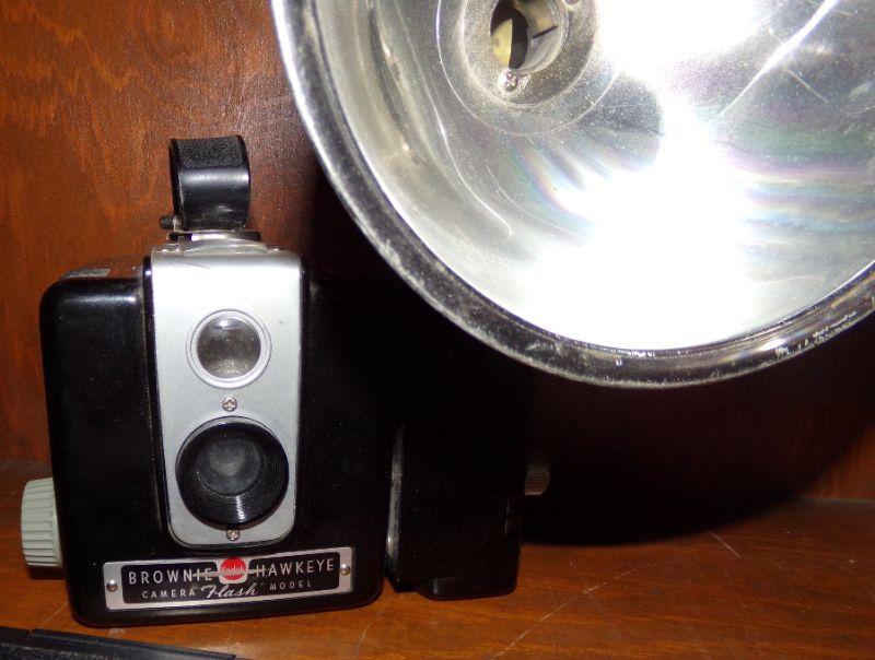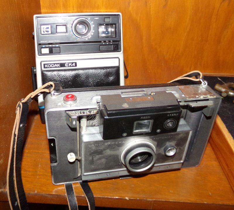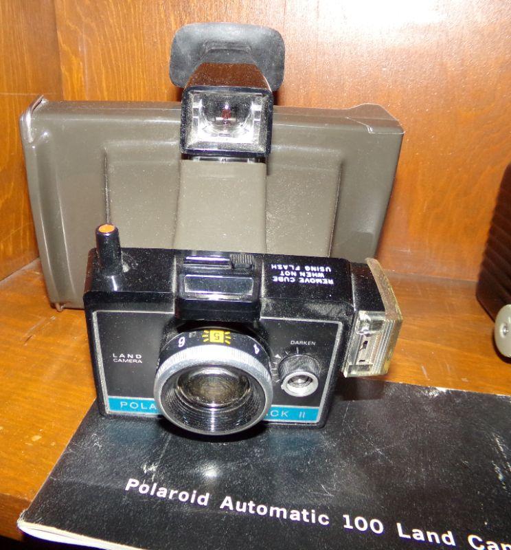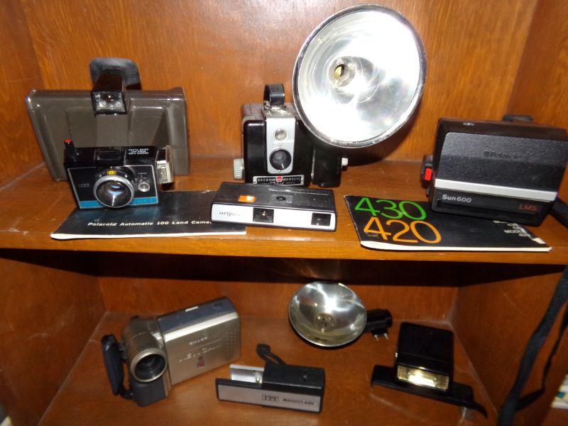 2 POLAROIDS, LAND CAMERA AUTOMATIC 100, KODAK EK4, SHARP VIEW CAM, BROWNIE HAWKEYE, KEYSTONE MOVIE CAMERA, FLASHES AND MOVIE LIGHTS