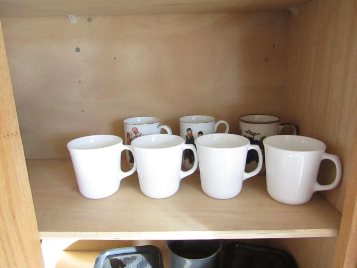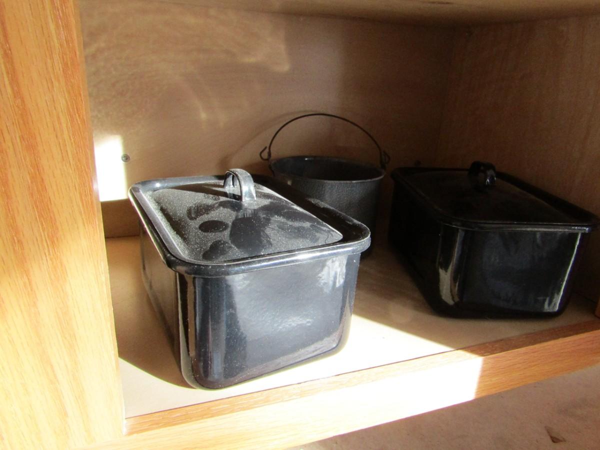 AN ASSORTMENT OF DINNER PLATES, COFFEE CUPS, 2 VINTAGE METAL PANS WITH LIDS, ENAMEL PAIL AND DISPOSABLE SILVERWARE WITH BOXES PARTIALLY FULL