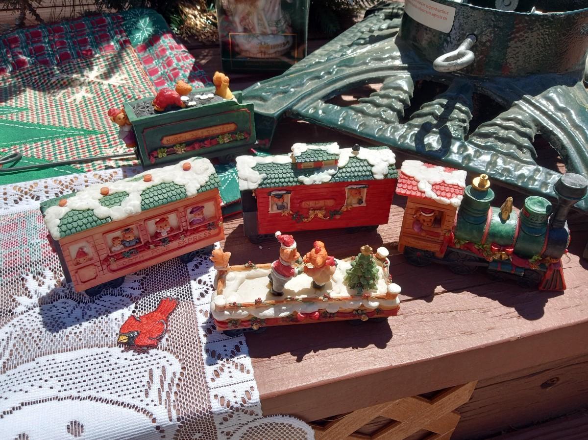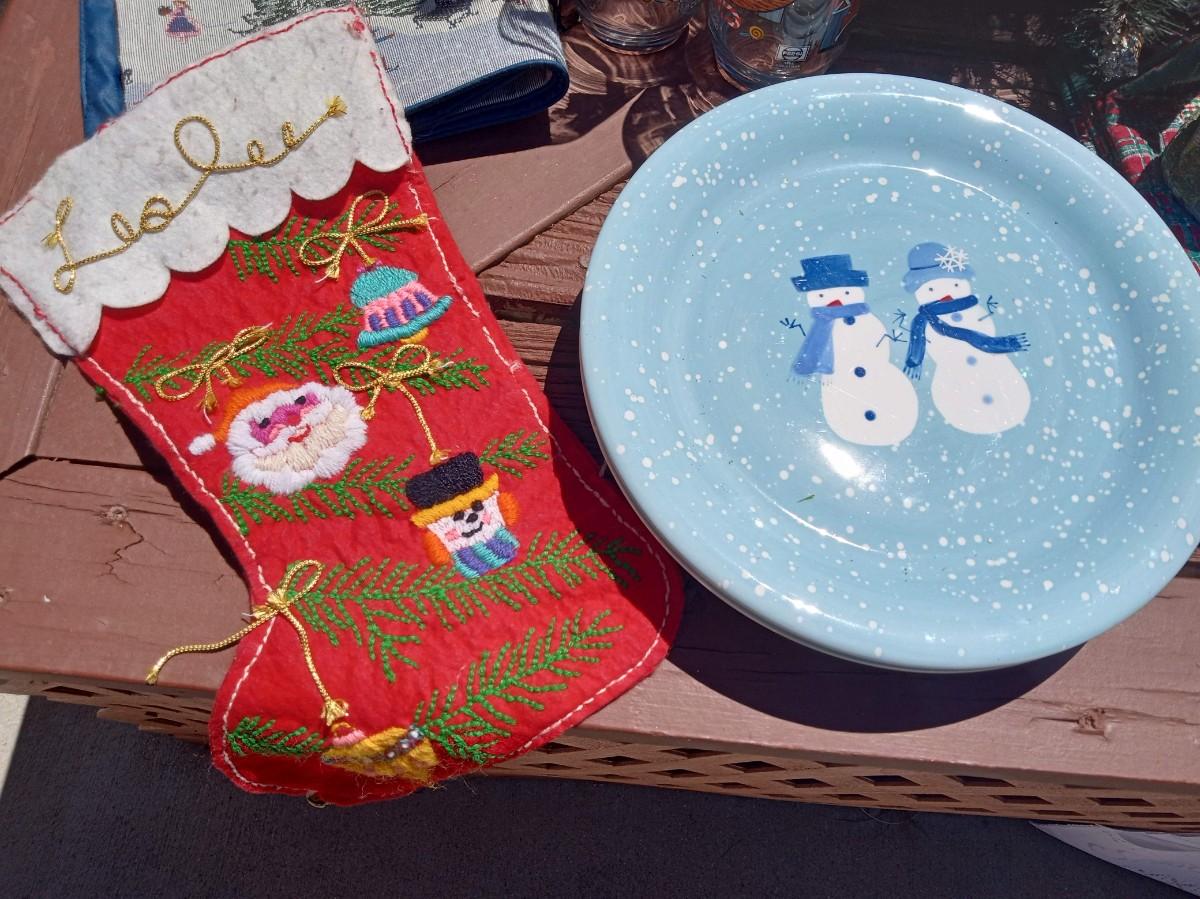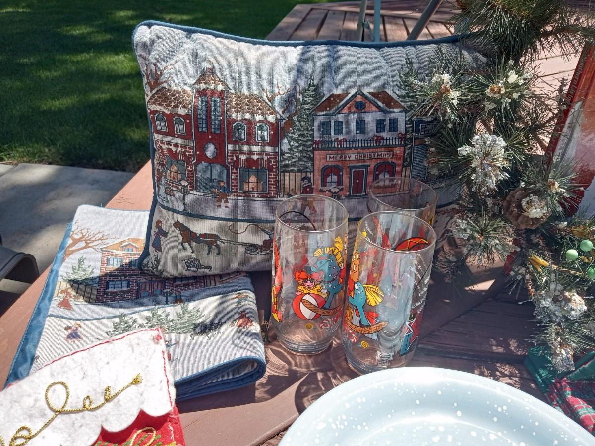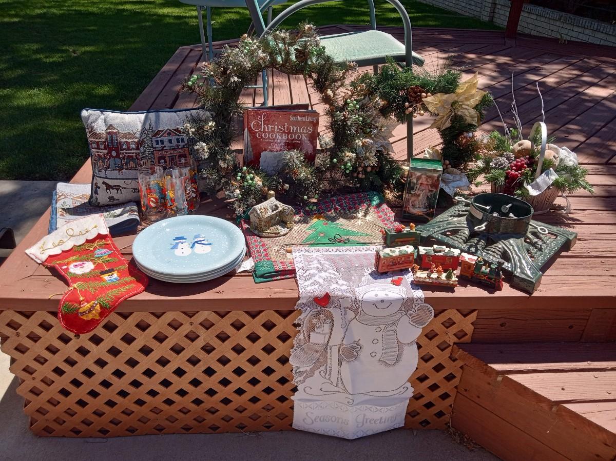 2 WREATHS, 4 DINNER PLATES, CLOTH SNOWMAN HANGING DECORATION, CAST IRON TREE STAND (IT IS HEAVY!!), THROW PILLOW, TABLE RUNNER, STOCKING, 3 GLASSES, 5 PC RESIN LIKE TRAIN SET, PLACEMATS, SMALLER COTTAGE, CHRISTMAS COOKBOOK, FOLIAGE IN A BASKET AND A FITZ AND FLOYD ANGEL