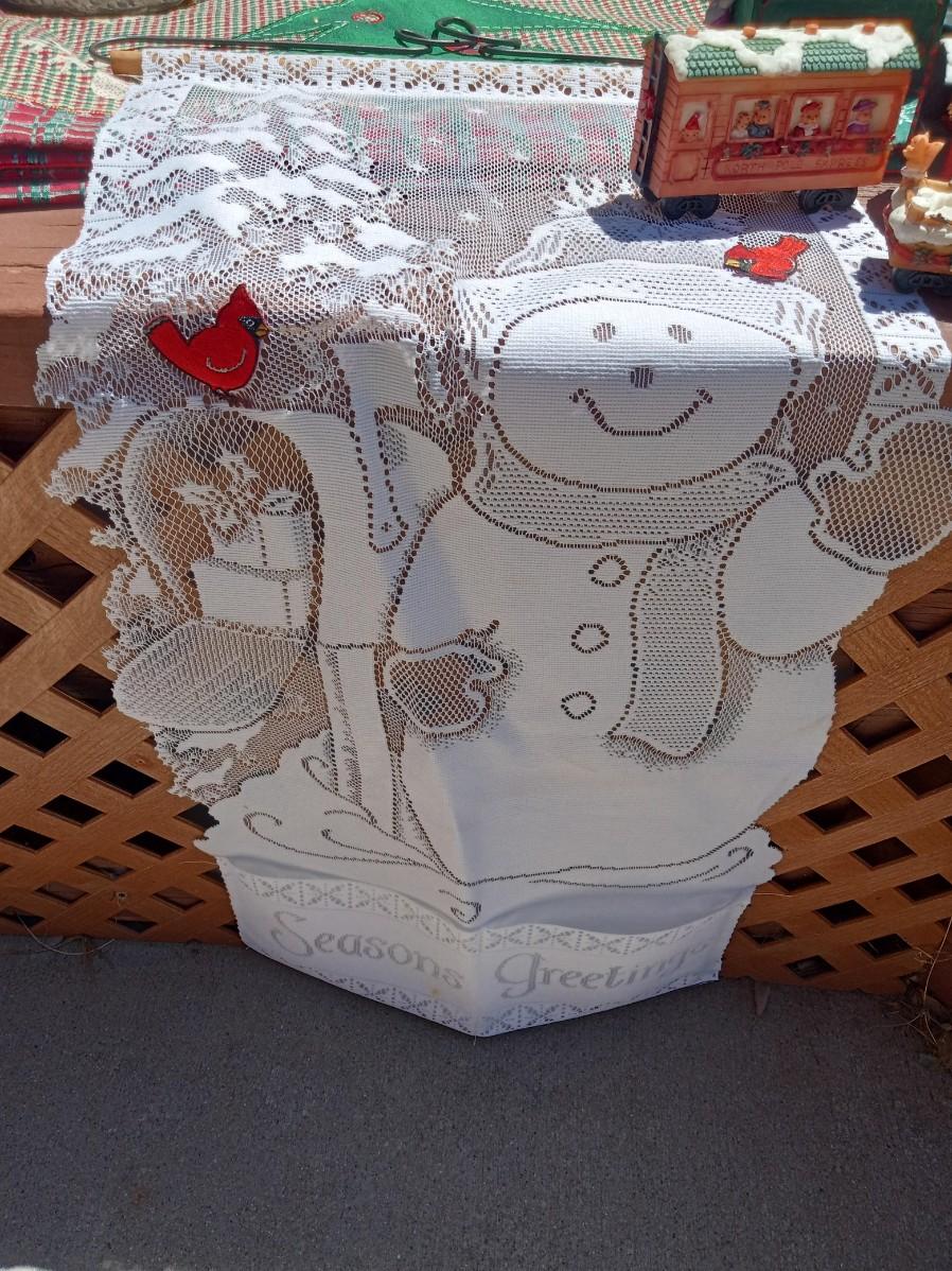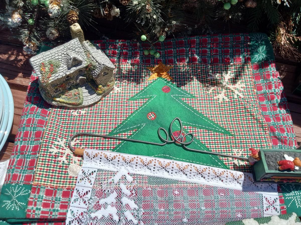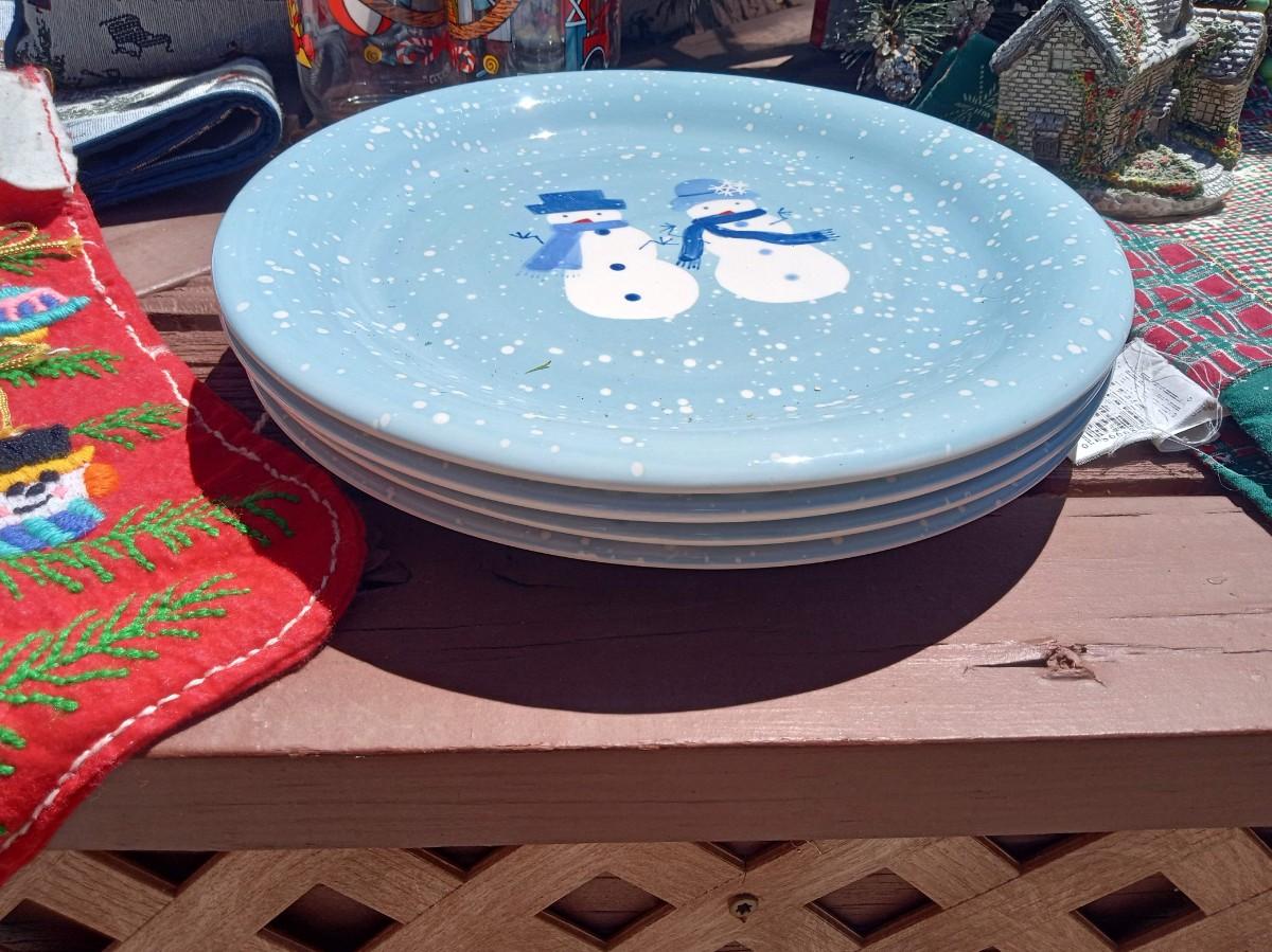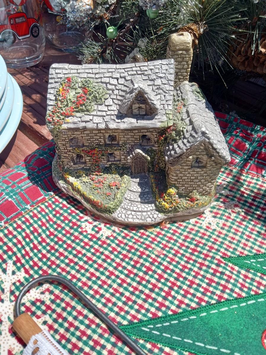 2 WREATHS, 4 DINNER PLATES, CLOTH SNOWMAN HANGING DECORATION, CAST IRON TREE STAND (IT IS HEAVY!!), THROW PILLOW, TABLE RUNNER, STOCKING, 3 GLASSES, 5 PC RESIN LIKE TRAIN SET, PLACEMATS, SMALLER COTTAGE, CHRISTMAS COOKBOOK, FOLIAGE IN A BASKET AND A FITZ AND FLOYD ANGEL
