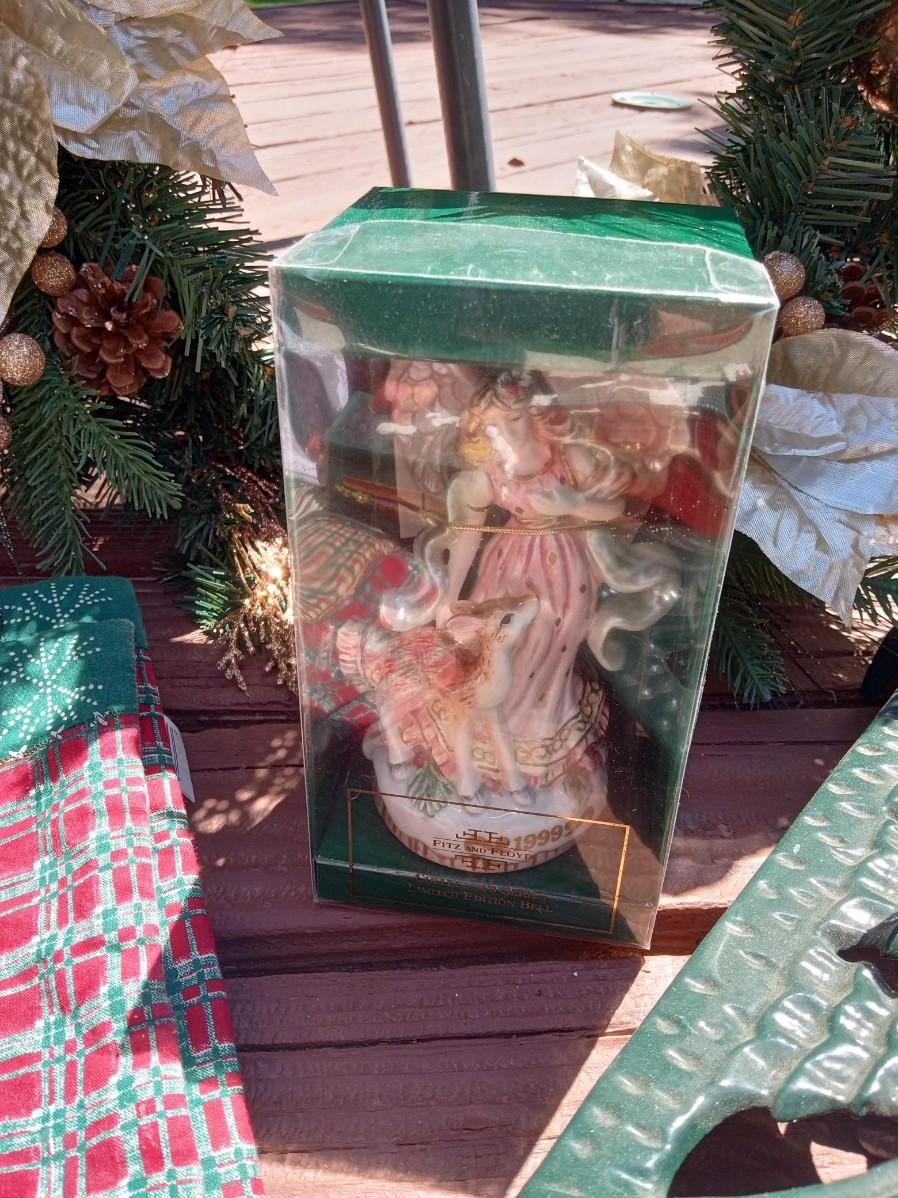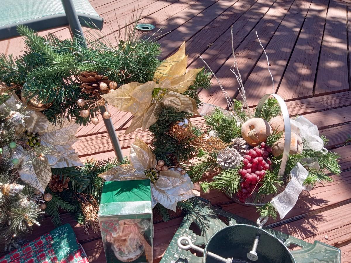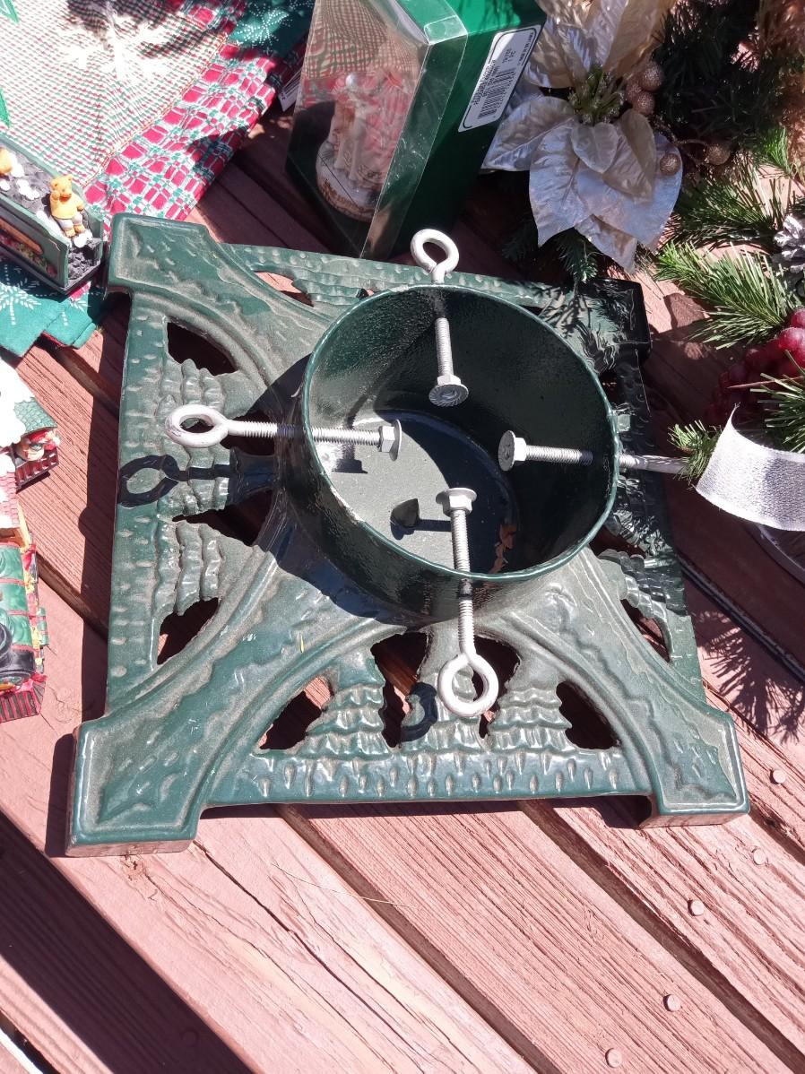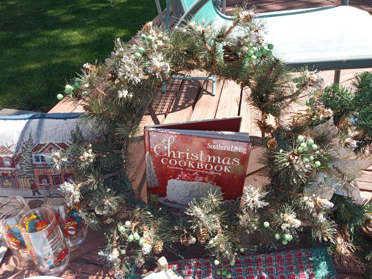 2 WREATHS, 4 DINNER PLATES, CLOTH SNOWMAN HANGING DECORATION, CAST IRON TREE STAND (IT IS HEAVY!!), THROW PILLOW, TABLE RUNNER, STOCKING, 3 GLASSES, 5 PC RESIN LIKE TRAIN SET, PLACEMATS, SMALLER COTTAGE, CHRISTMAS COOKBOOK, FOLIAGE IN A BASKET AND A FITZ AND FLOYD ANGEL
