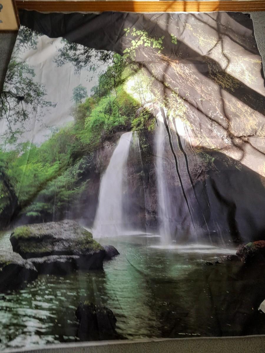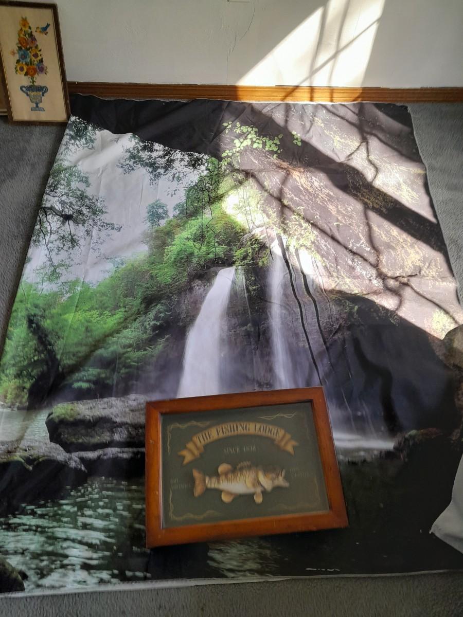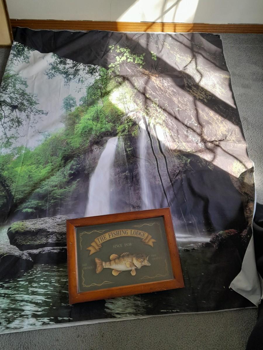 WOODS AND WATERFALL TAPESTRY 59" X 88" AND A 16" X 12" FRAMED THE FISHING LODGE WALL ART