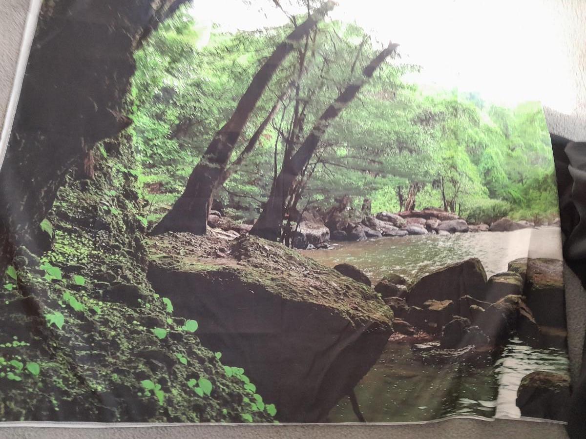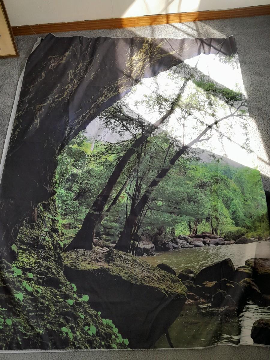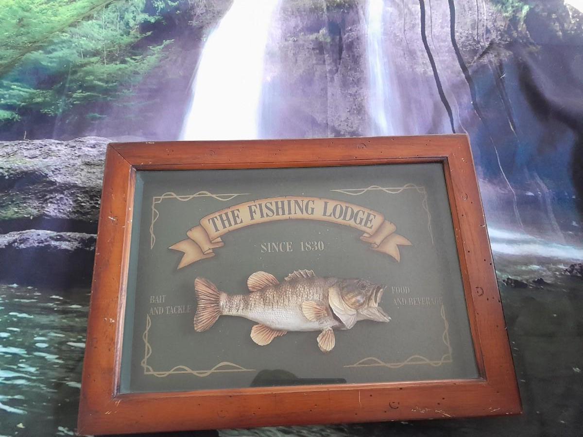WOODS AND WATERFALL TAPESTRY 59" X 88" AND A 16" X 12" FRAMED THE FISHING LODGE WALL ART