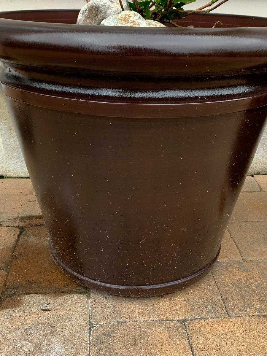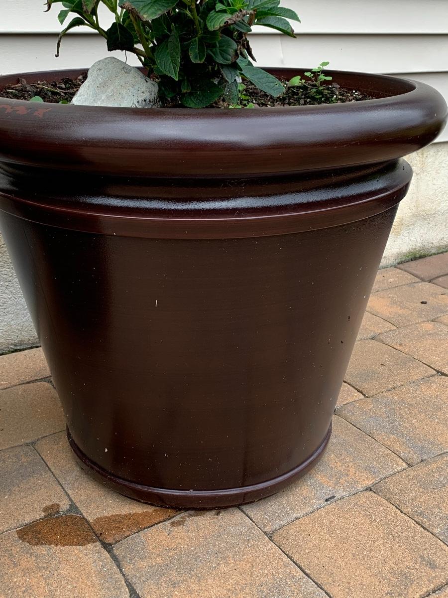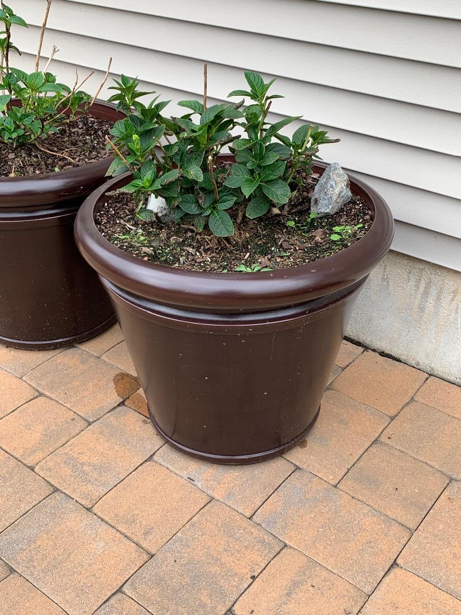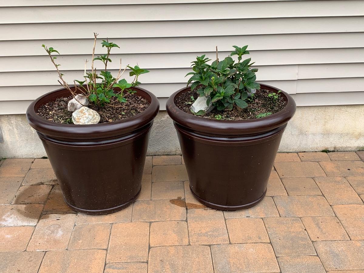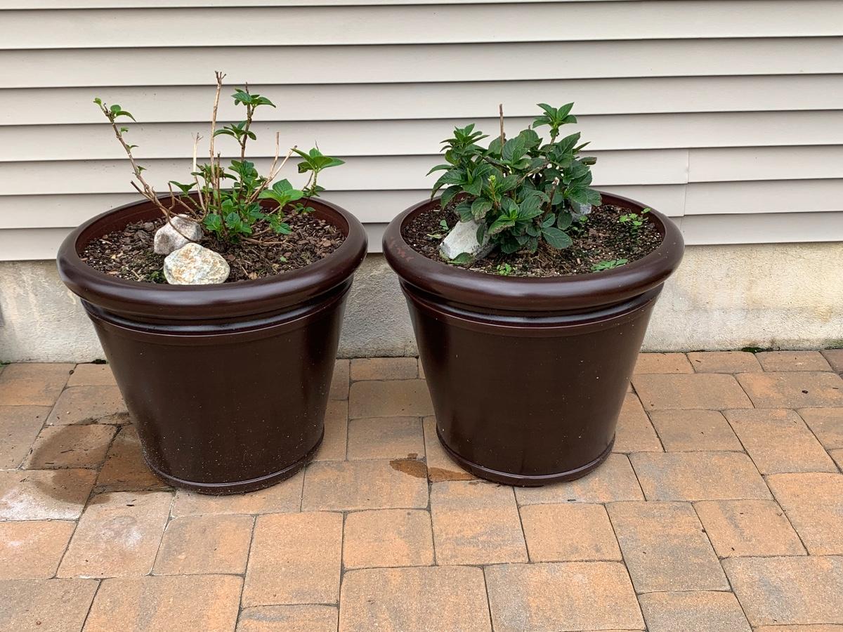 Large, heavy planters with plants (unknown).