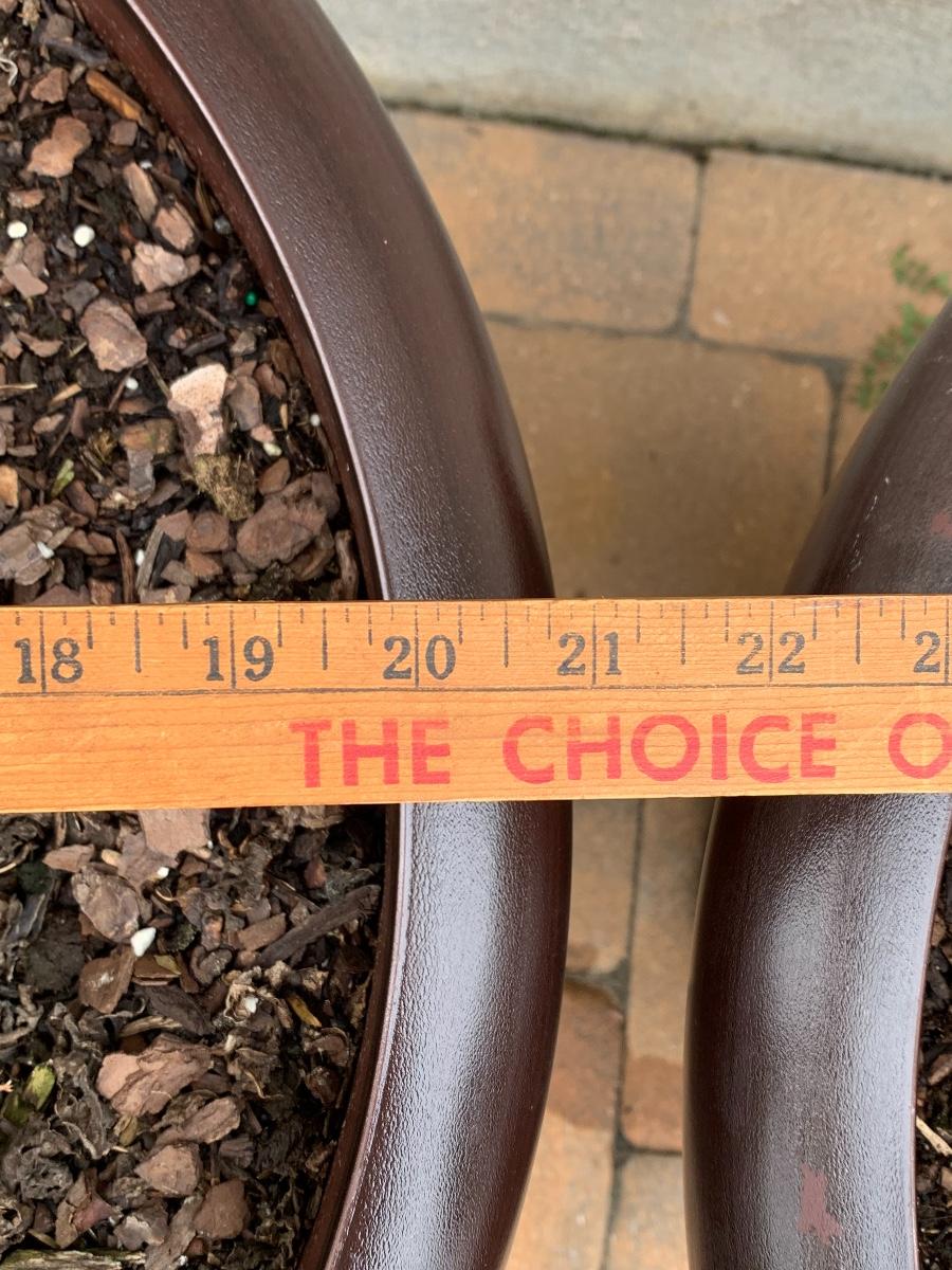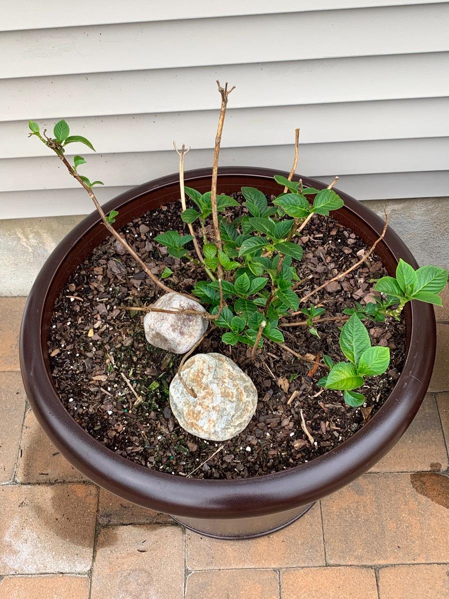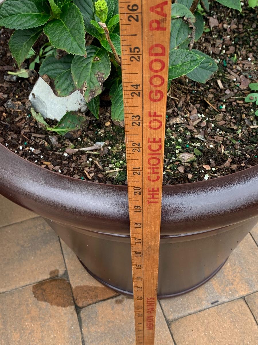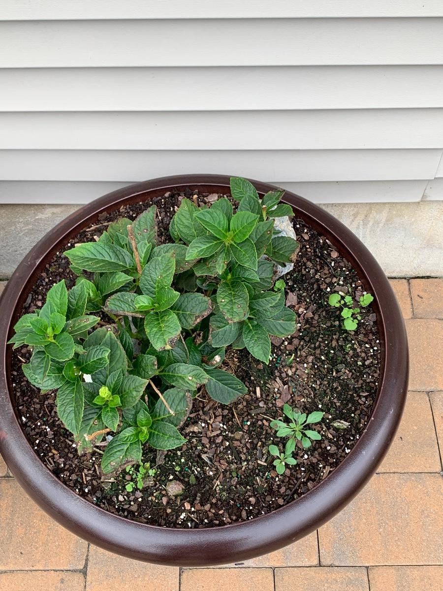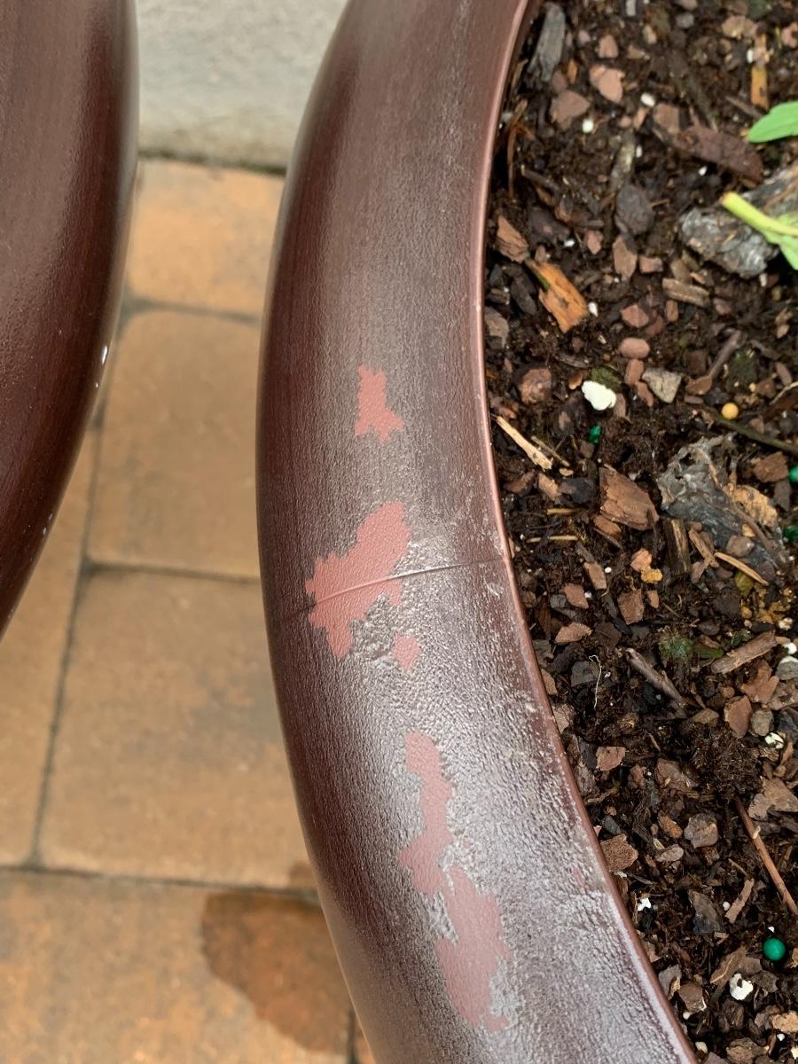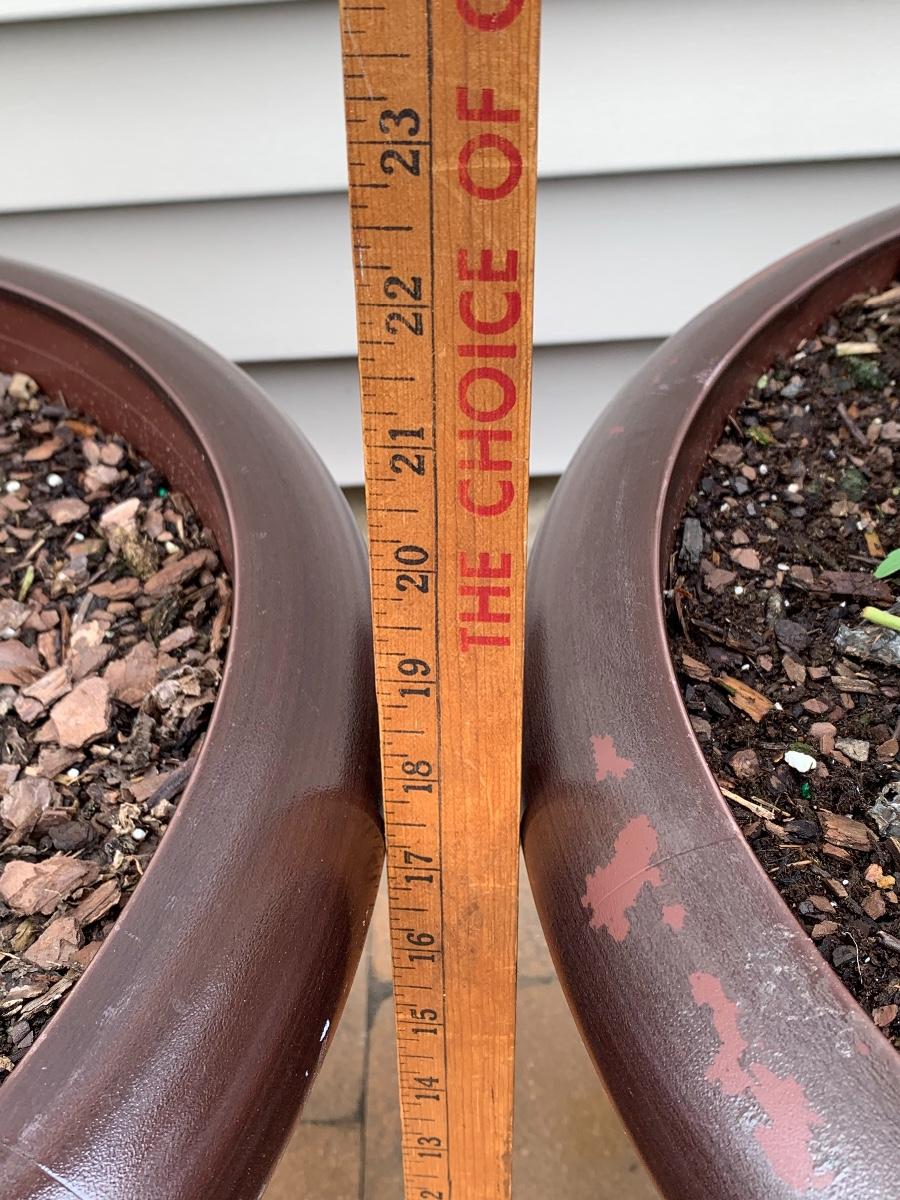 Large, heavy planters with plants (unknown).