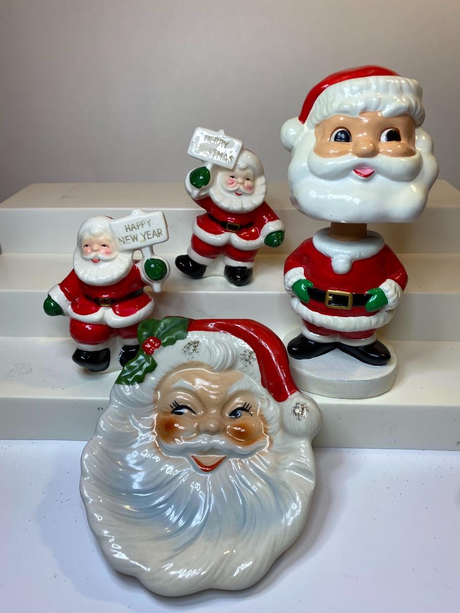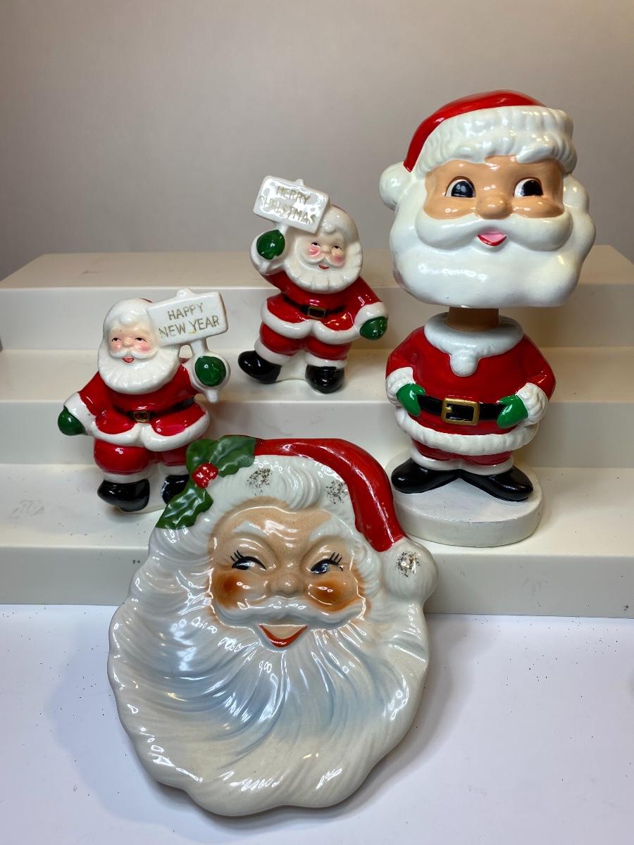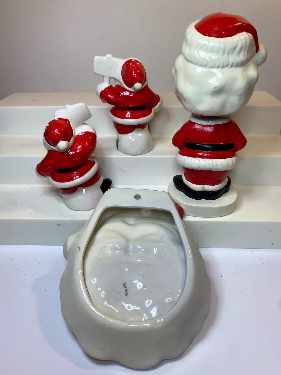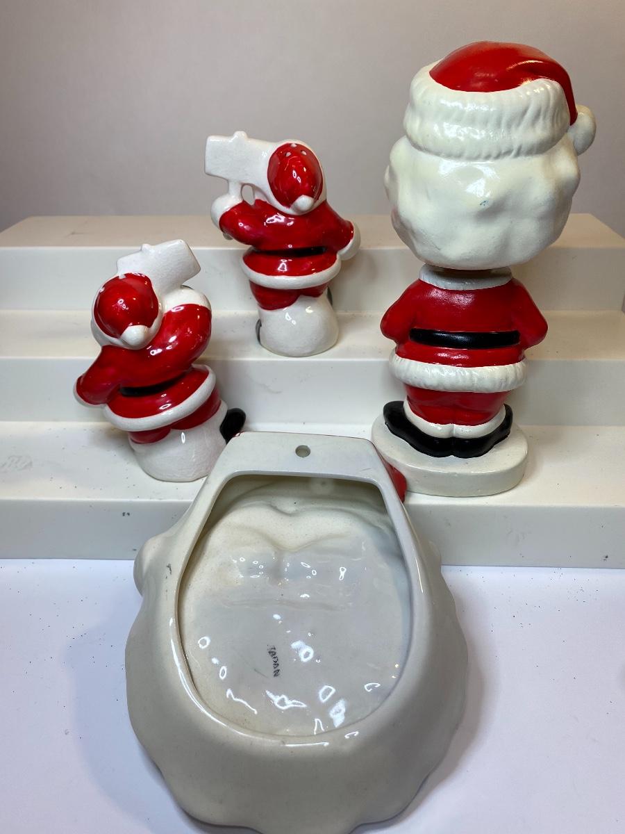 Made in Japan vintage Santa bobble head, salt and pepper shaker and plaque. The pictures show condition, measurements if taken, and what is included in the lot. Due to the large amount that we photograph and the time frame, we are not always able to take measurements. All items unless noted, are pre-owned and have been used, and are untested. Thank you.