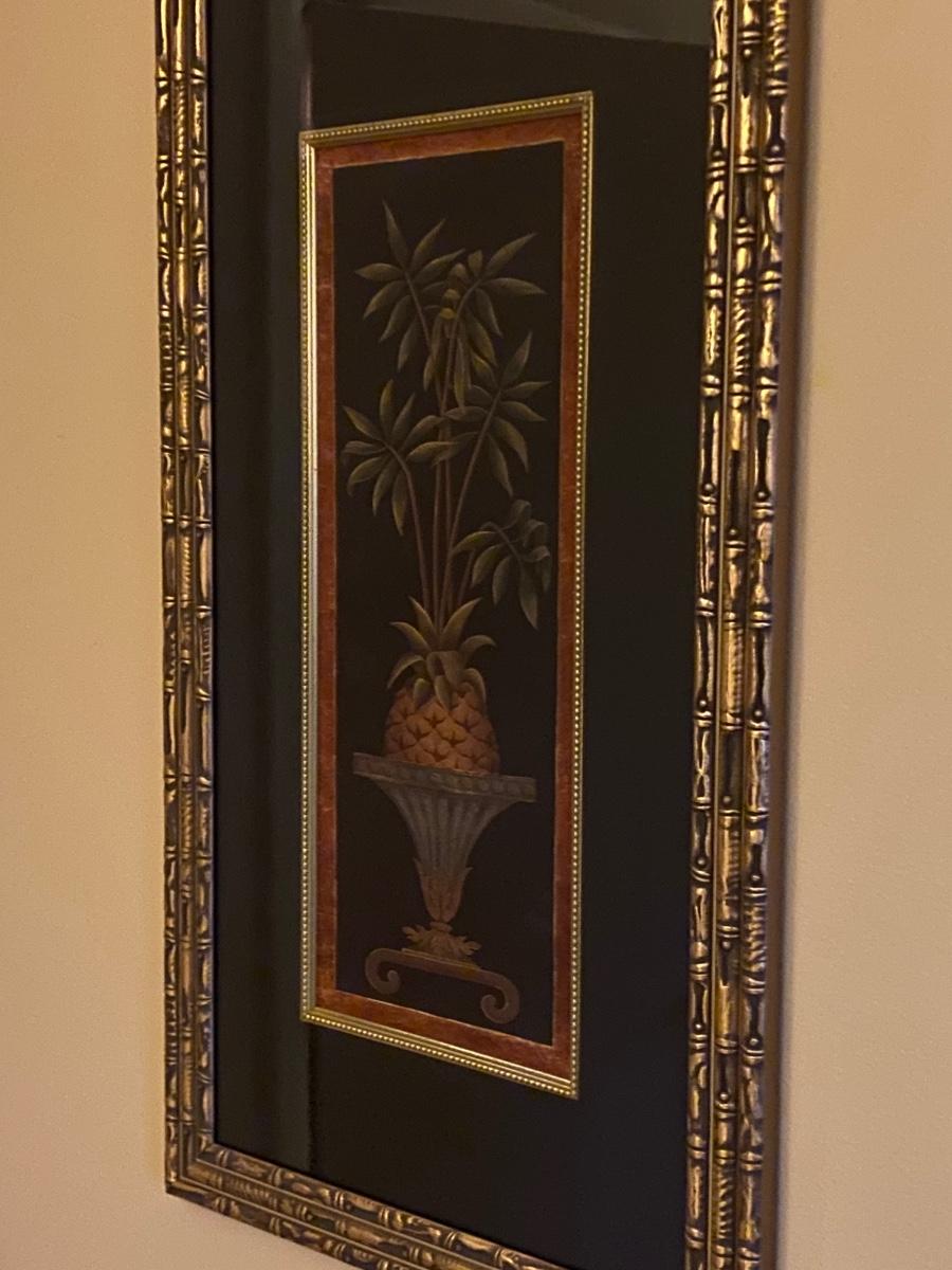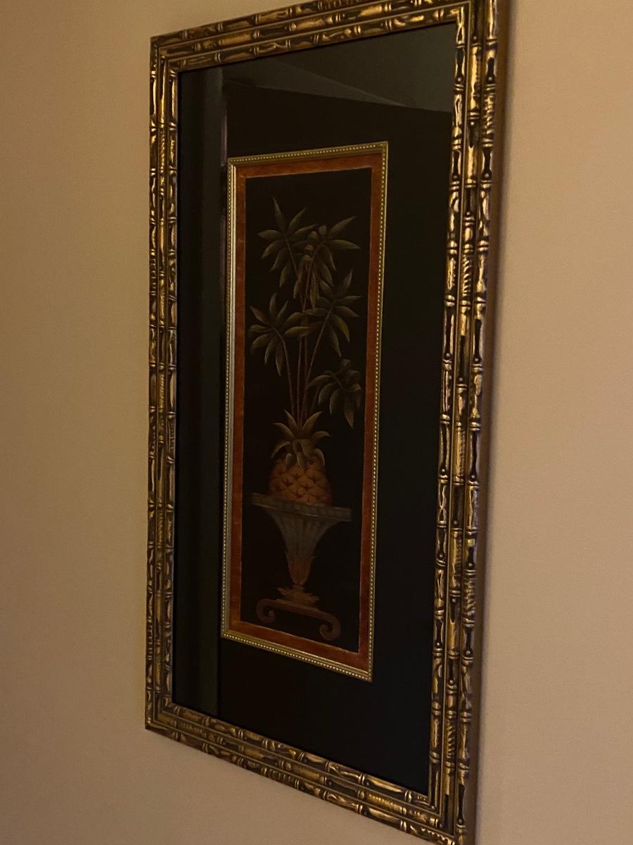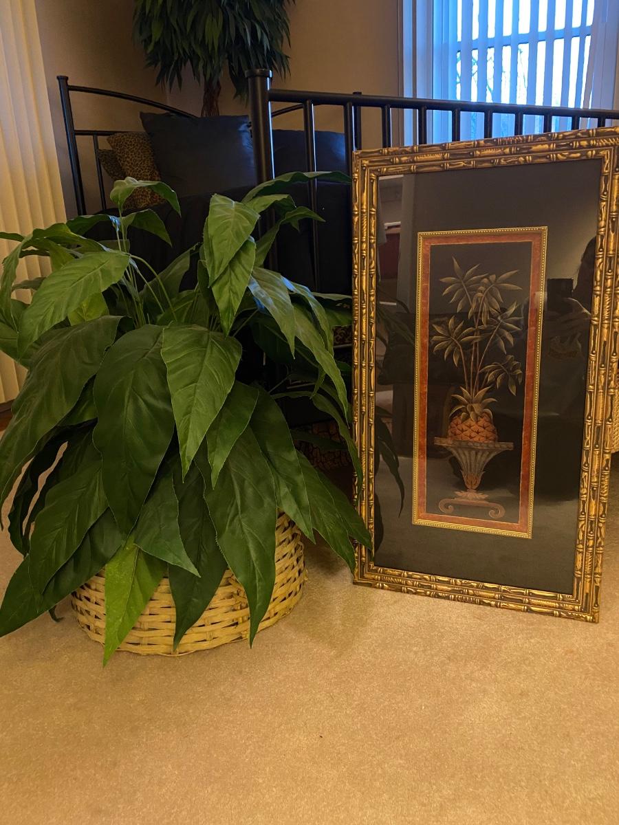 Artificial plant in a basket and framed art. Print measures 17”x 31”.