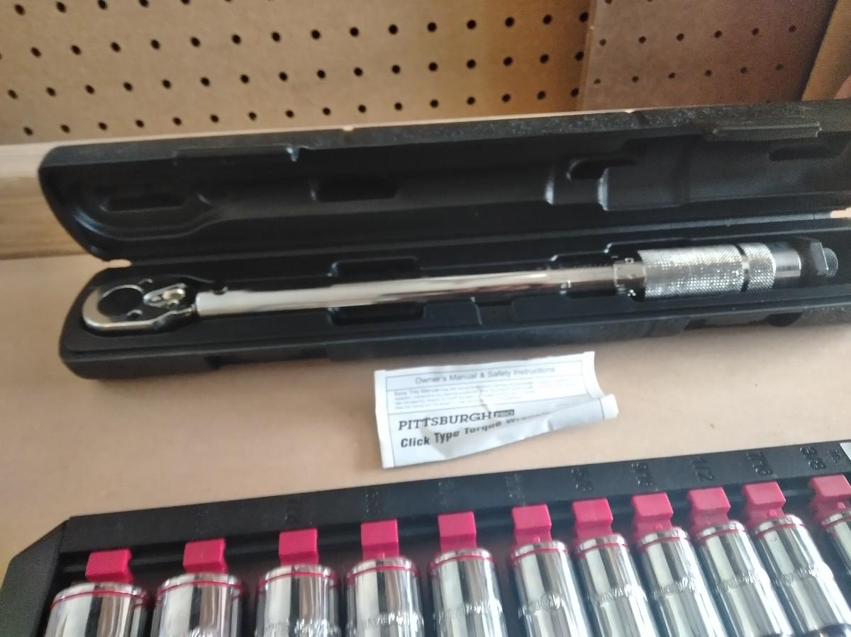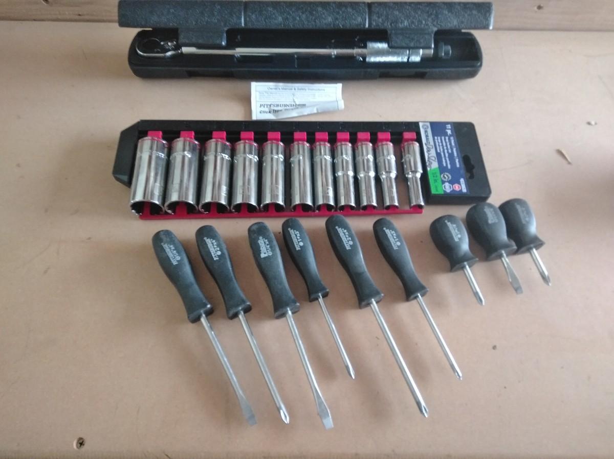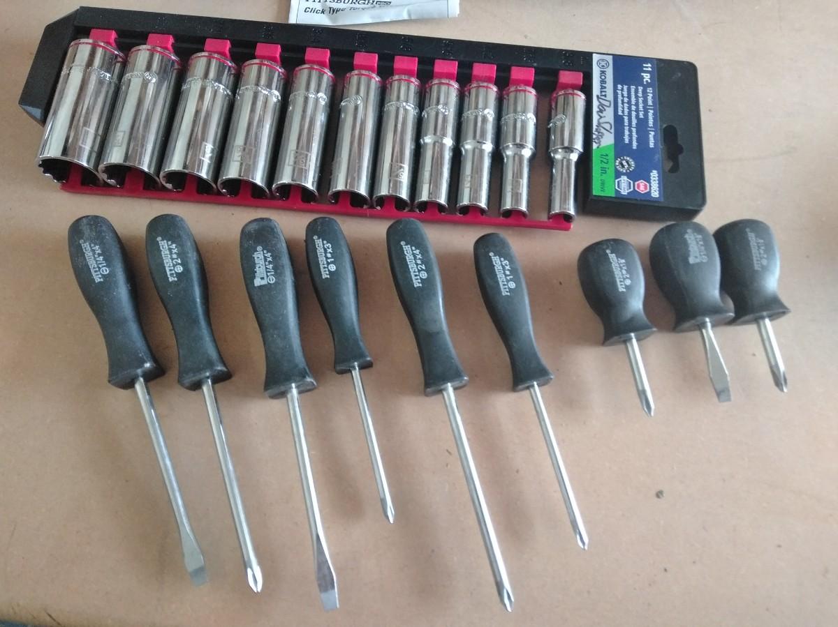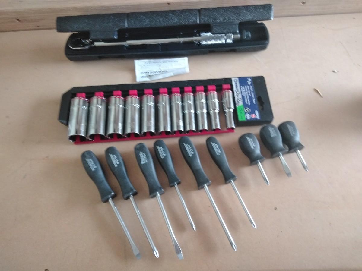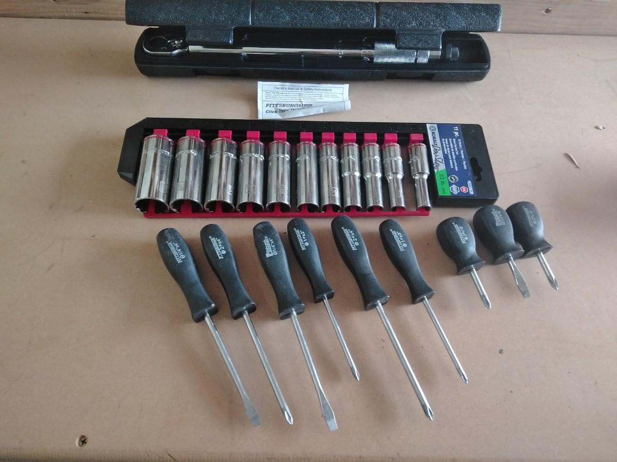 1/2" KOBALT 12 POINT DEEP SOCKET SET, TORQUE WRENCH AND A SET OF SCREWDRIVERS