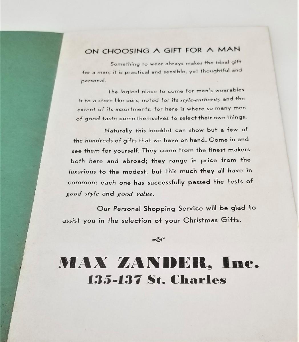 1930's Christmas Gift catalog - 8 pages - from Max Zander, Inc., 135-137 St. Charles (New Orleans). Color illustrations - check out the prices for gift for "gentlemen of discerning tastes." Great condition.