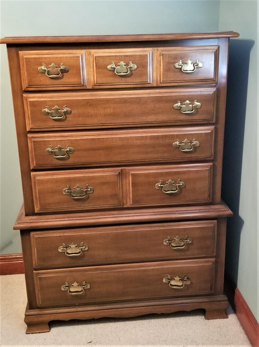 Vintage Dixie Furniture Company Saybrook Maple Chest of Drawers - nice condition - 6 drawers, brass hardware. 40" across, 54.5" tall, 19 " deep. Solid wood.