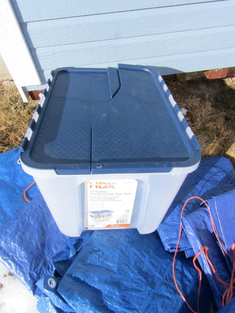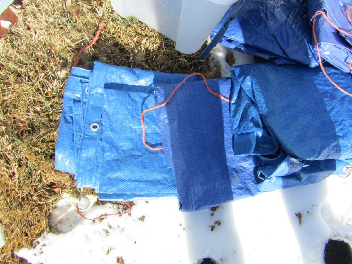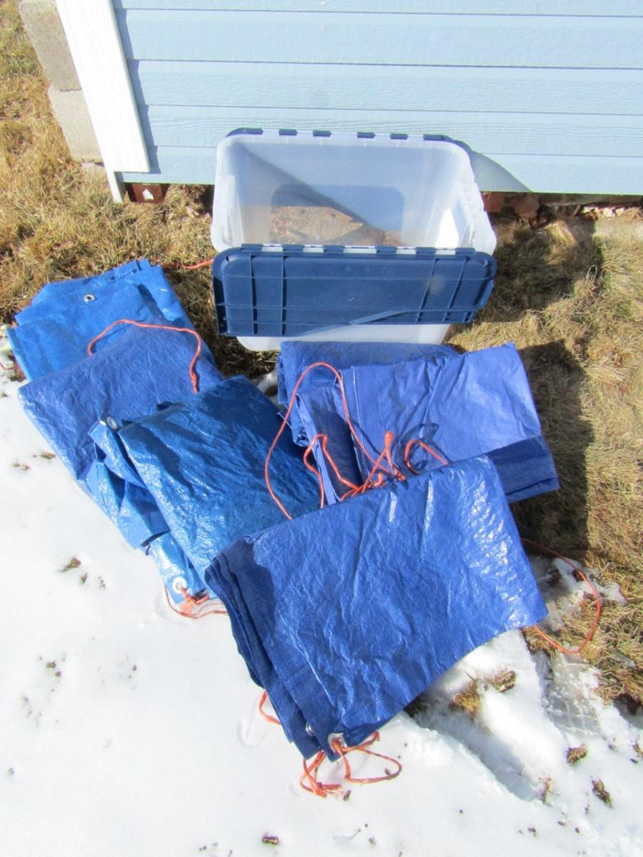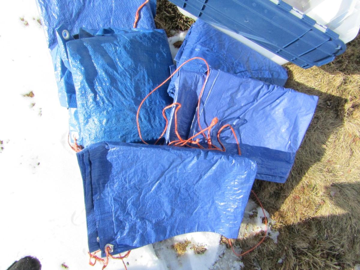 LOT 347 SIX BLUE TARPS AND A STORAGE CONTAINER