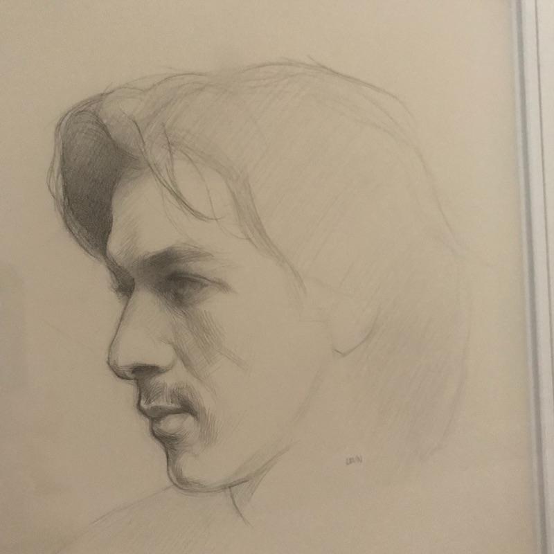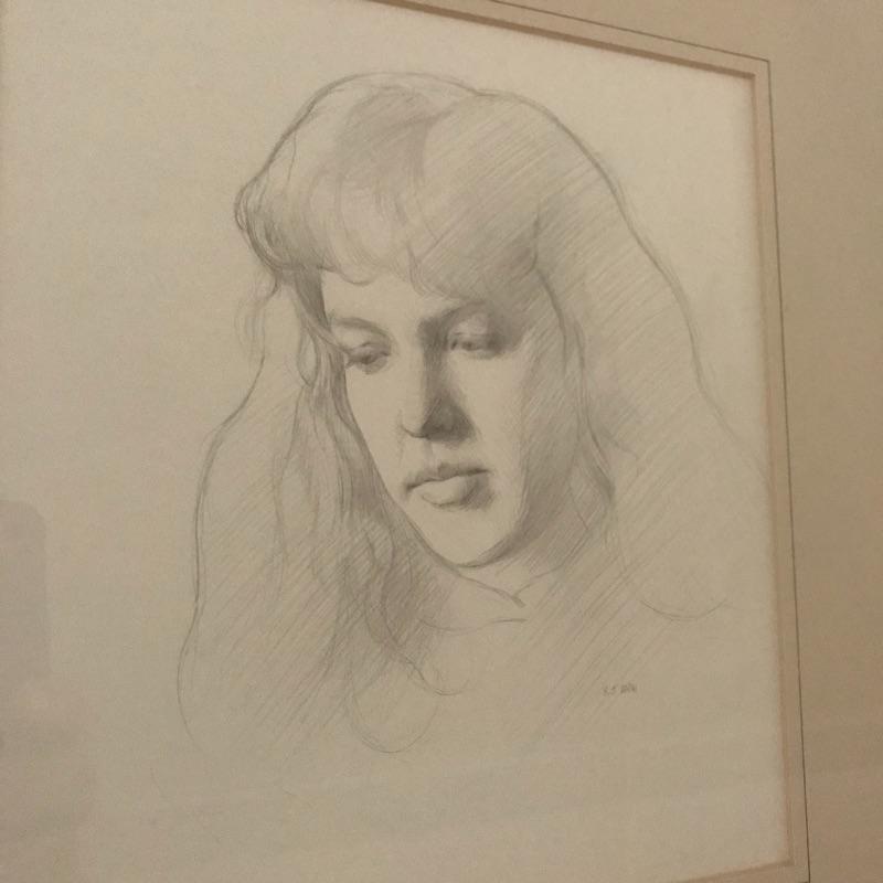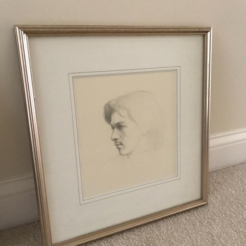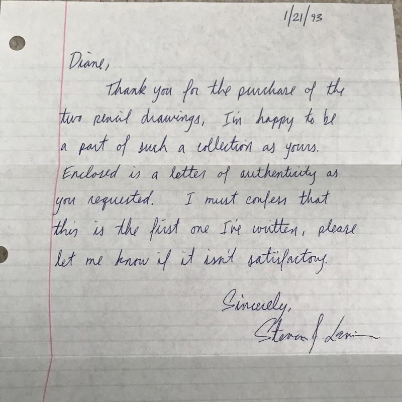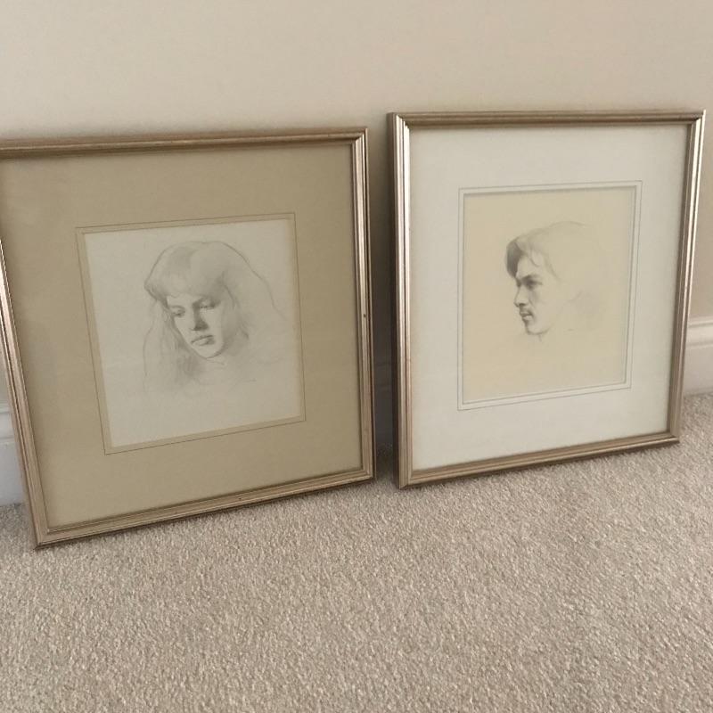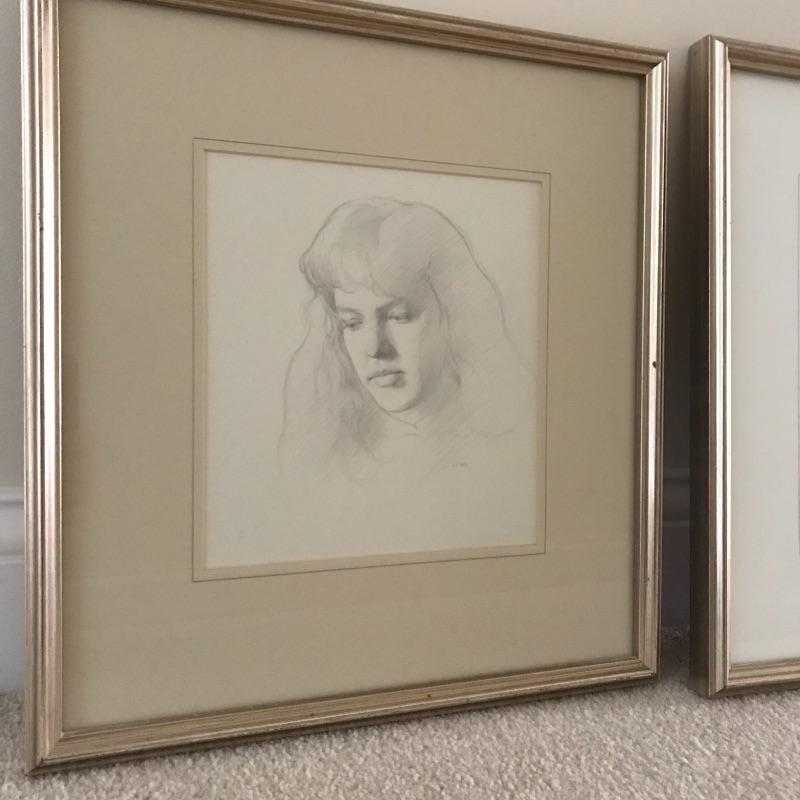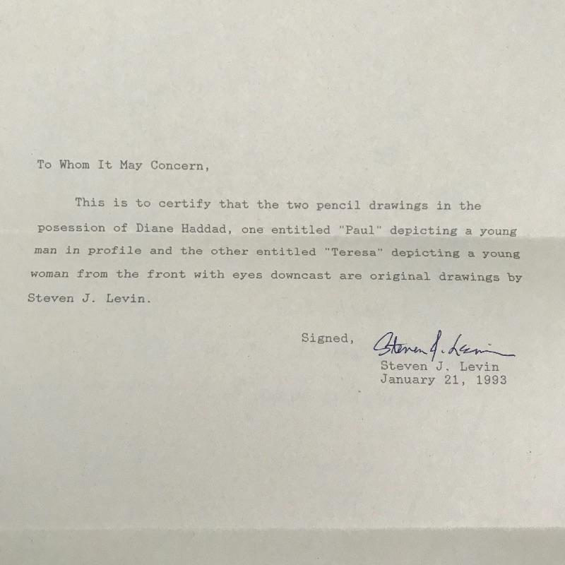 “Teresa” and “Paul” pencil art by Steven J. Levin with personalized note and certification from artist. These beautiful portraits with talented details and shading noticed more and more each time you look at them! The “Teresa” frame is 14” x 15” and the “Paul” frame is 14.75” x 16”. Both drawings are behind glass and frames appear to be metallic colored painted wood.