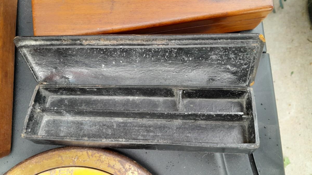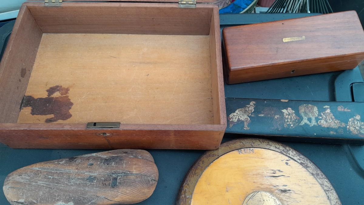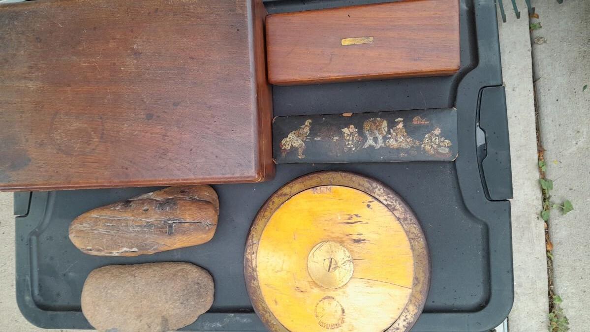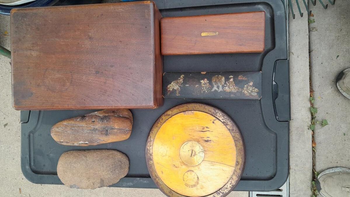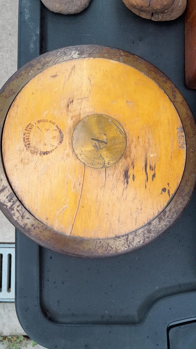 VINTAGE LINDESBERG TRACK AND FIELD WOOD IRON DISKUS WITH WOODEN BOXES AND POSSIBLE ARTIFACTS