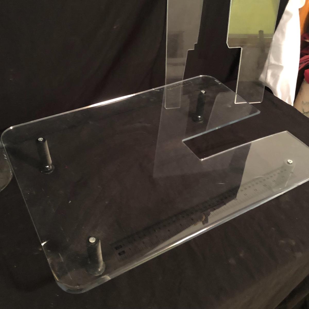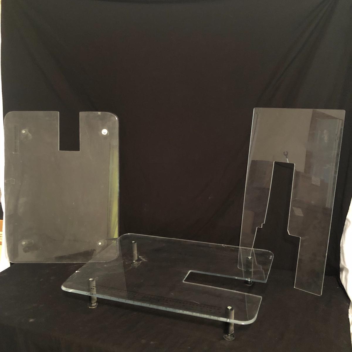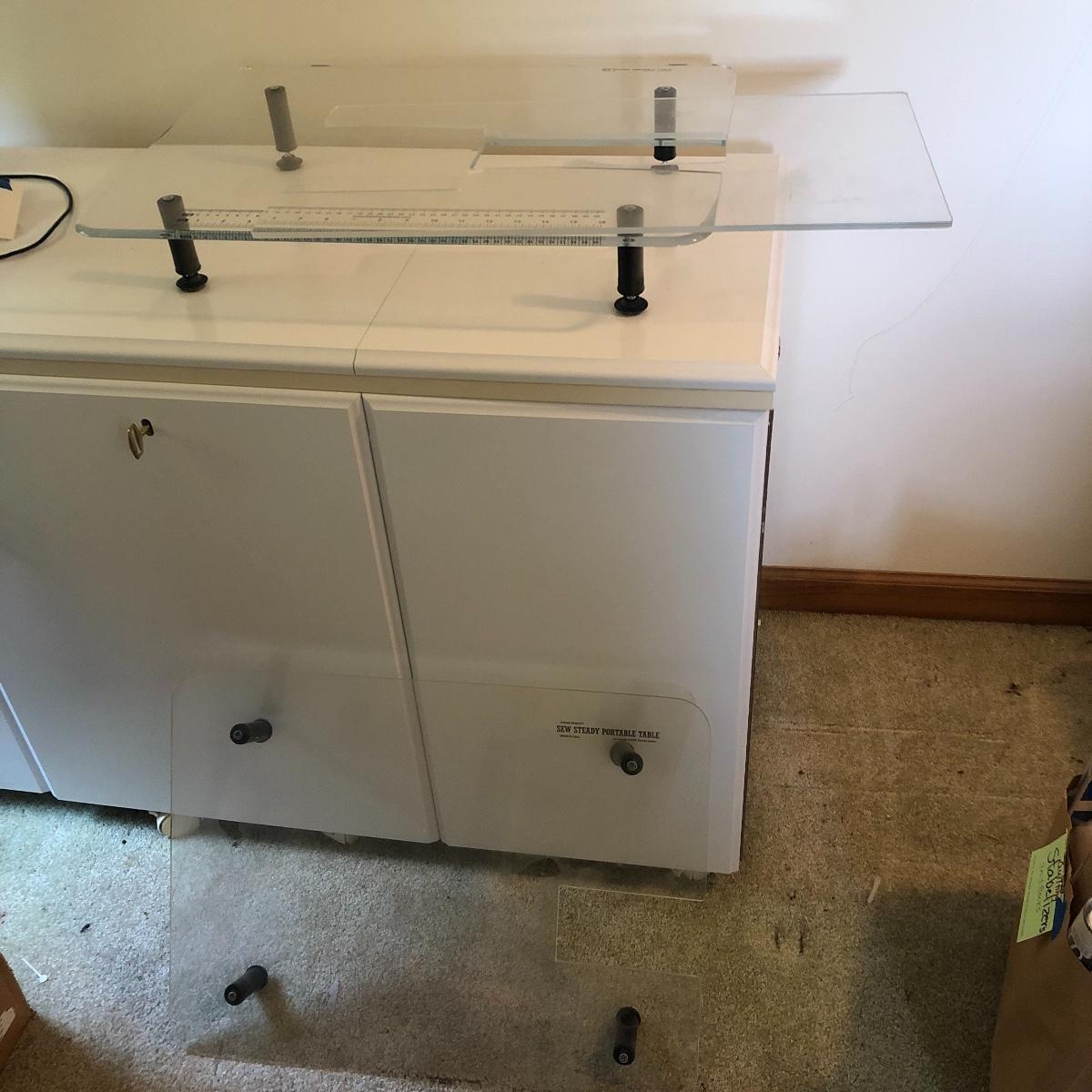 Sew on the go with this lot. It contains two portable acrylic tables and a piece which looks as if it helps to extend them. White cabinet in image is not included. Local pick up only.