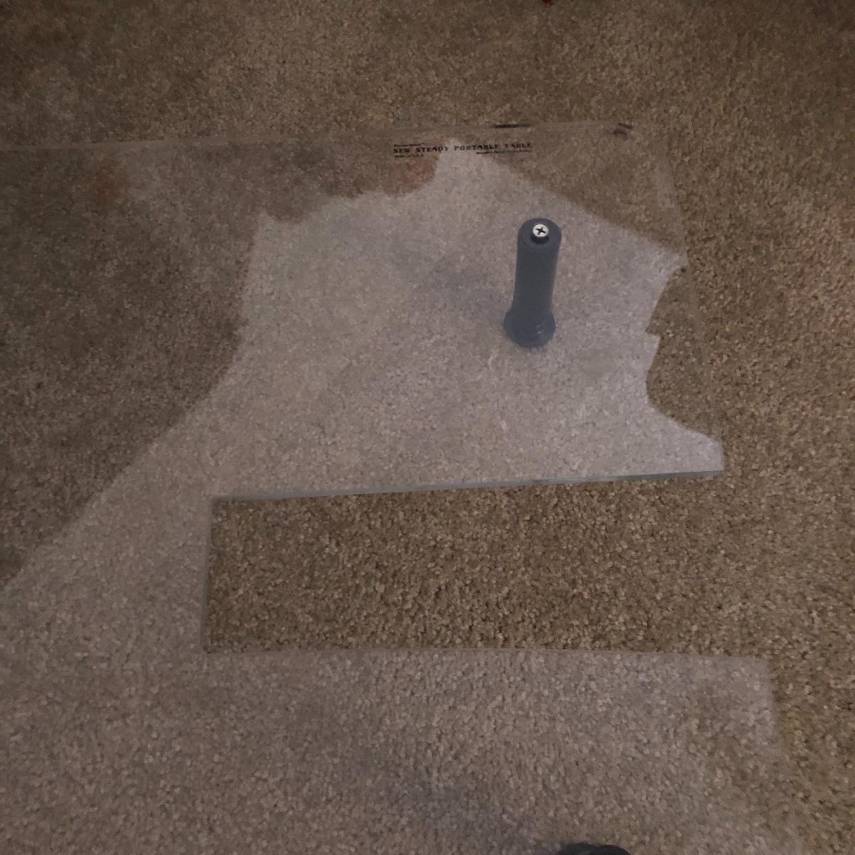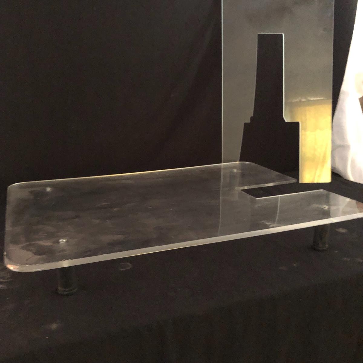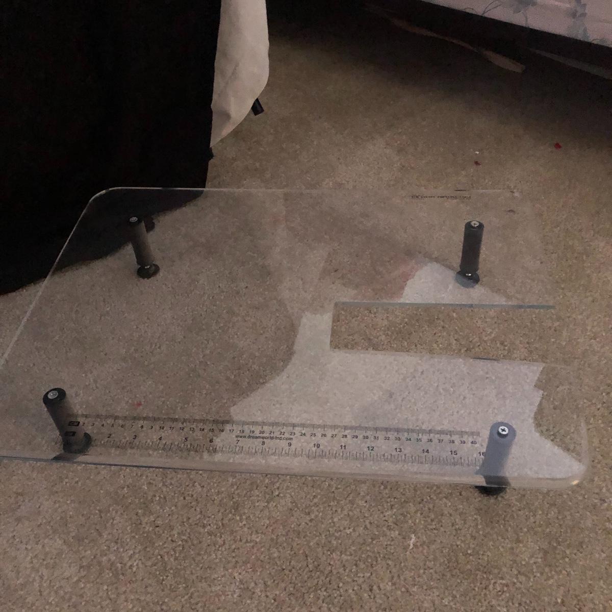 Sew on the go with this lot. It contains two portable acrylic tables and a piece which looks as if it helps to extend them. White cabinet in image is not included. Local pick up only.
