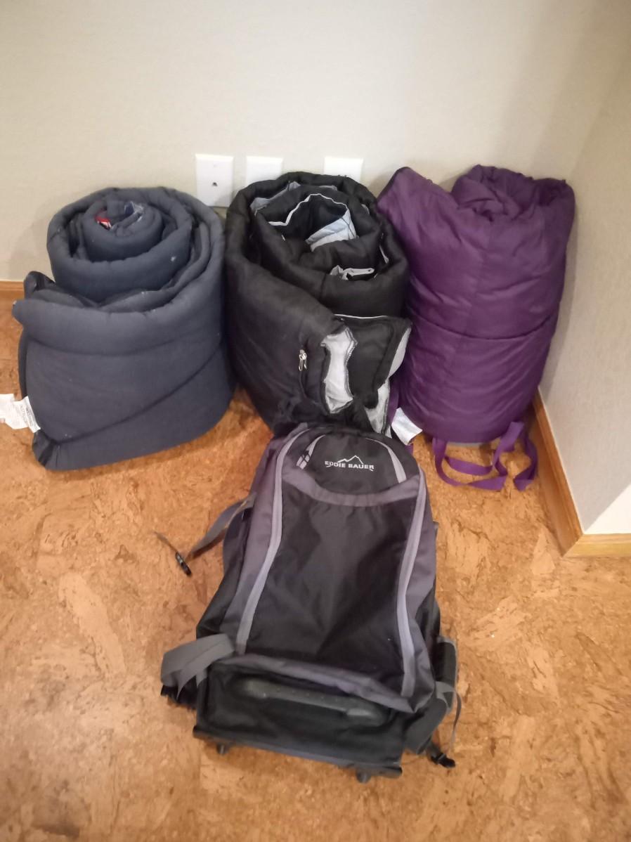 LOT 348 THREE SLEEPING BAGS AND A BACKPACK ON 2 WHEELS (HD)