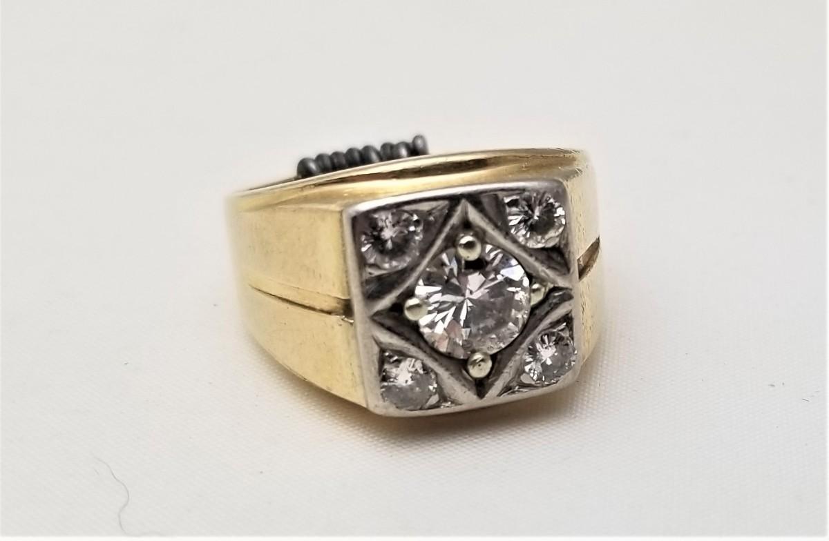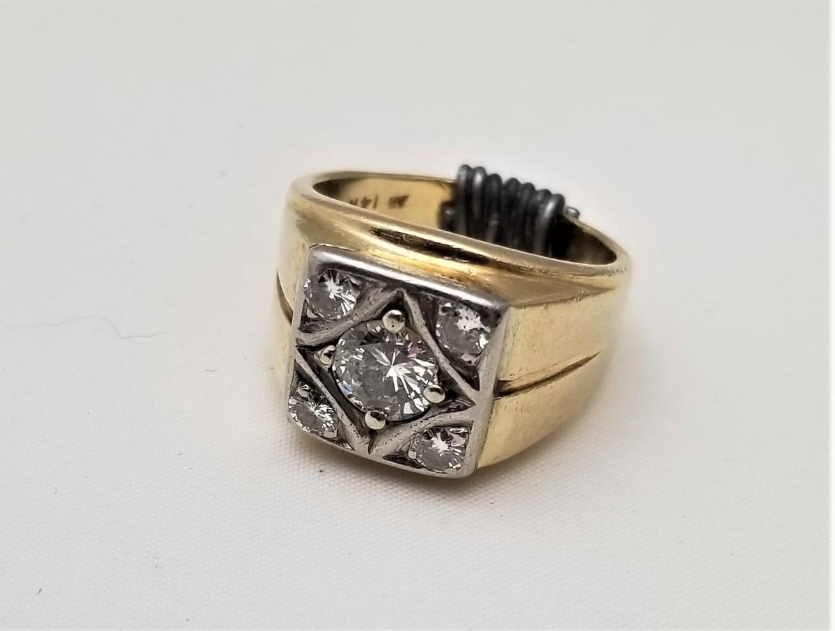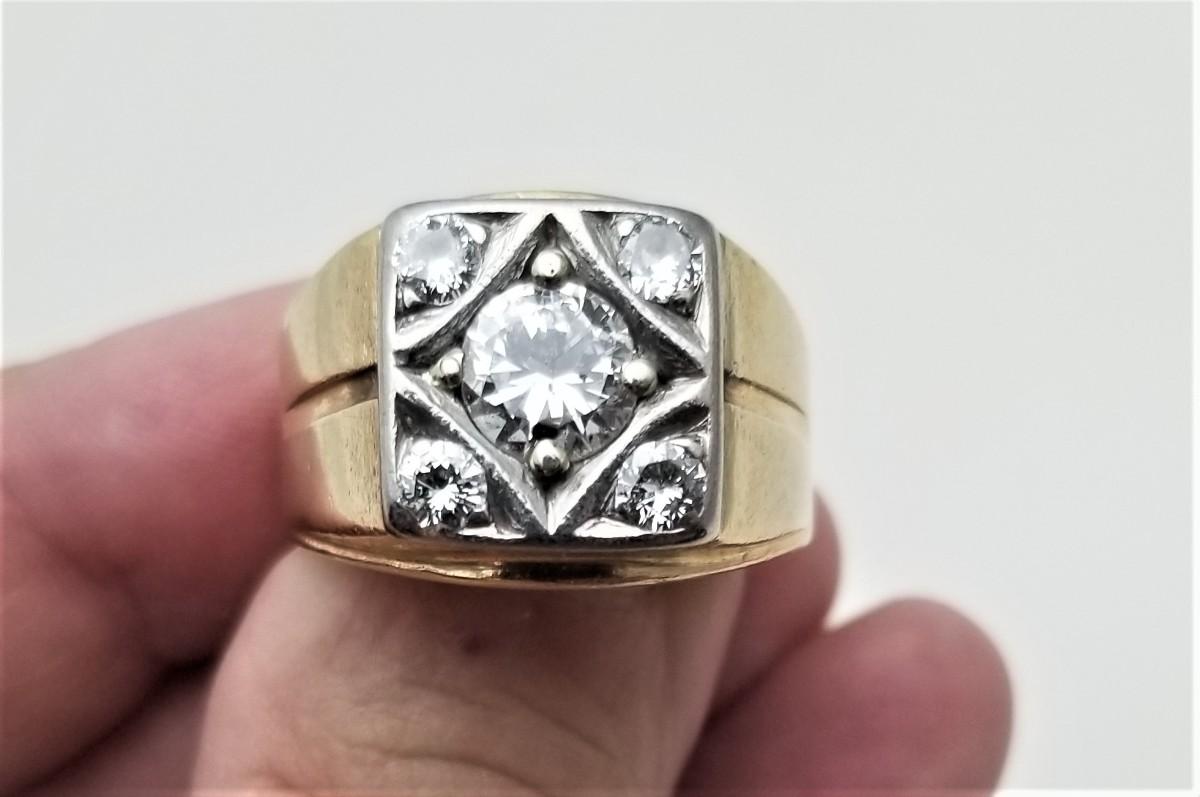 Men's Vintage 14kt yellow gold (marked and tested) Diamond ring - size 8 - has an old wire-wrapped sizer so you probably could take this up to an 8.5. Large Center diamond surrounded by four smaller diamonds. We had it checked out - center stone approximately 3/4 carat - with the smaller stones it adds up to at least 1 carat total weight. Center stone was graded an "I" - there are several occlusions - also, you can feel with your fingernail a very slight chip along one edge of the large stone next to one of the prongs - you need a high powered loop to see it. Still a very handsome ring. A jeweler has given us a firm offer of $800.00 for this piece, but before we sell we would like to offer it to our customers.
