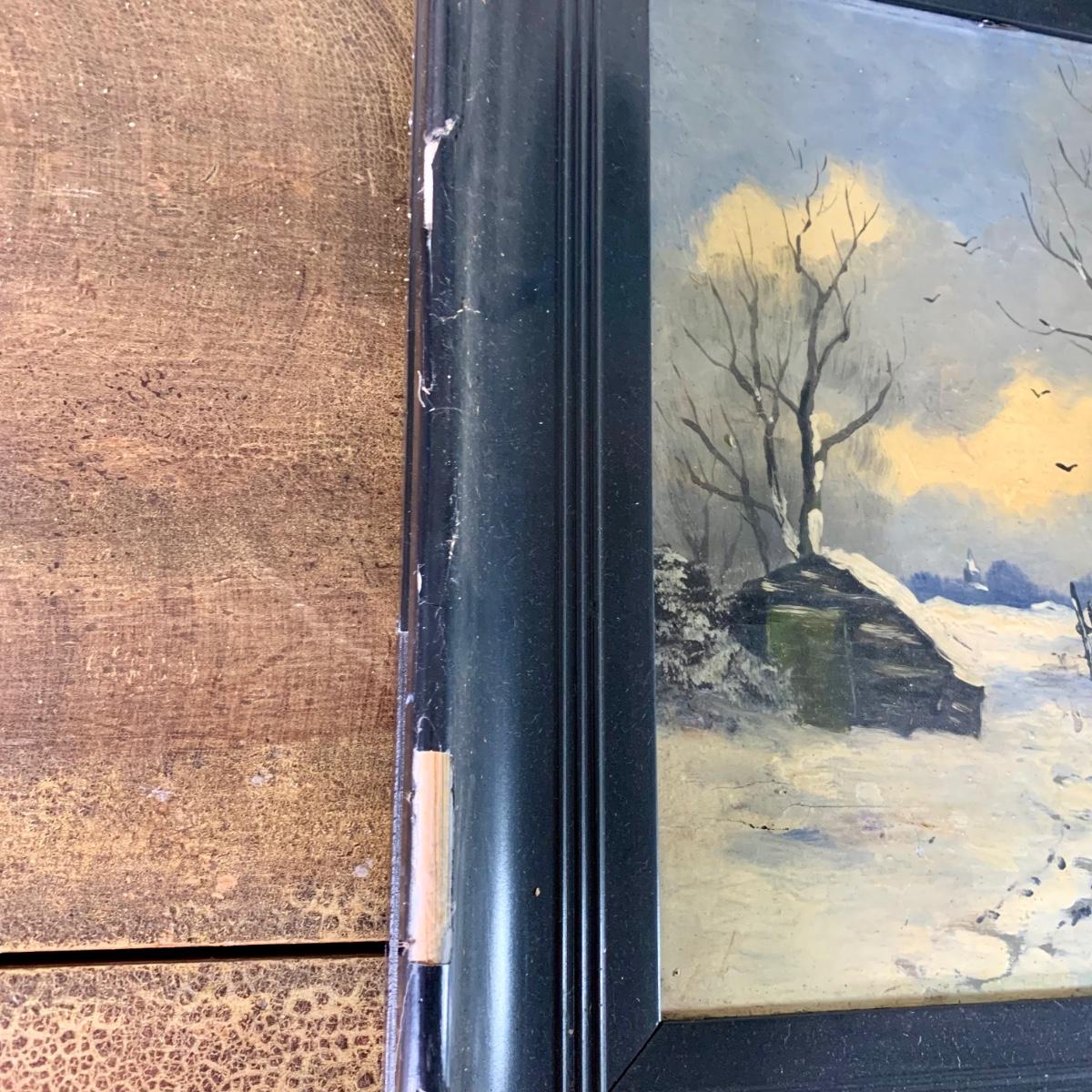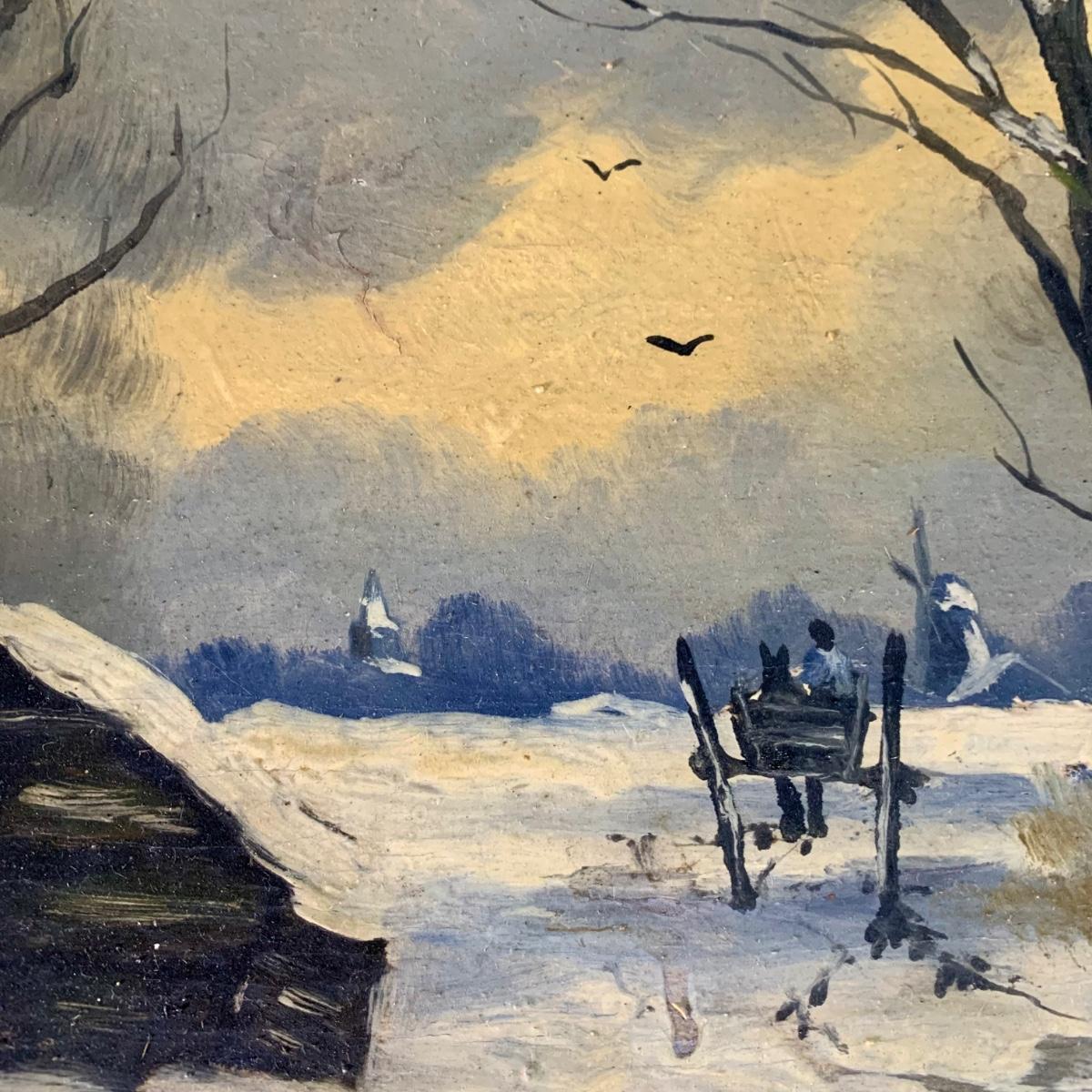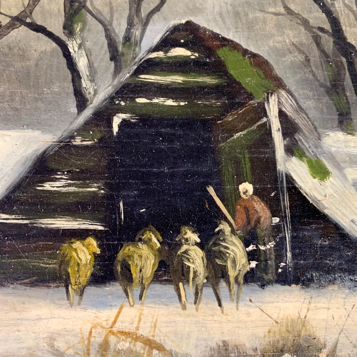 LOT 348 Z: Framed & Signed Oil Painting: Winter Landscape w/ Sheep Herder & Horse Carriage