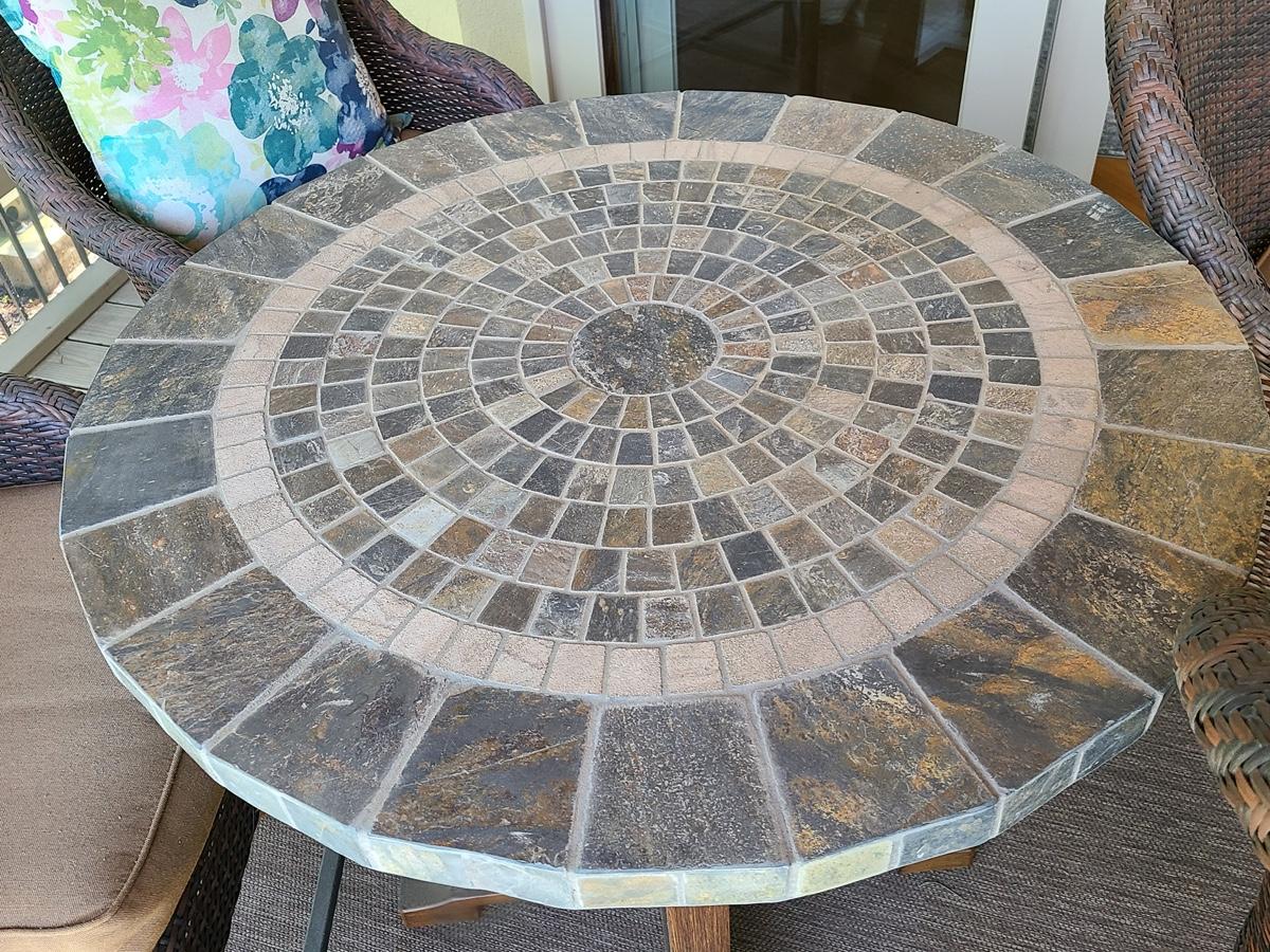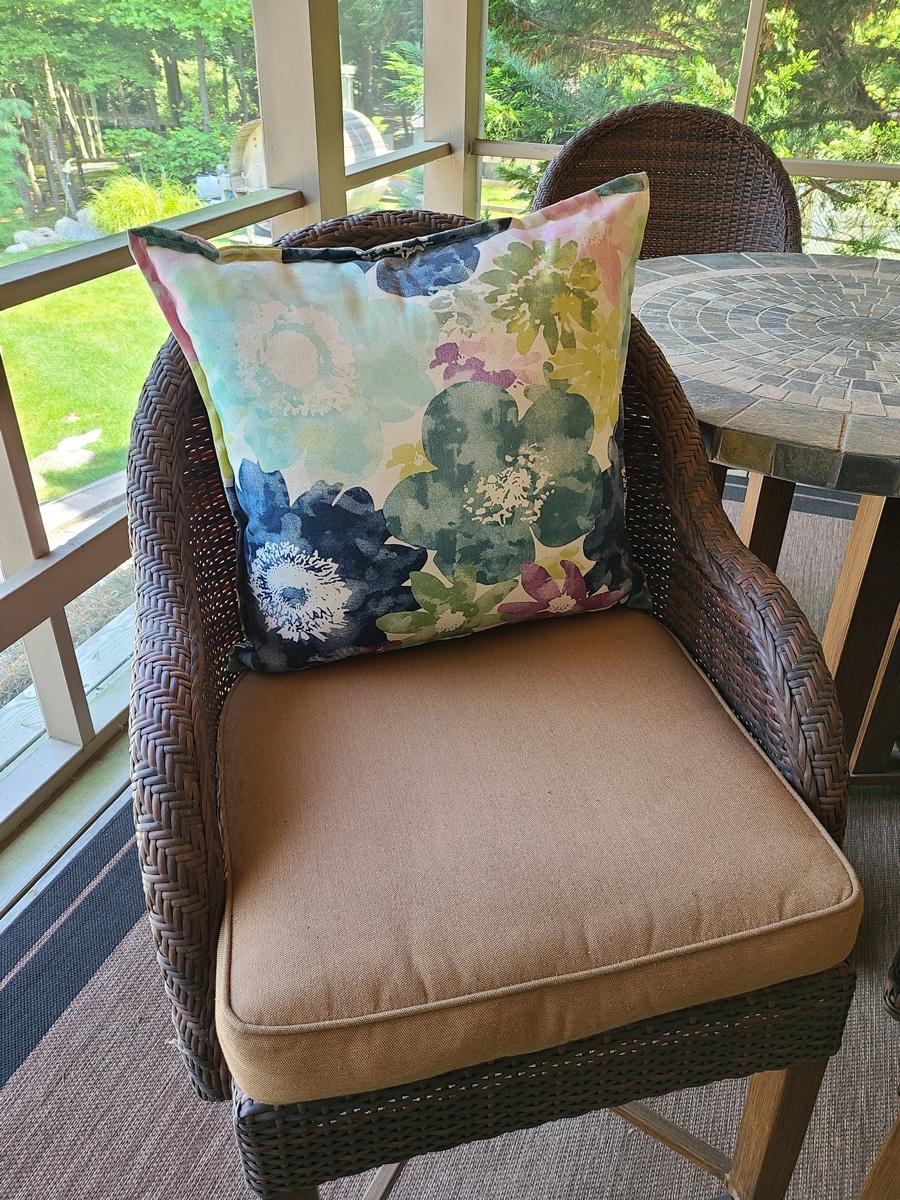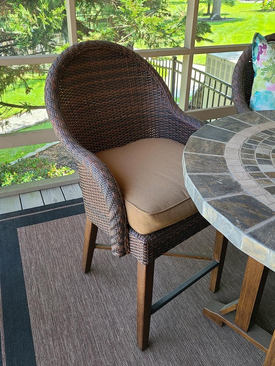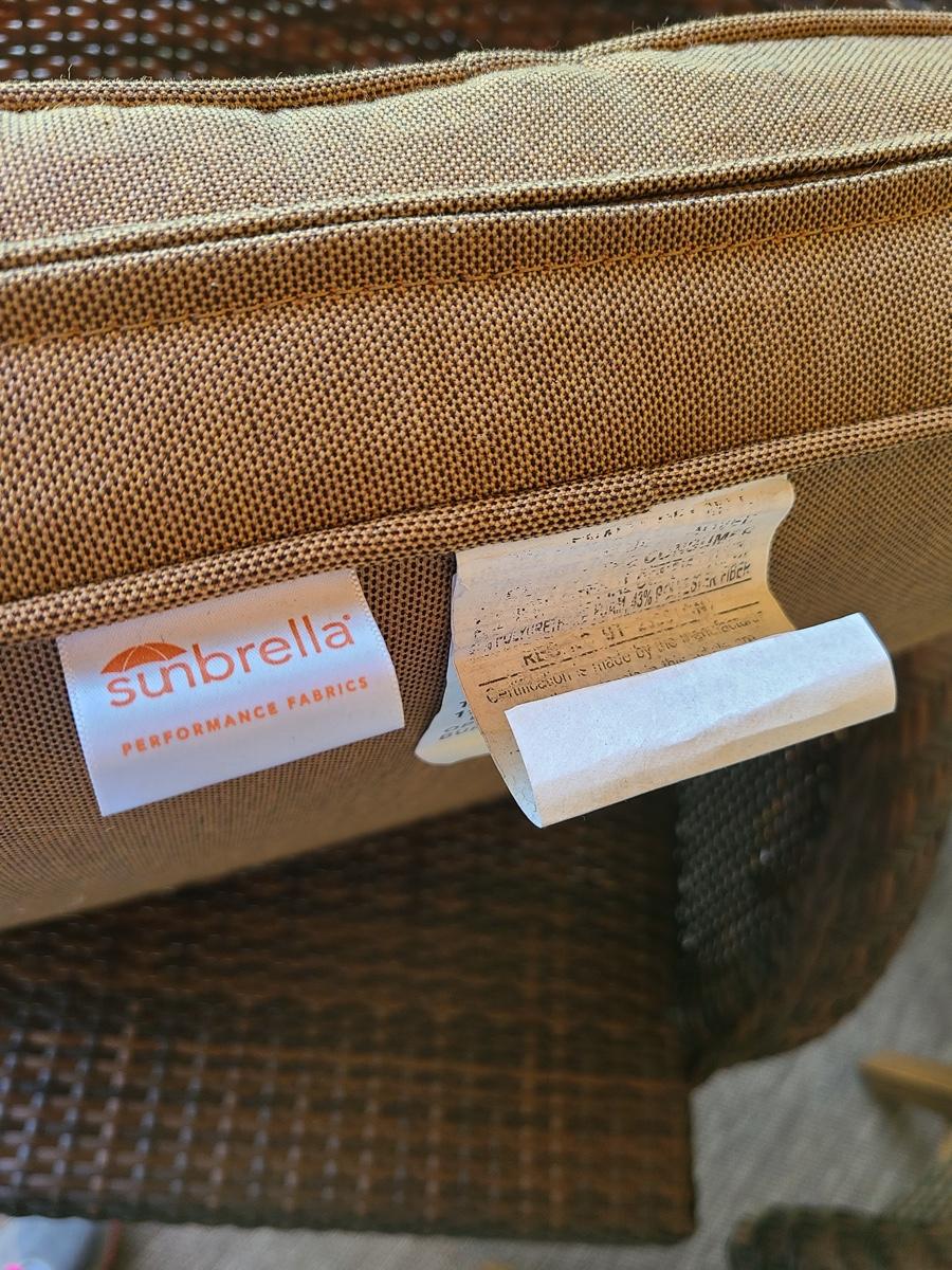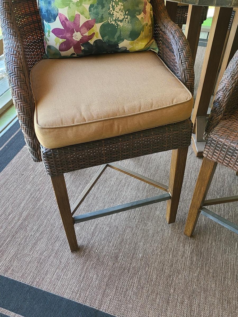 This lovely set still looks new, but it is dusty from being outside. The table is not solid stone, but looks to be a stone overlay from design of the bottom of the table, please see pics. This comes with Sunbrella cushions and two no branded accent pillows with a floral design. Perfect for indoors or out! The outdoor large floor rug is included if you want as well! Does show minor wear from being on porch. Please see all pictures as they are the best representation of the items. The pictures show condition, measurements if taken, and what is included in the lot. Due to the large amount that we photograph and the time frame, we are not always able to take measurements. All items unless noted, are pre-owned and have been used. If you purchased furniture, you must bring help. We do not allow one person to carry large furniture out on their own. Bring help, tools and a truck for the safety of our clients homes, and your personal safety. Company policy. Thank you.