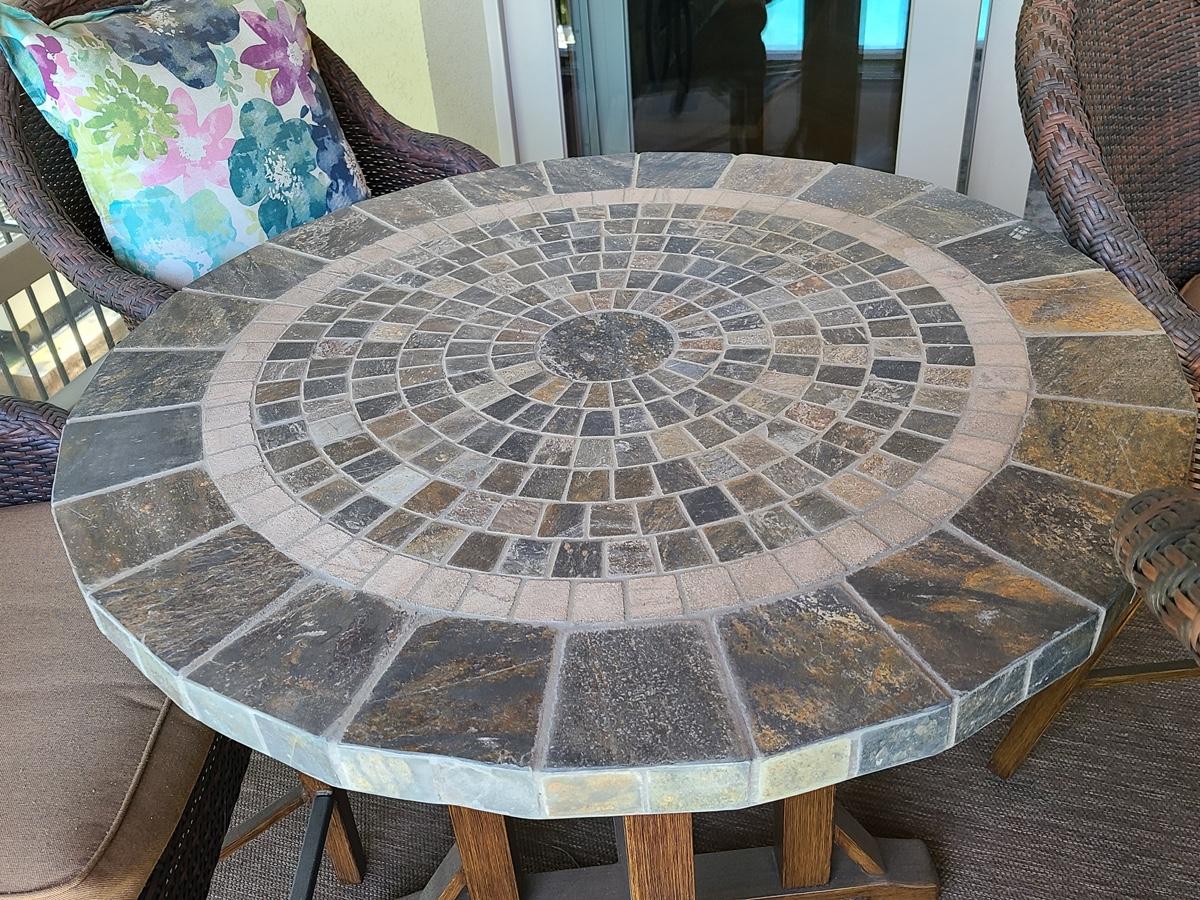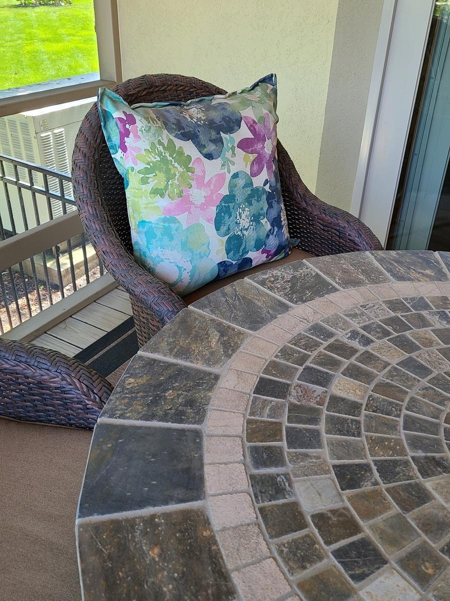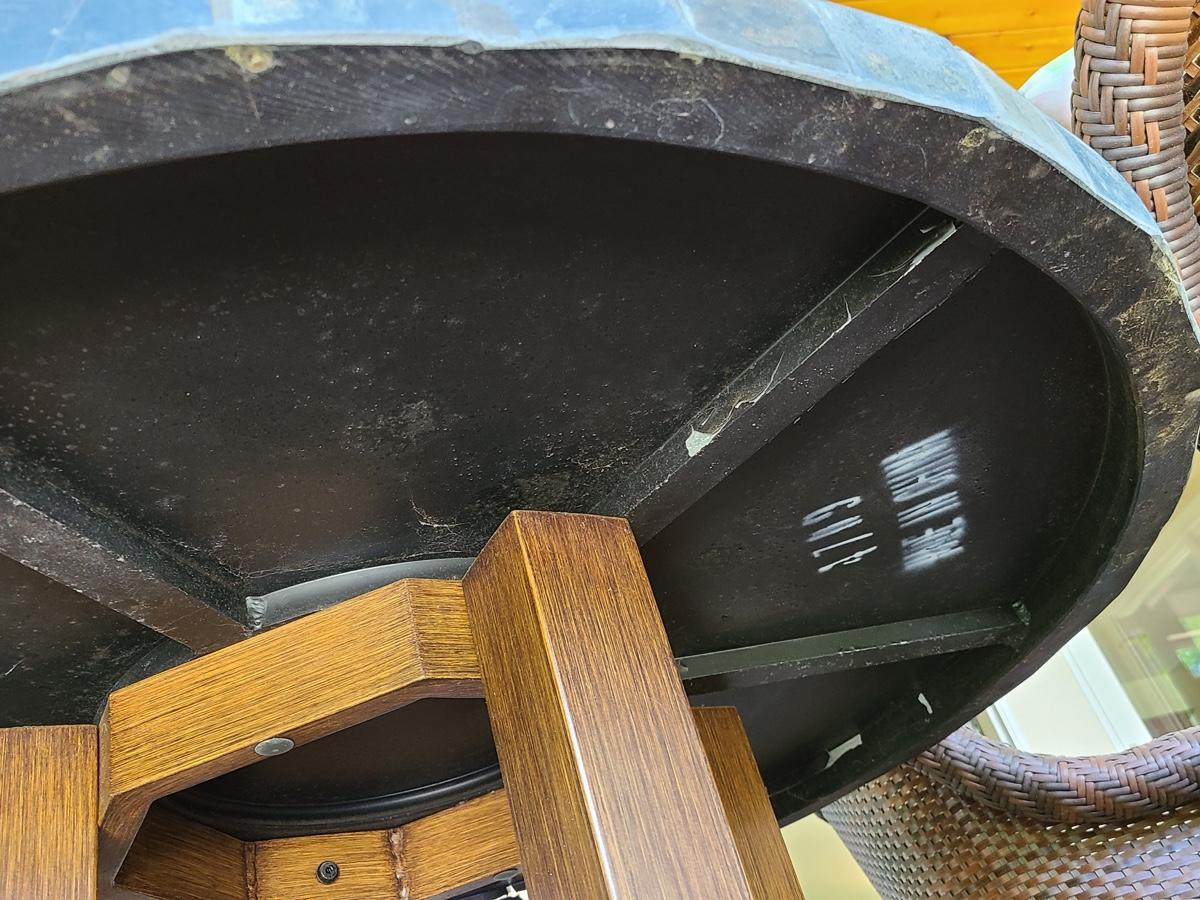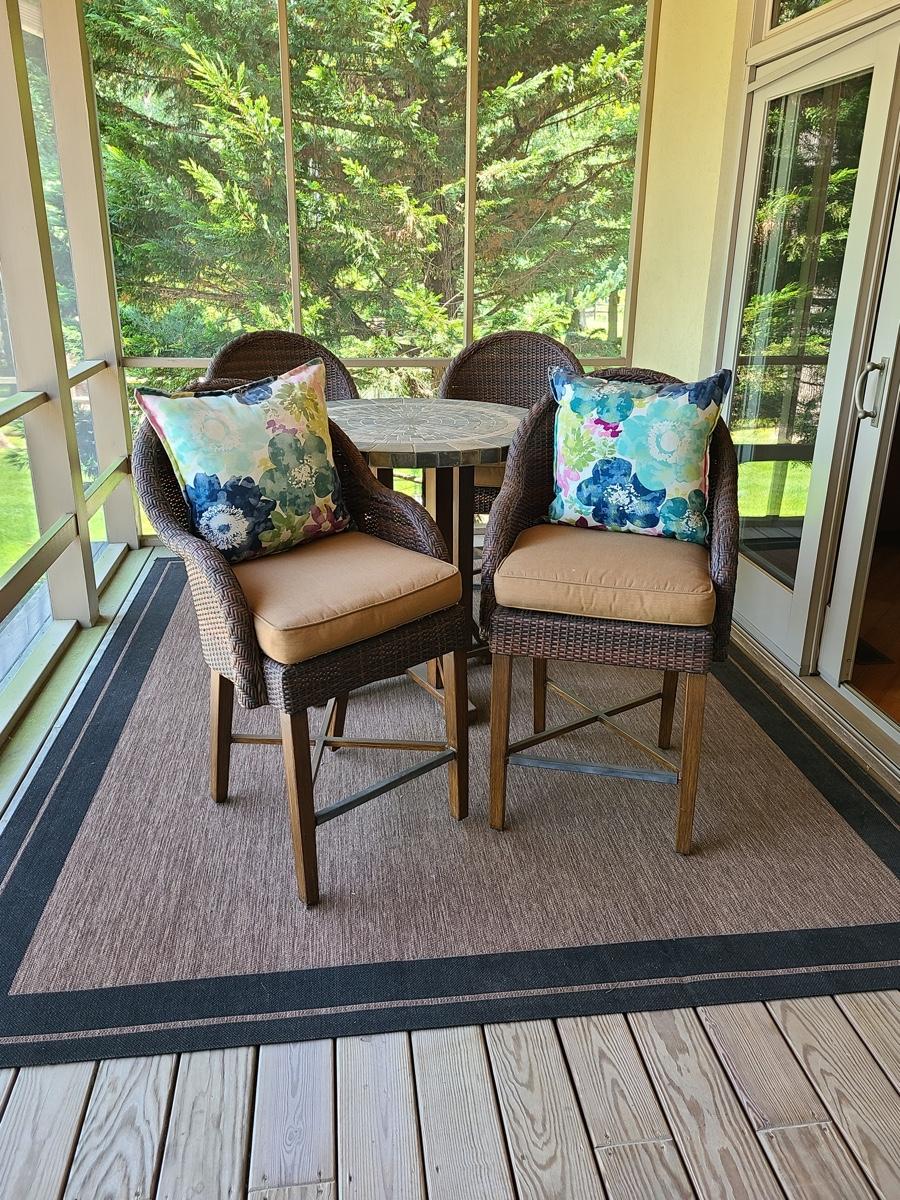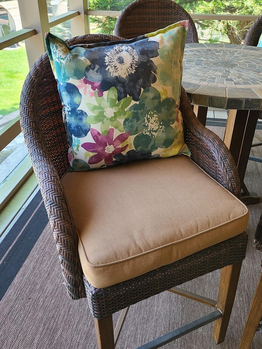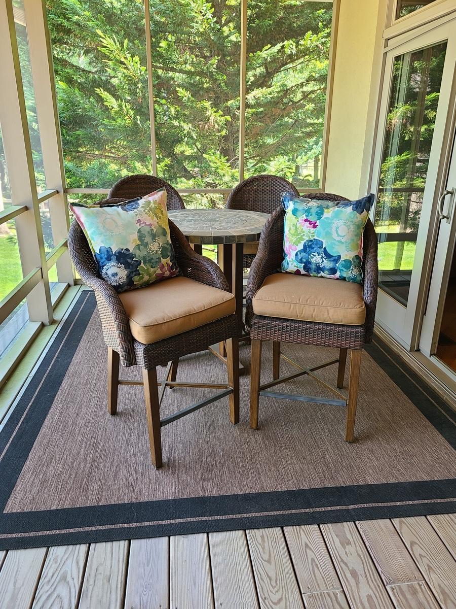 This lovely set still looks new, but it is dusty from being outside. The table is not solid stone, but looks to be a stone overlay from design of the bottom of the table, please see pics. This comes with Sunbrella cushions and two no branded accent pillows with a floral design. Perfect for indoors or out! The outdoor large floor rug is included if you want as well! Does show minor wear from being on porch. Please see all pictures as they are the best representation of the items. The pictures show condition, measurements if taken, and what is included in the lot. Due to the large amount that we photograph and the time frame, we are not always able to take measurements. All items unless noted, are pre-owned and have been used. If you purchased furniture, you must bring help. We do not allow one person to carry large furniture out on their own. Bring help, tools and a truck for the safety of our clients homes, and your personal safety. Company policy. Thank you.