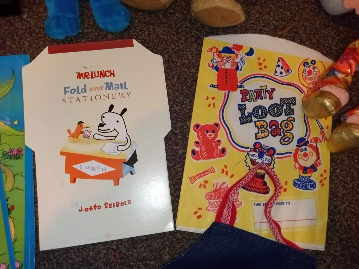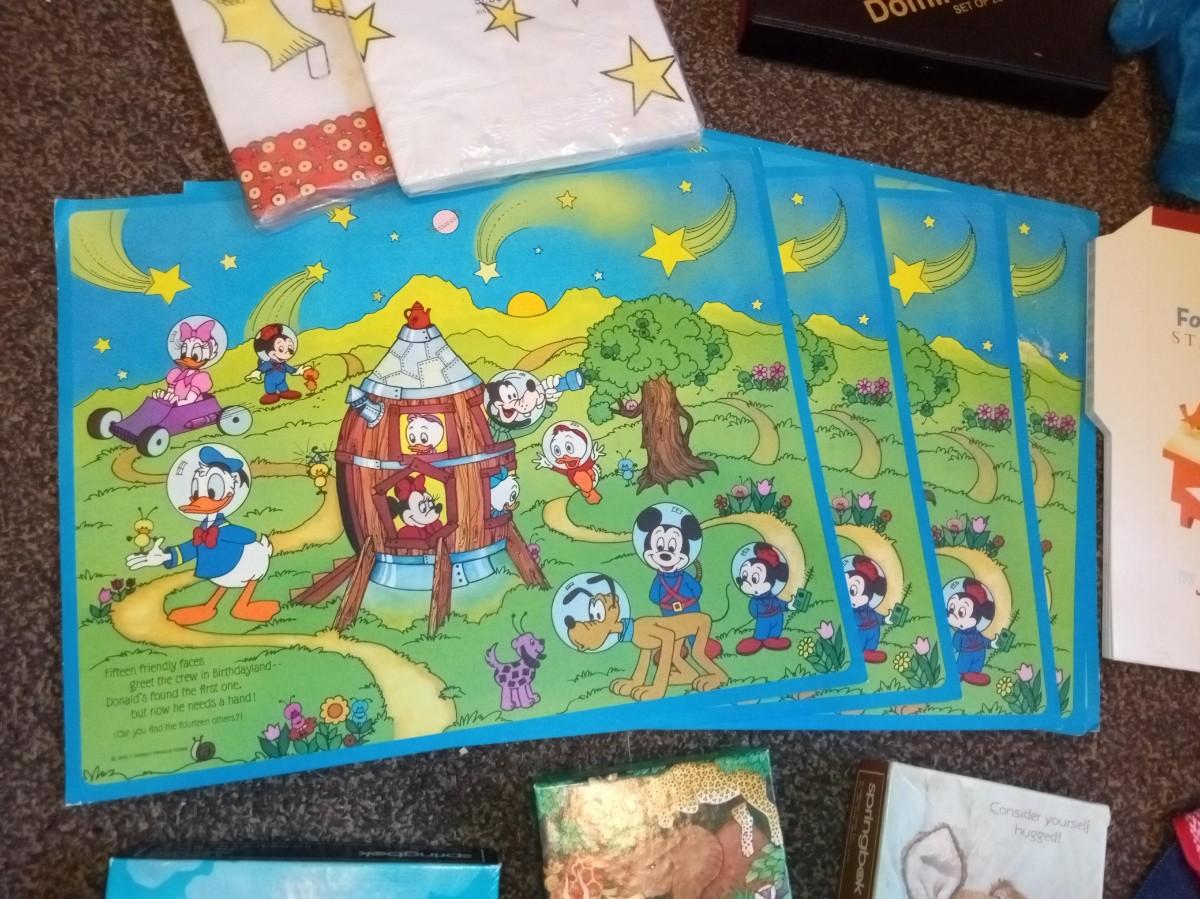 PLUSH TOYS, PAPER PLACEMATS, MICKEY MOUSE AND OTHER PAPER TABLECLOTHS, DENIM APRON, 3 SMALL PUZZLES, FOLD AND MAIL STATIONERY, GAMES AND MORE