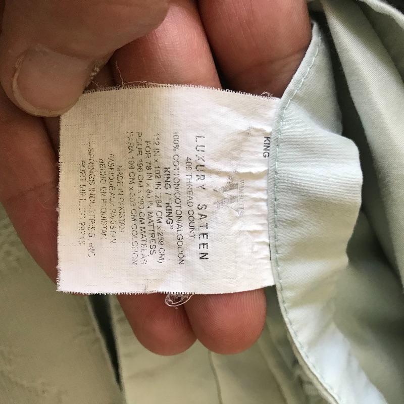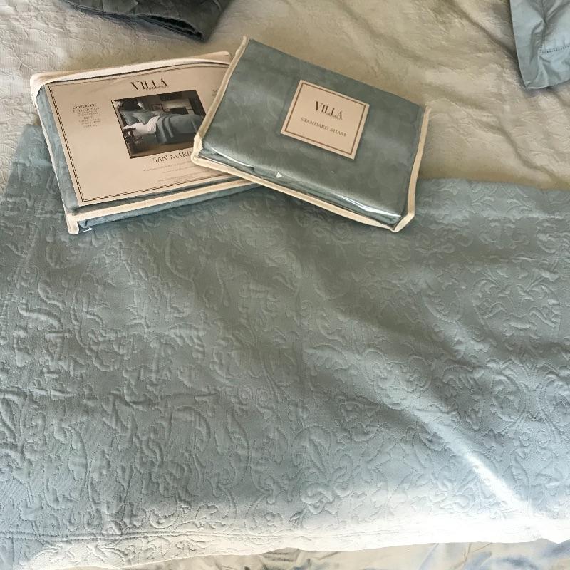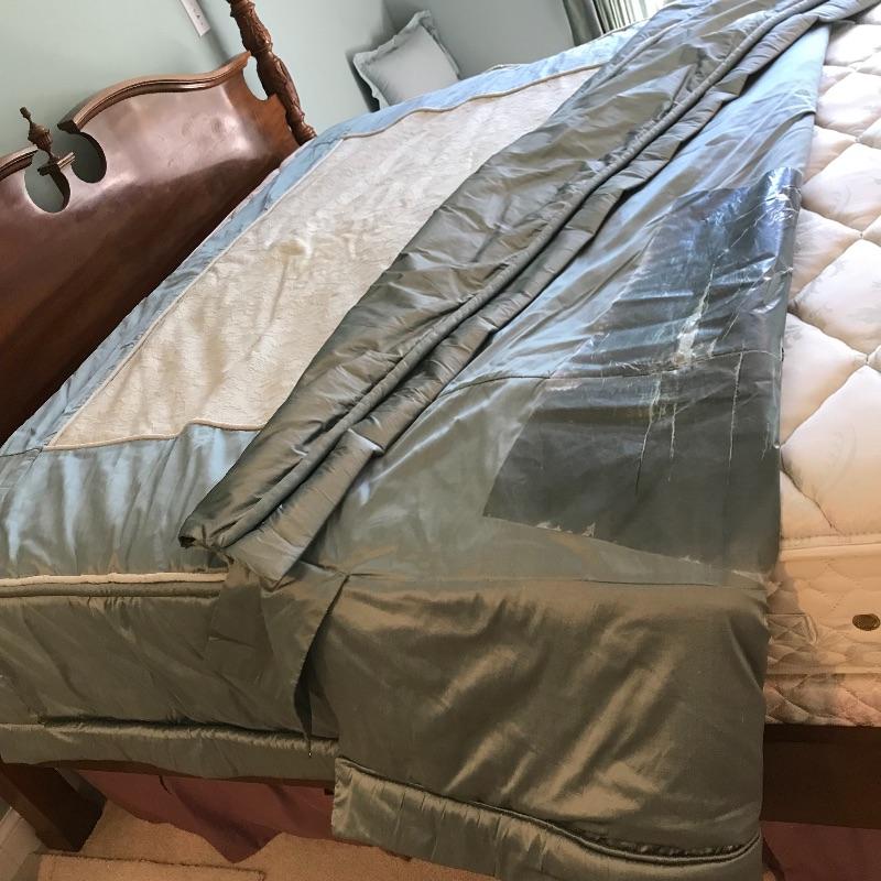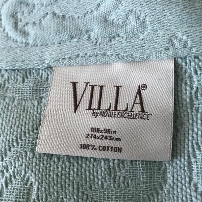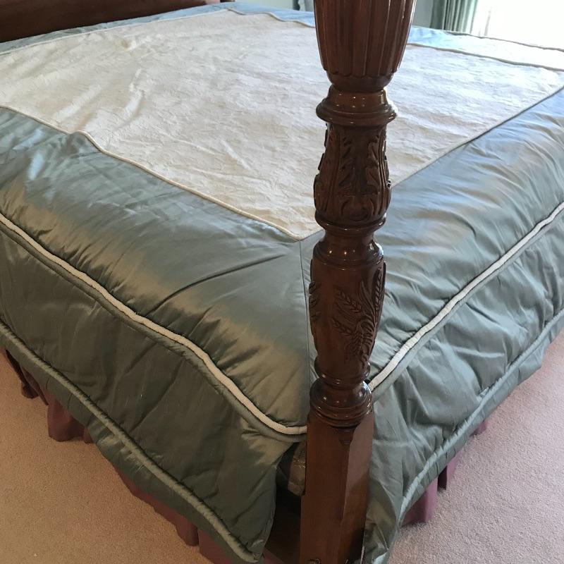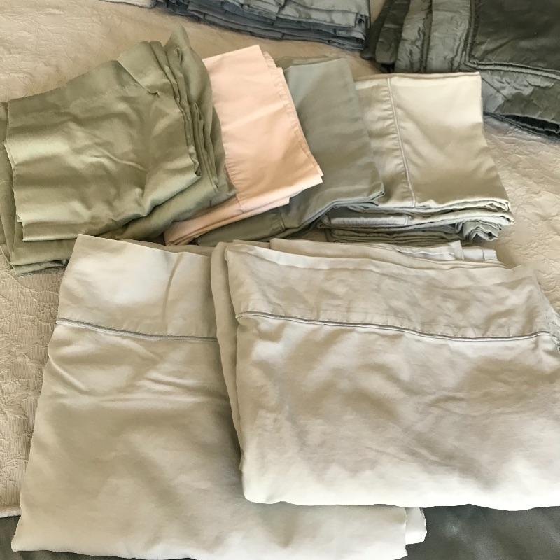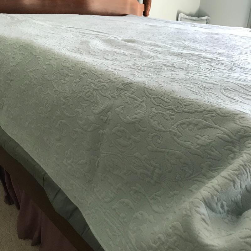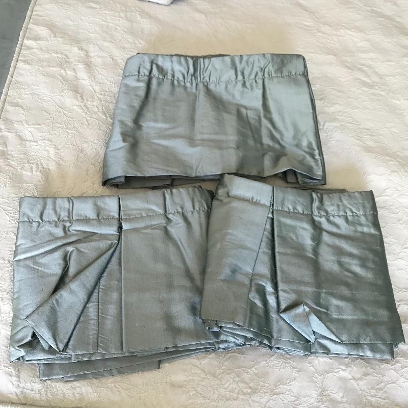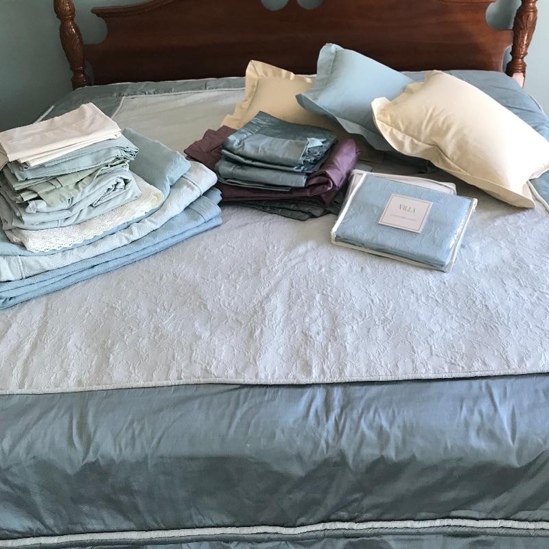 Lovely satin-esque bedroom linens and curtains. There are a couple different color themes in this lot with the same satin and cotton style. Mint green can be found on the bed cover, 400 count king sheets, king pillow shams and curtains. The bed cover has a tear noted in photos that was once repaired with a vinyl type material, but needs to be repaired, see images. There are also mint green bed-skirt curtains to be attached on dowels or curtain rods under the bed on a bed frame. Many Villa products found throughout this lot. The Villa king blanket is more of a baby blue with matching shams still in their package. Three small throw pillows and a Wasmuta decorative top sheet are included! The four post bed is not included but can be found in Lot-346. The four curtains are approximately 87” tall and have widths that measure between 47” and 49”. The wood valences and curtain rods are attached to the walls, please bring various screw drivers to remove. Valence frames are 80” long and valence curtains hang down approximately 14”.